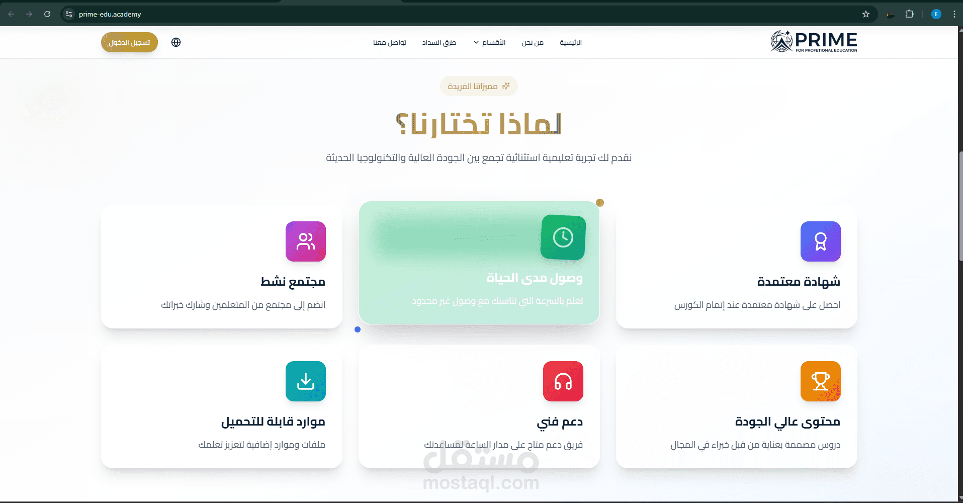 تم تصميم الموقع وفق أفضل ممارسات UI/UX مع استخدام ألوان متناسقة وتخطيط واضح يسهّل عملية التنقل بين الصفحات، مع الاهتمام بعرض المحتوى بطريقة احترافية تساعد المستخدم على الوصول إلى المعلومات بسرعة. كما تم إنشاء قسم خاص بالمميزات يوضح نقاط القوة في المنصة مثل جودة المحتوى، الدعم الفني، سهولة الوصول إلى الدورات، وتوفير تجربة تعليمية متكاملة.