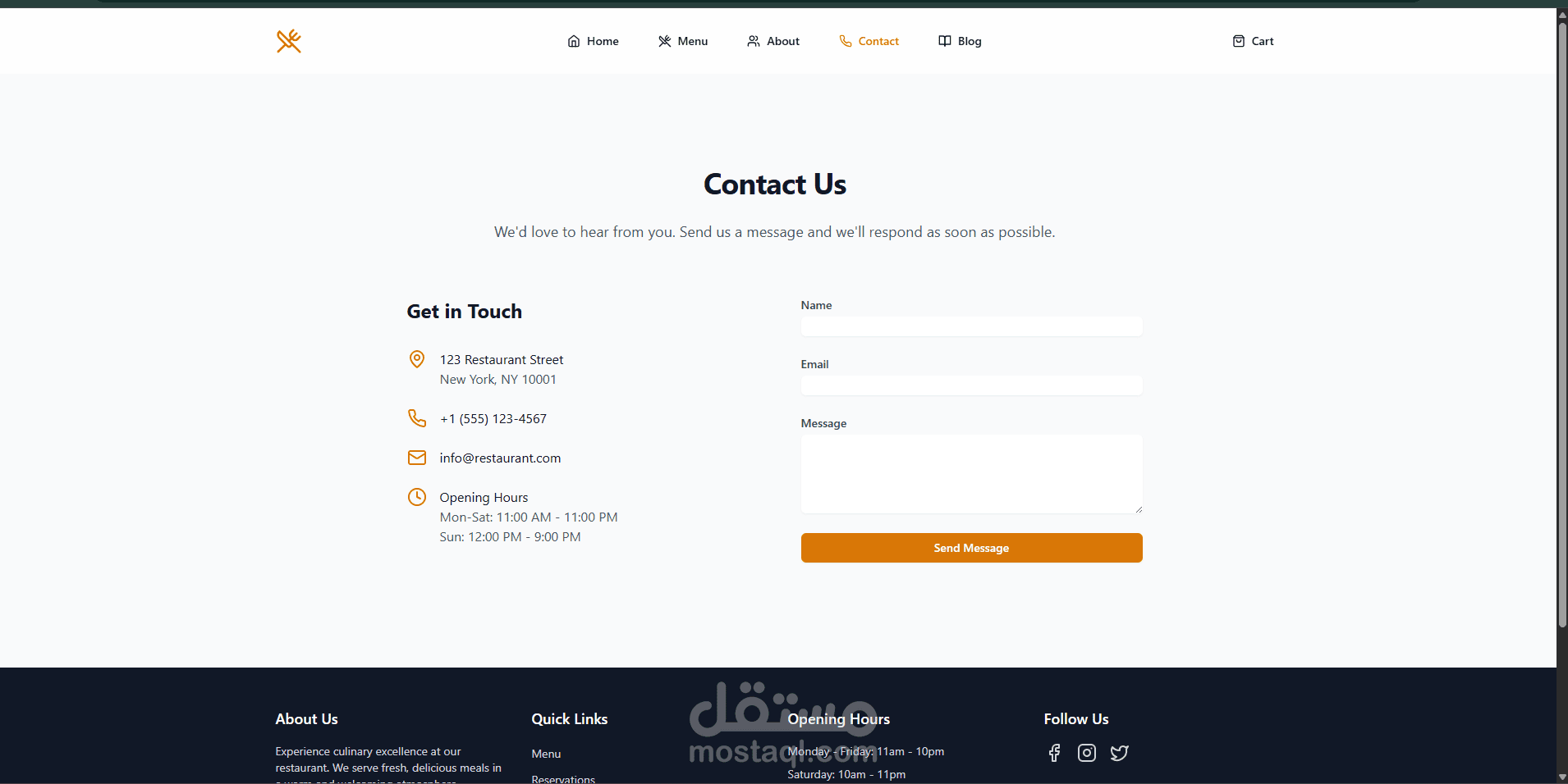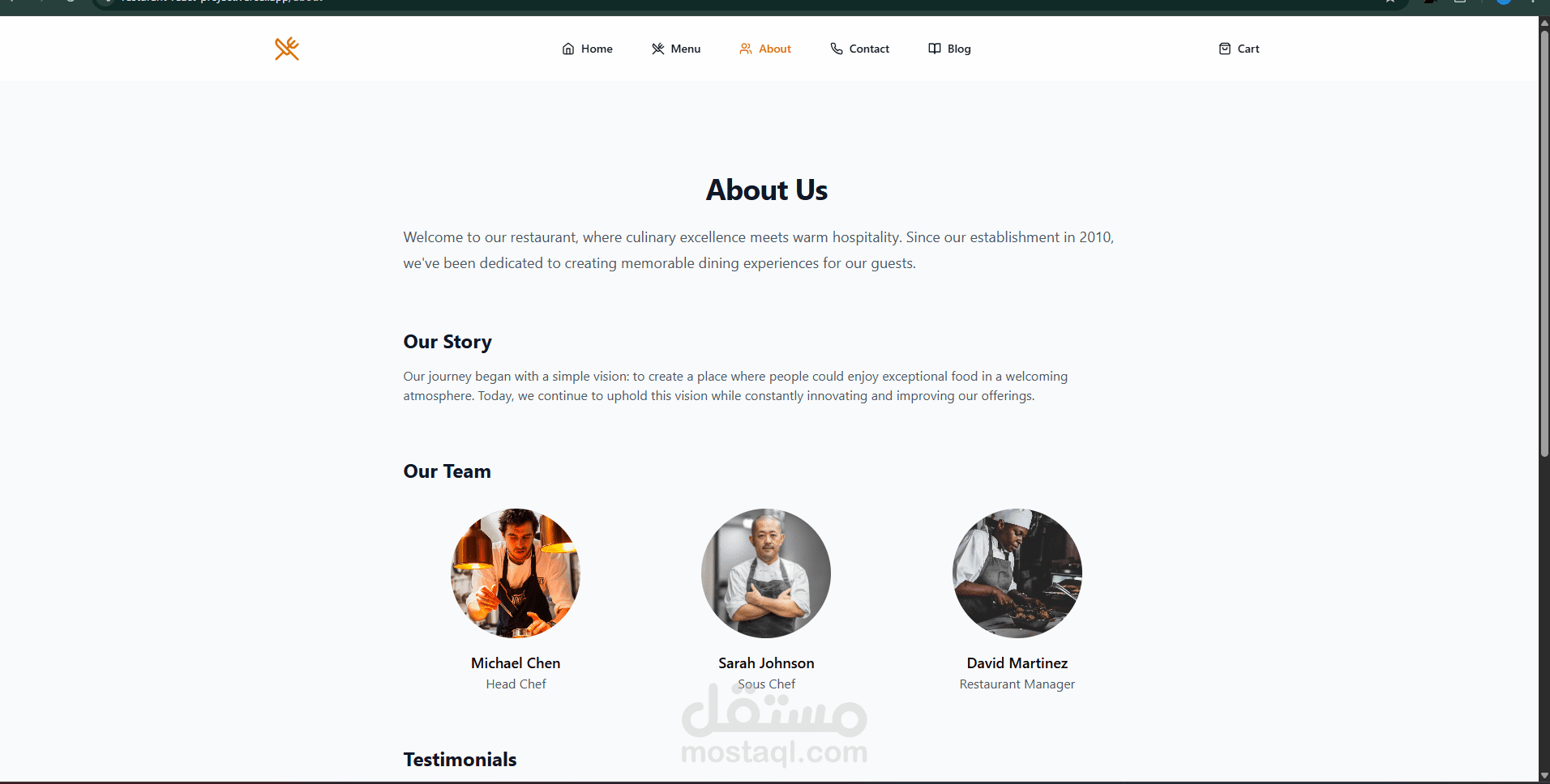 يتضمن الموقع صفحة Menu التي تعرض قائمة الطعام في شكل بطاقات (Cards) تحتوي على صورة الطبق، الوصف، السعر، وإمكانية إضافة المنتج إلى Cart، مما يوفر تجربة مشابهة لمواقع التجارة الإلكترونية. كما يحتوي الموقع على صفحة About لعرض معلومات عن المطعم وفريق العمل وقصته، مما يساعد على بناء الثقة مع العملاء، بالإضافة إلى صفحة Contact التي تتيح للمستخدم إرسال رسالة مباشرة لإدارة المطعم بسهولة.