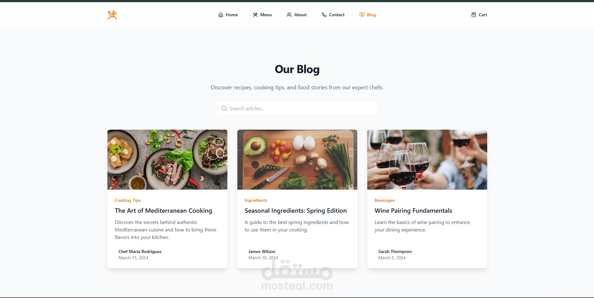 كما يوفر الموقع قسم Blog لمشاركة المقالات المتعلقة بالطعام والوصفات والنصائح، مما يساعد في تحسين ظهور الموقع في محركات البحث (SEO) وزيادة التفاعل مع المستخدمين. تم الاهتمام بتصميم UI/UX بشكل احترافي من خلال اختيار ألوان متناسقة وتخطيط واضح يسهل التنقل بين الصفحات، مع إبراز العناصر المهمة مثل الأزرار والصور بطريقة جذابة.
