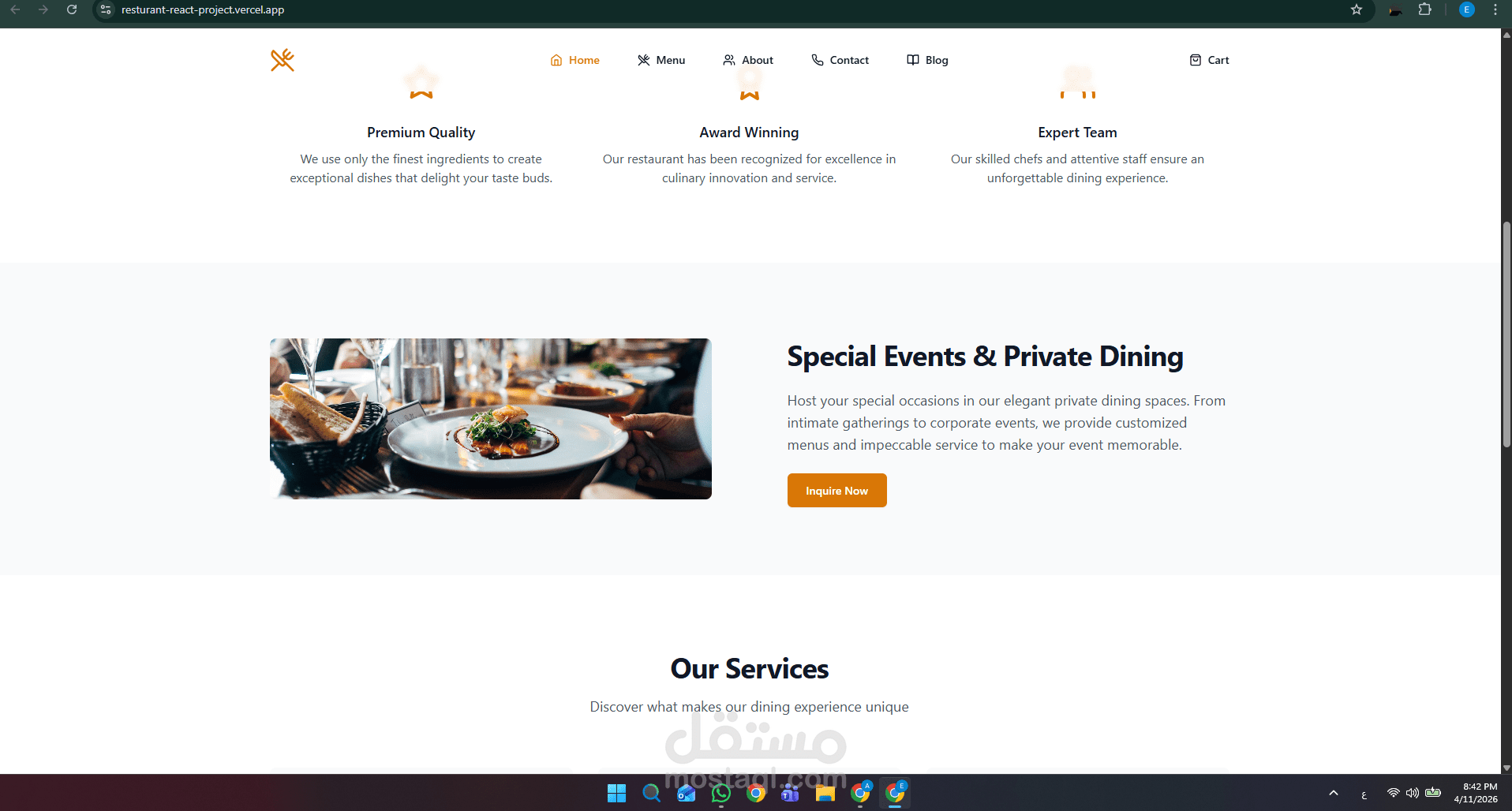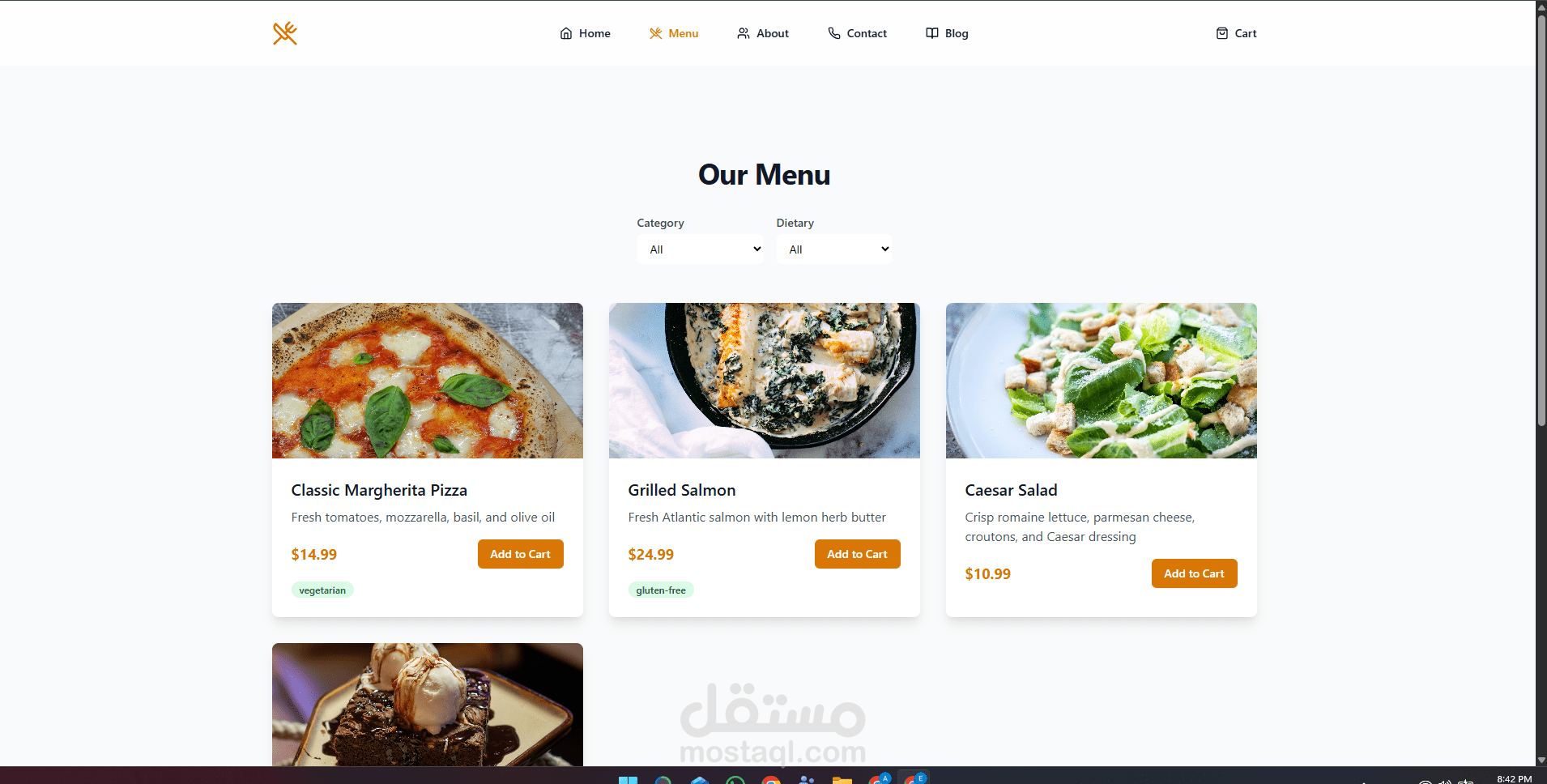 Restaurant Website – Modern Food Ordering Platform هو موقع احترافي لمطعم يهدف إلى عرض قائمة الطعام بطريقة جذابة وسهلة الاستخدام، مع توفير تجربة تصفح مميزة تمكّن المستخدمين من استكشاف الأطباق، معرفة تفاصيلها، وإضافتها إلى سلة المشتريات بكل سهولة. تم تصميم الموقع بواجهة عصرية تركز على إبراز جودة الأطعمة والصور بشكل جذاب، مما يساعد في تحسين تجربة المستخدم وزيادة التفاعل مع الموقع.