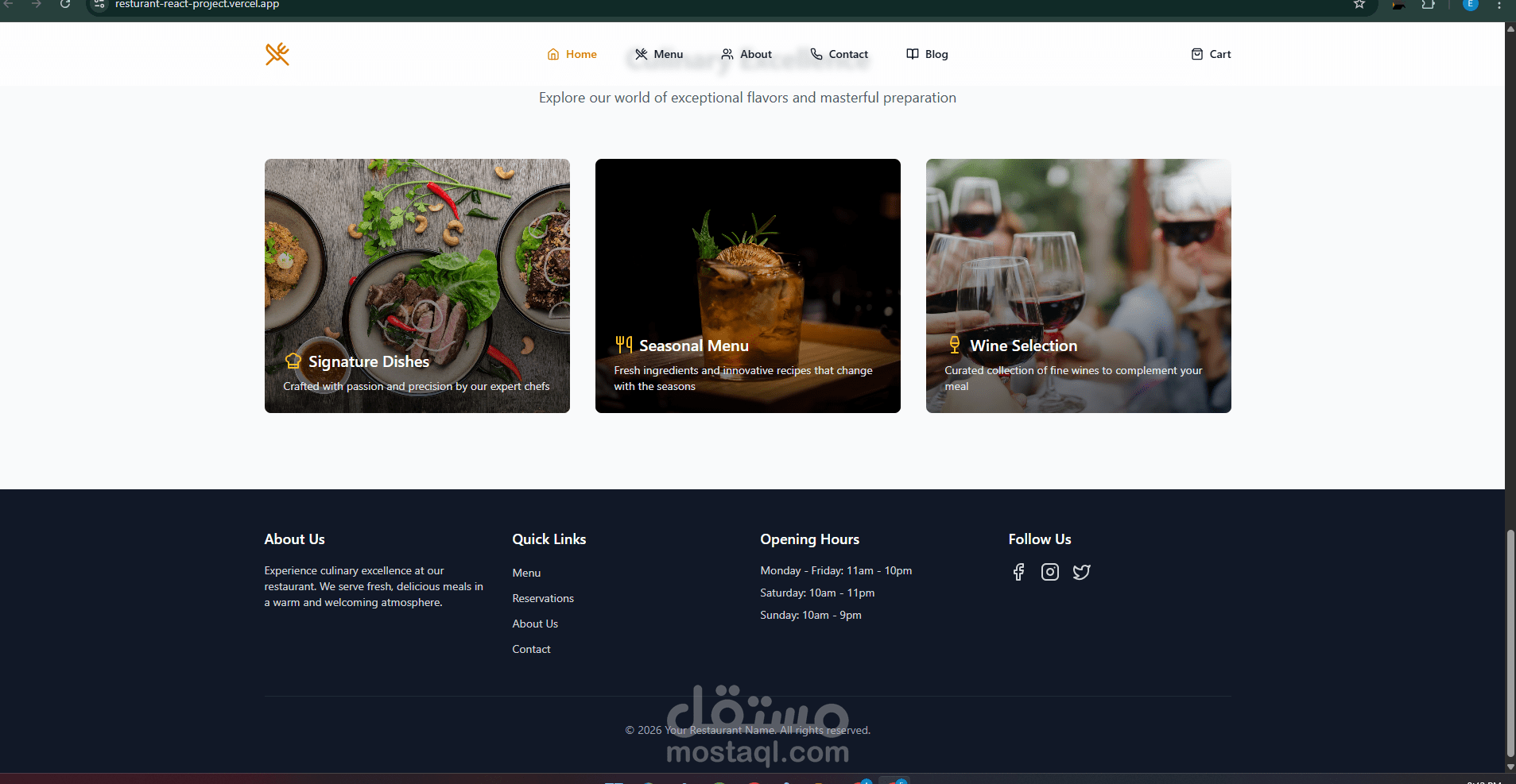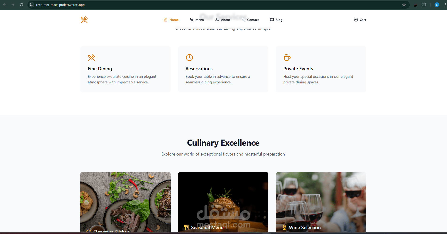 تم تطوير المشروع باستخدام React.js لبناء واجهة تفاعلية سريعة وسلسة، مع تصميم Responsive يضمن عمل الموقع بكفاءة على جميع الأجهزة سواء الموبايل أو التابلت أو سطح المكتب. يحتوي الموقع على صفحة رئيسية تعرض أهم أقسام المطعم مثل الأطباق المميزة (Signature Dishes) والقائمة الموسمية (Seasonal Menu) بالإضافة إلى قسم خاص بالمشروبات (Wine Selection)، مما يساعد المستخدم على تصفح المحتوى بسهولة.