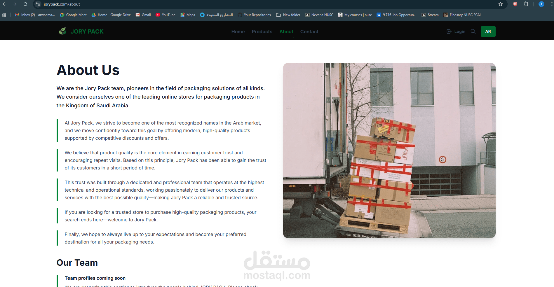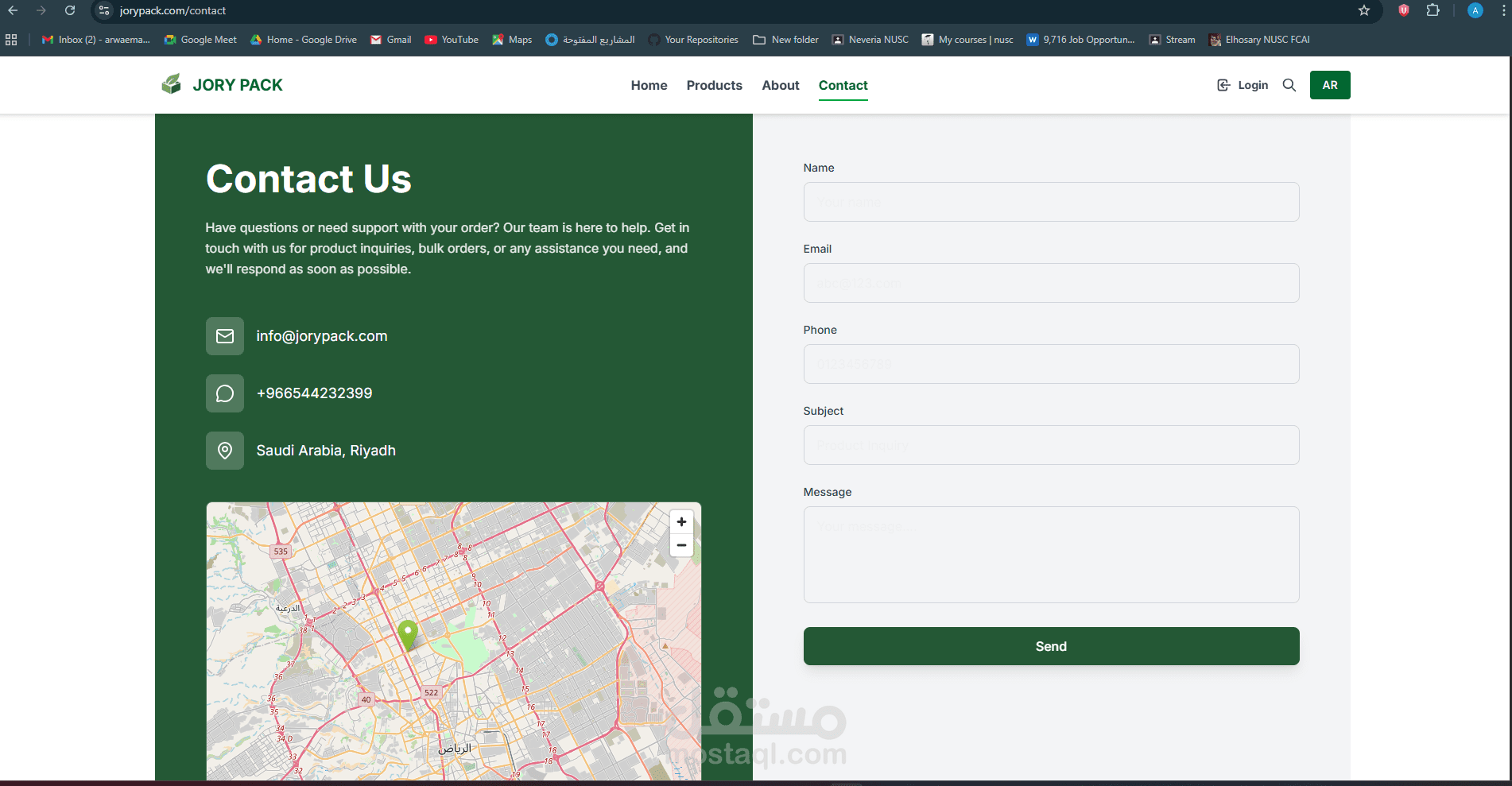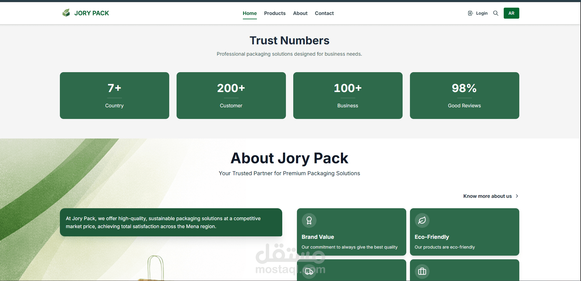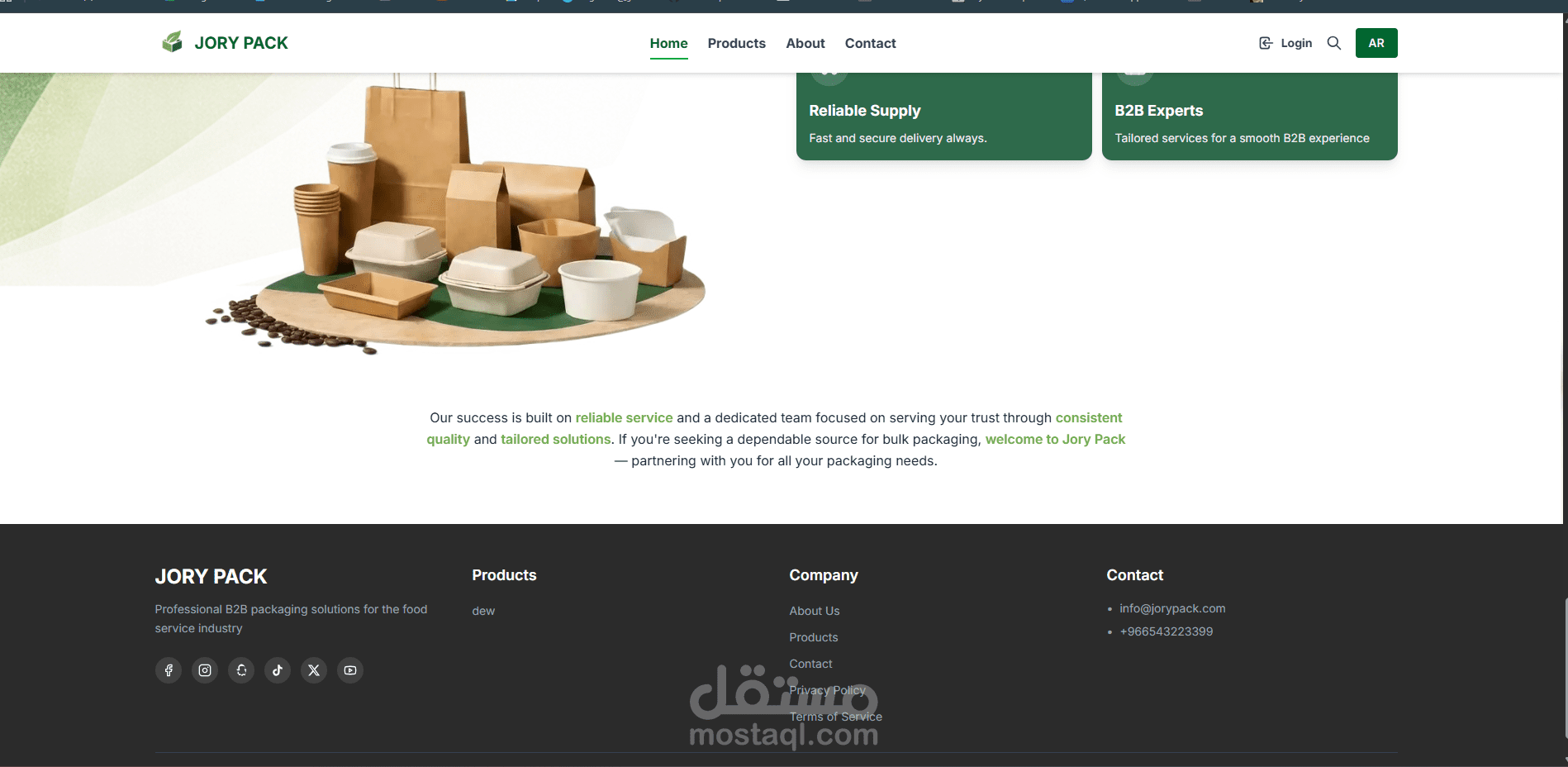 يوفر الموقع صفحات أساسية مثل Home لعرض أهم المنتجات والمميزات، وصفحة Products التي تعرض منتجات التغليف مثل الأكواب الورقية، علب الطعام، الأكياس، ومواد التغليف الصديقة للبيئة، بالإضافة إلى صفحة About التي توضح رؤية الشركة وأهدافها في تقديم منتجات عالية الجودة، وصفحة Contact التي تتيح للمستخدم التواصل بسهولة مع الشركة من خلال نموذج تواصل متكامل مع خريطة توضح موقع الشركة.