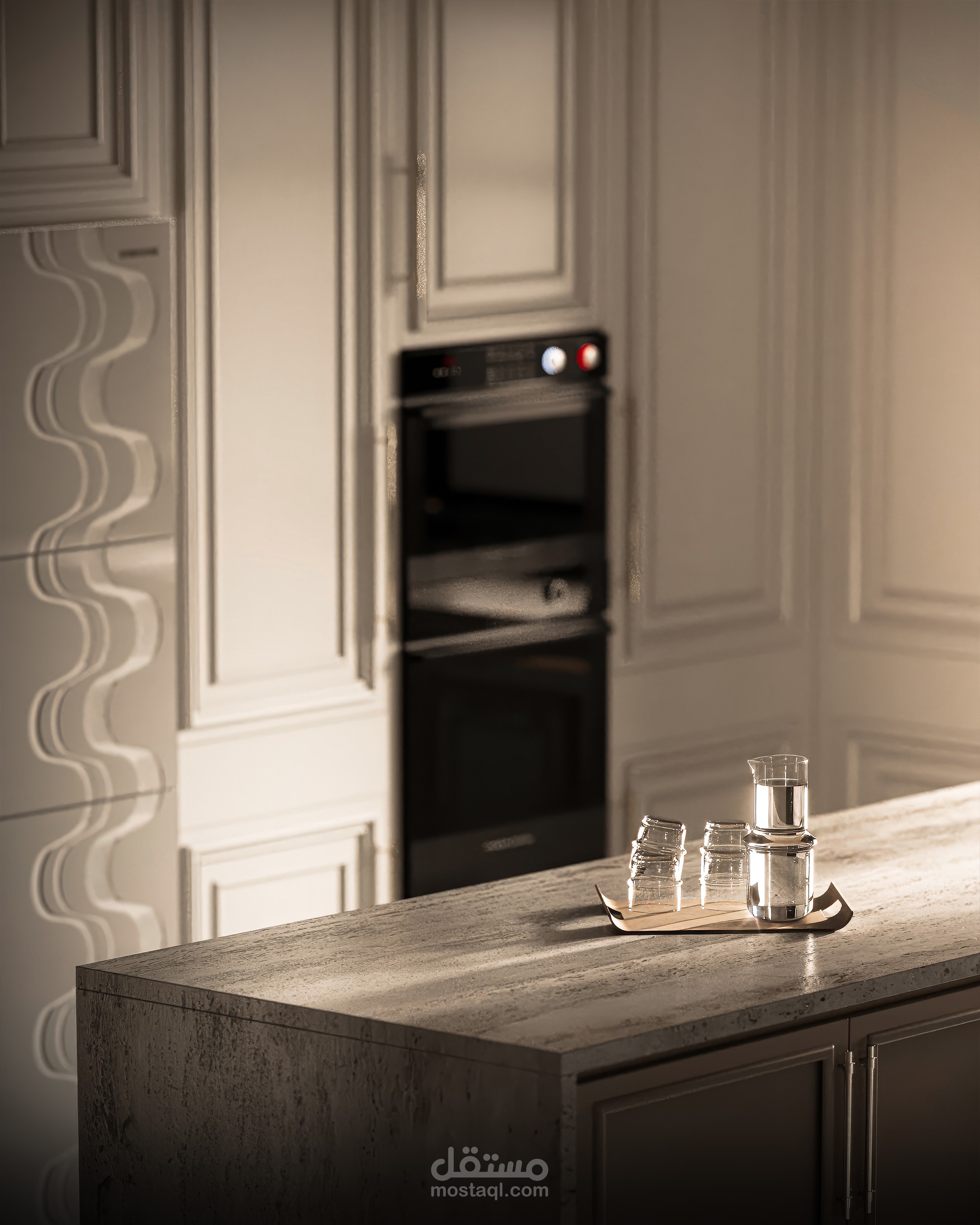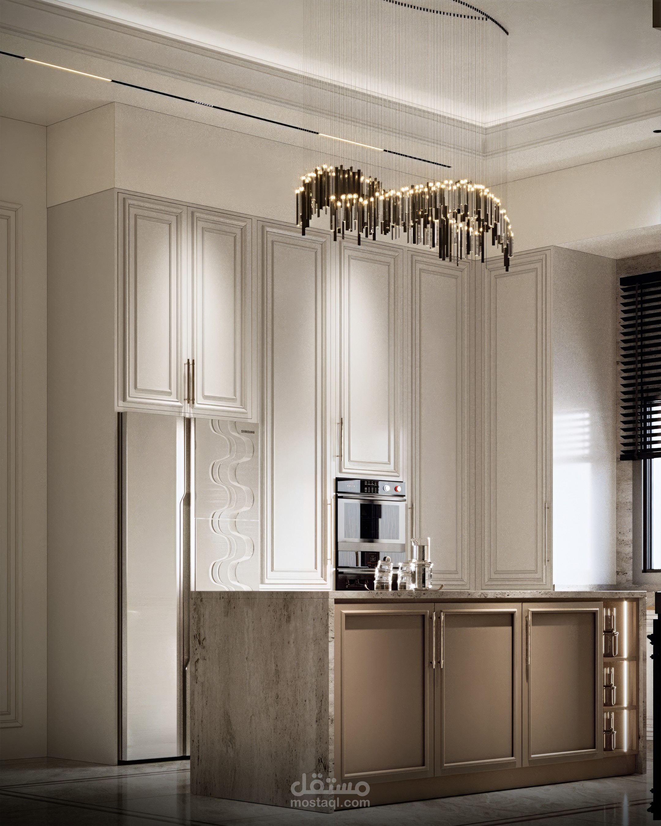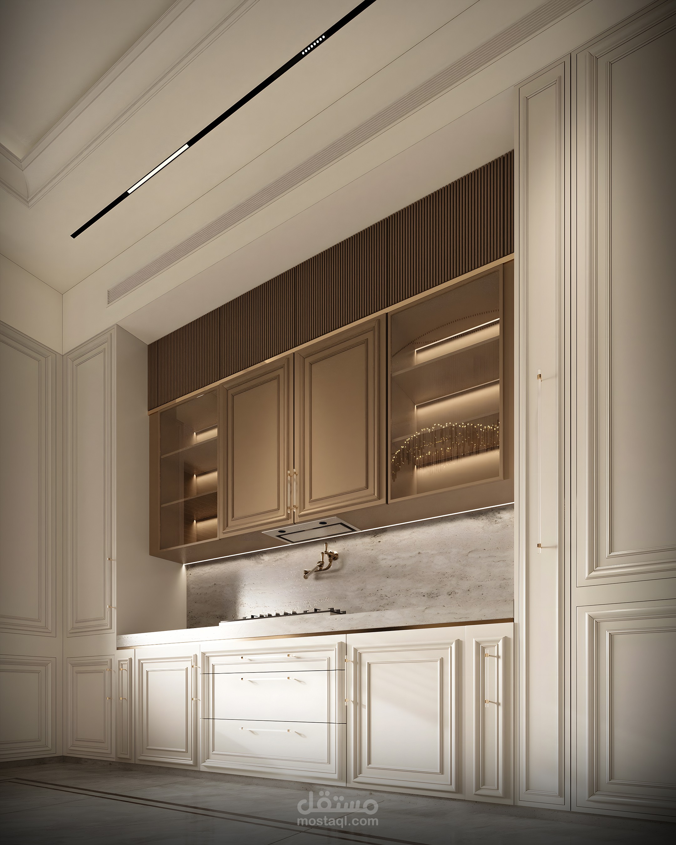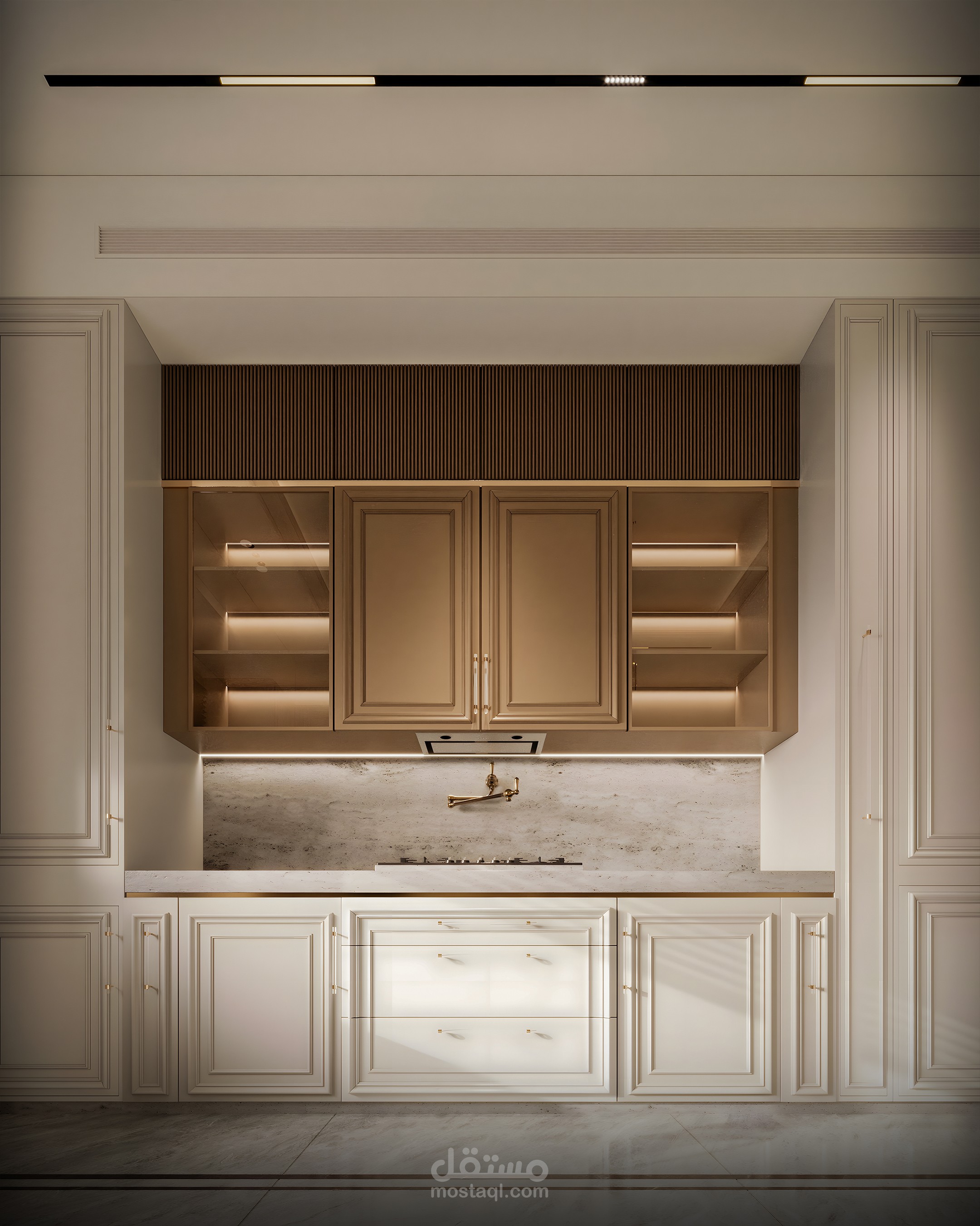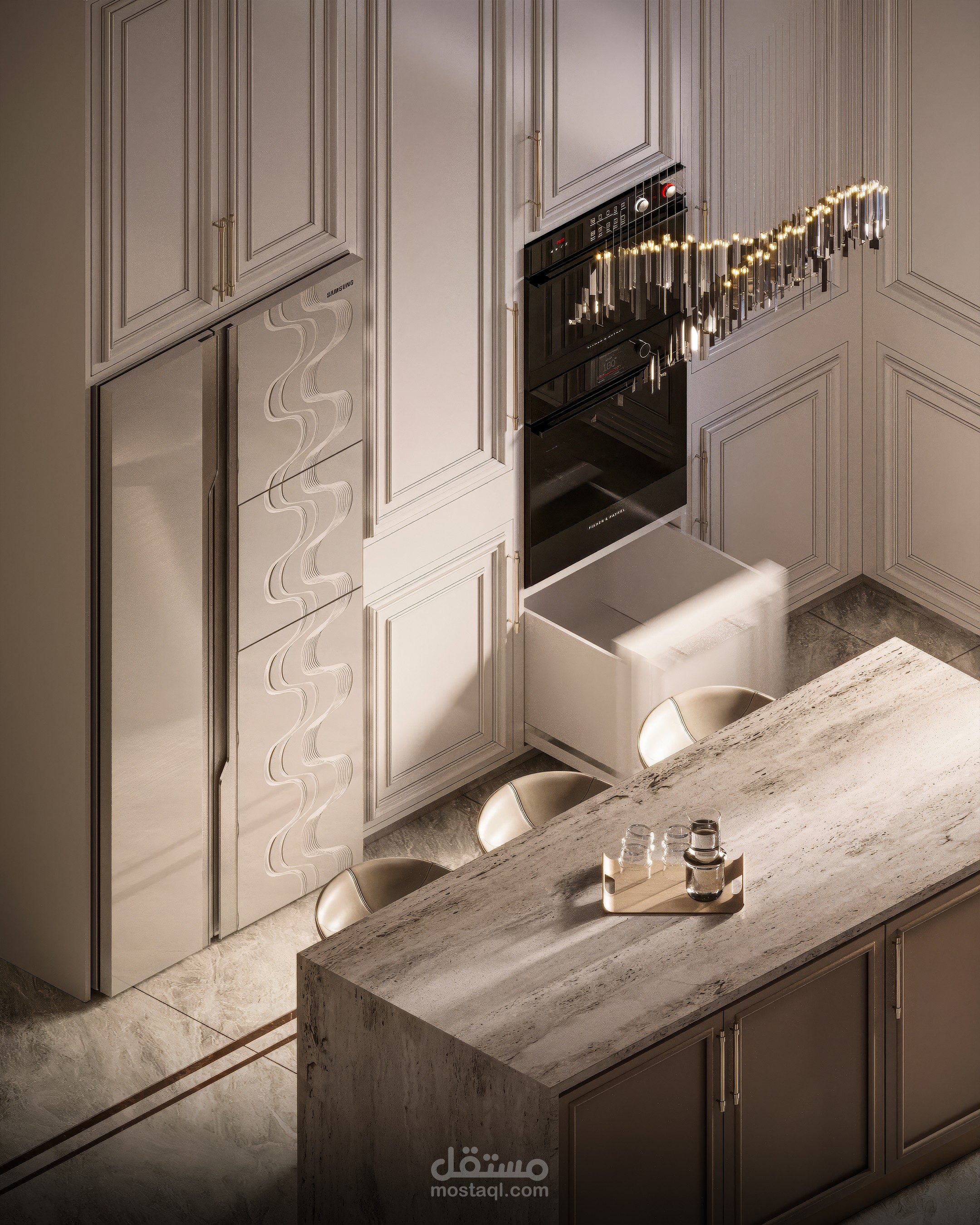 يقدّم هذا المشروع تصورًا راقيًا للتصميم الداخلي الكلاسيكي لمساحة سكنية، حيث يحتل المطبخ الفاخر قلب التصميم ومحوره الأساسي. يرتكز المفهوم على تحقيق التوازن المثالي من خلال التناظر الدقيق، والنسب الأنيقة، والتفاصيل الخالدة المستوحاة من الطراز الأوروبي الكلاسيكي.