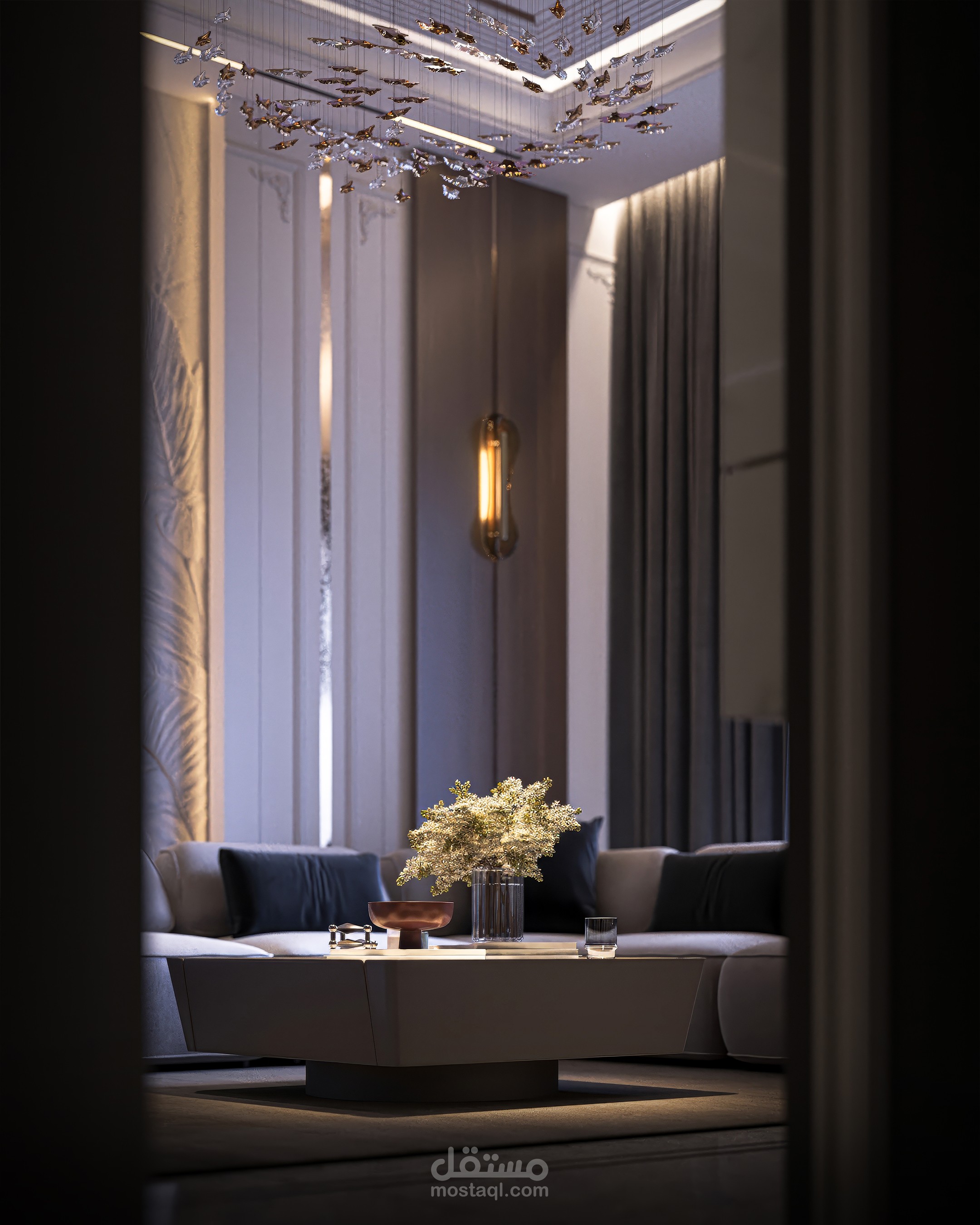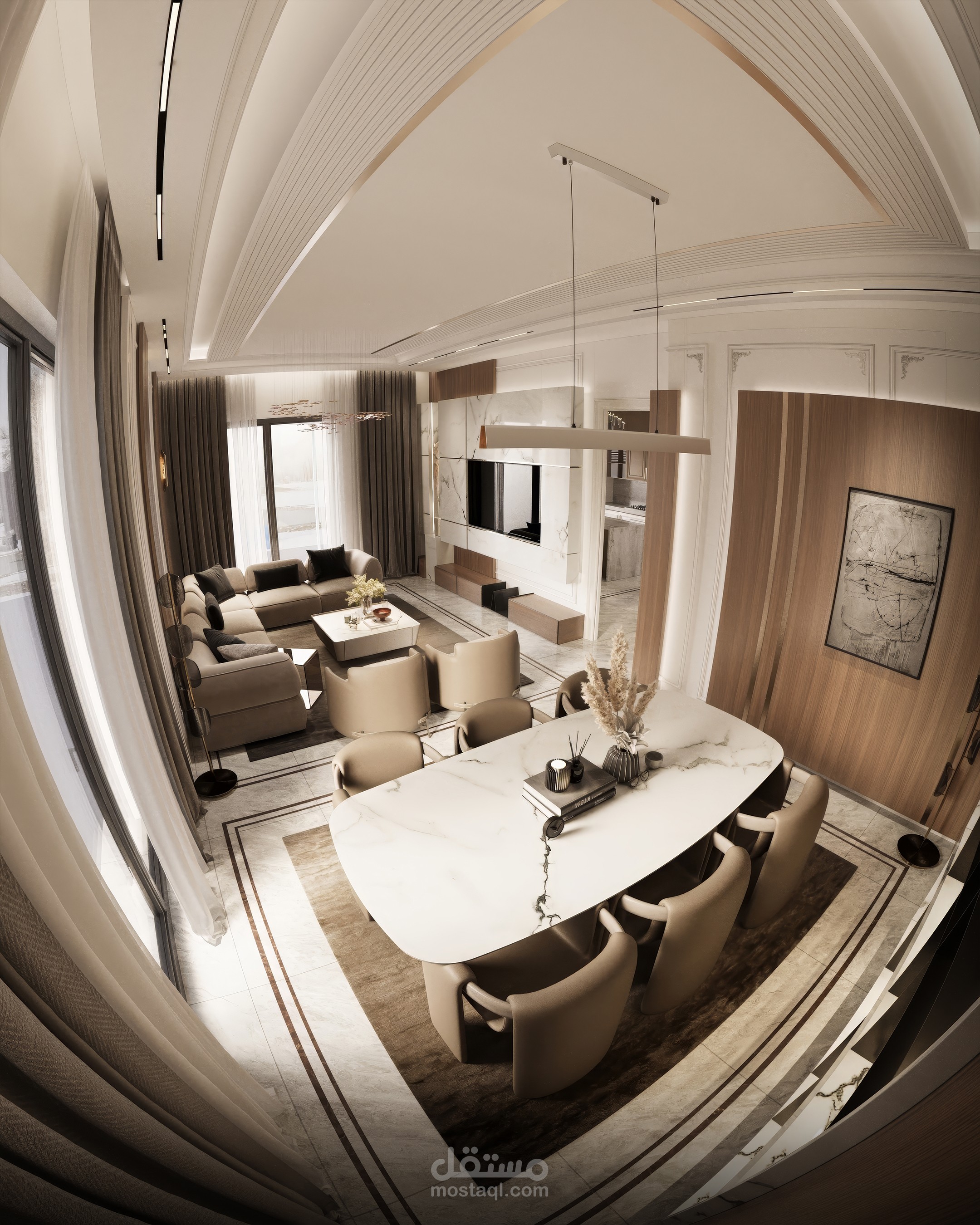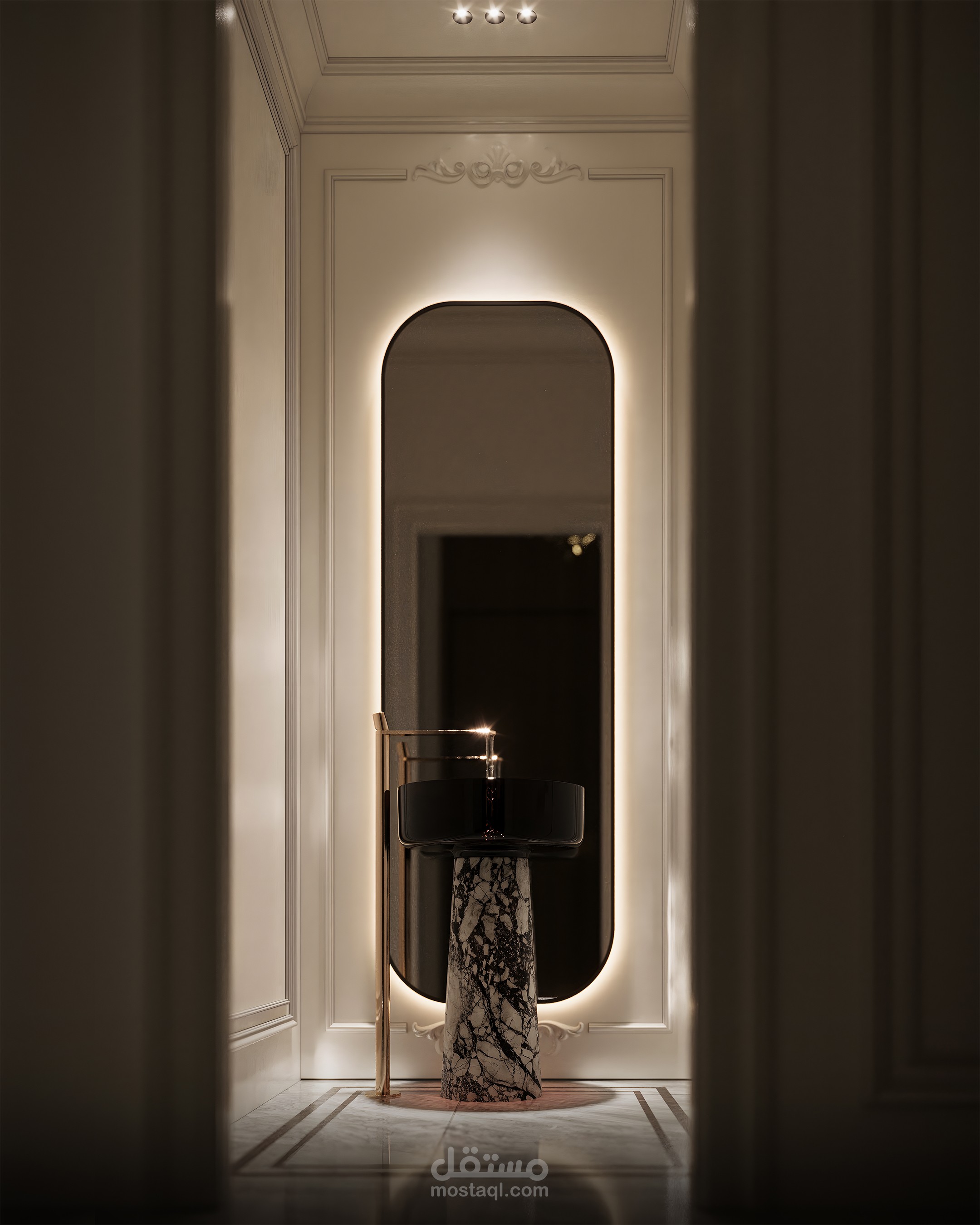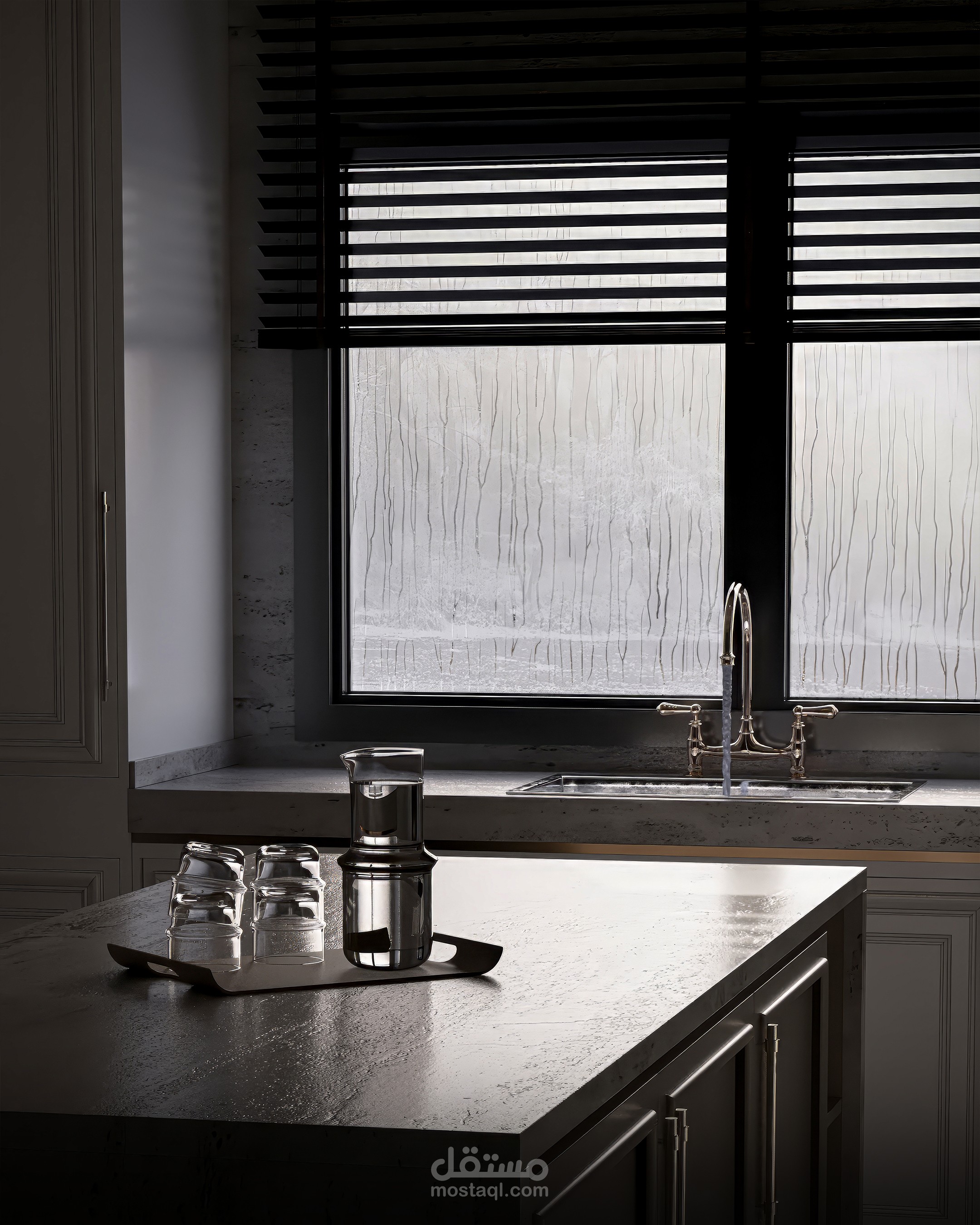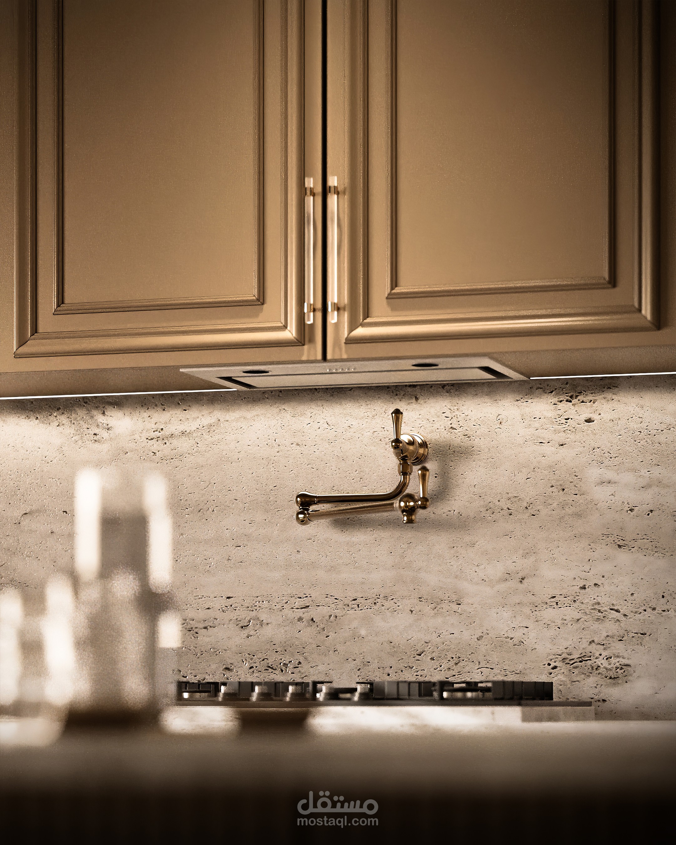 يقدّم هذا المشروع تصورًا راقيًا للتصميم الداخلي الكلاسيكي لمساحة سكنية، حيث يحتل المطبخ الفاخر قلب التصميم ومحوره الأساسي. يرتكز المفهوم على تحقيق التوازن المثالي من خلال التناظر الدقيق، والنسب الأنيقة، والتفاصيل الخالدة المستوحاة من الطراز الأوروبي الكلاسيكي.
