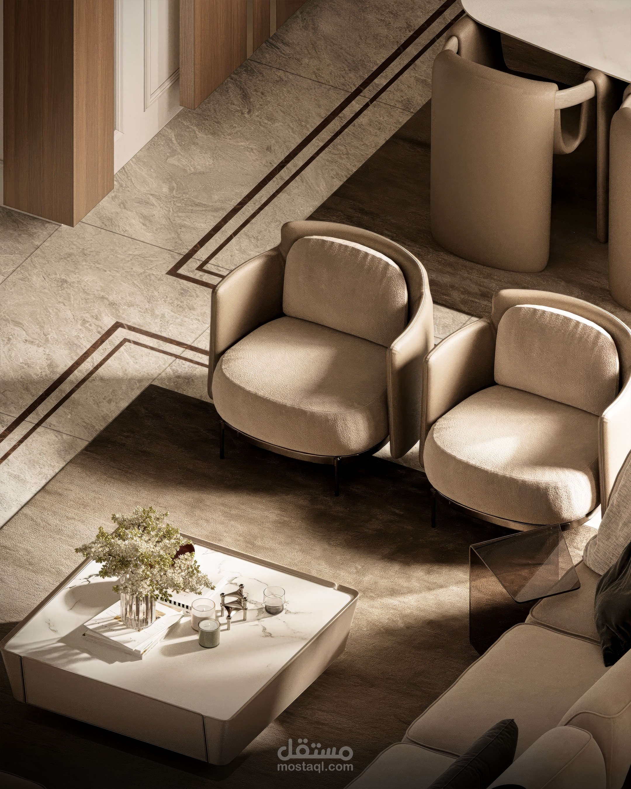 أما بقية المساحات السكنية، فقد صُممت بعناية لتتناغم مع روح المطبخ، مع الحفاظ على وحدة الأسلوب من خلال العناصر الزخرفية، ولوحة الألوان، وتوزيع الإضاءة، مما يخلق تجربة معيشية متكاملة تنبض بالتوازن والرقي.