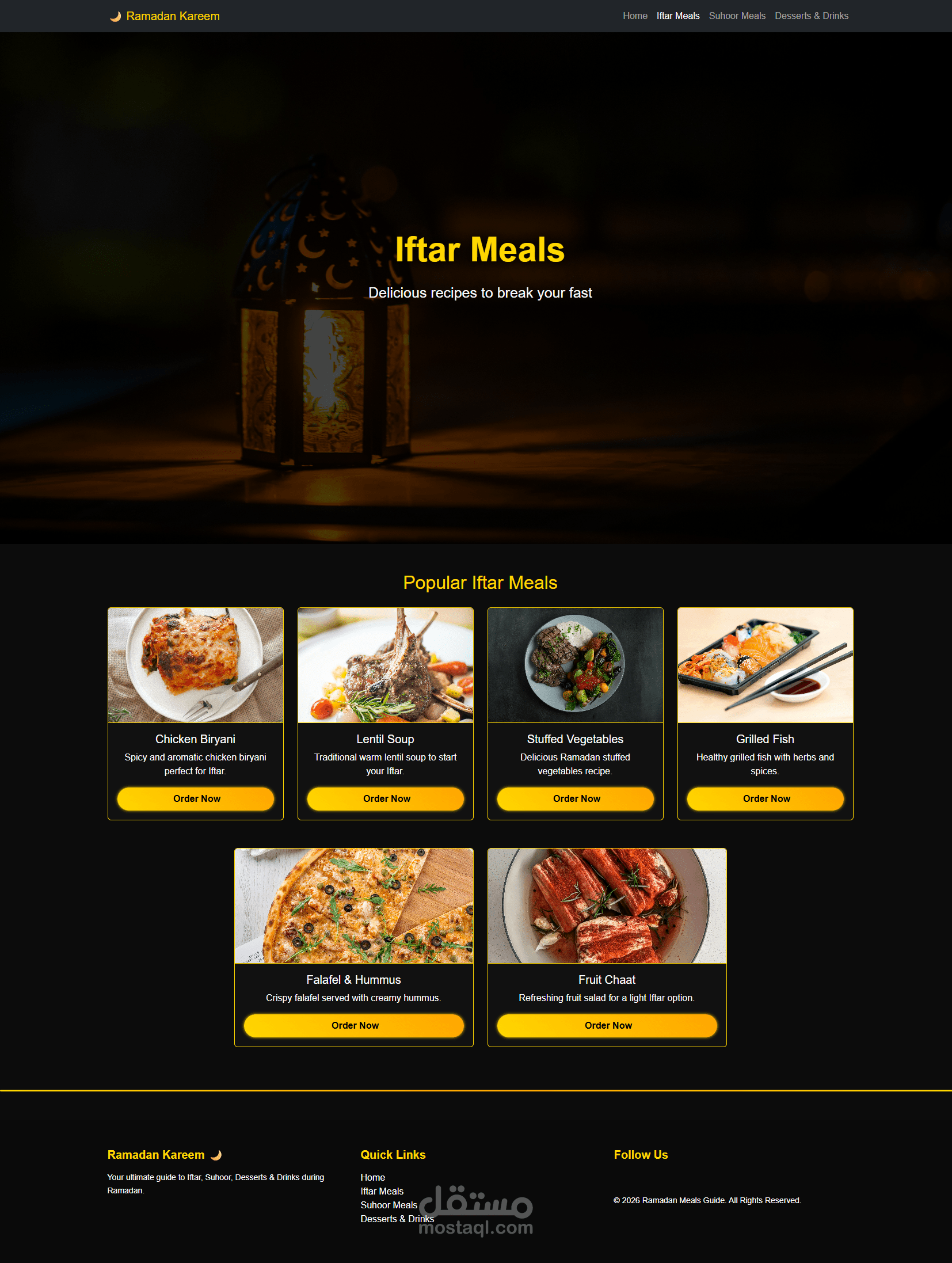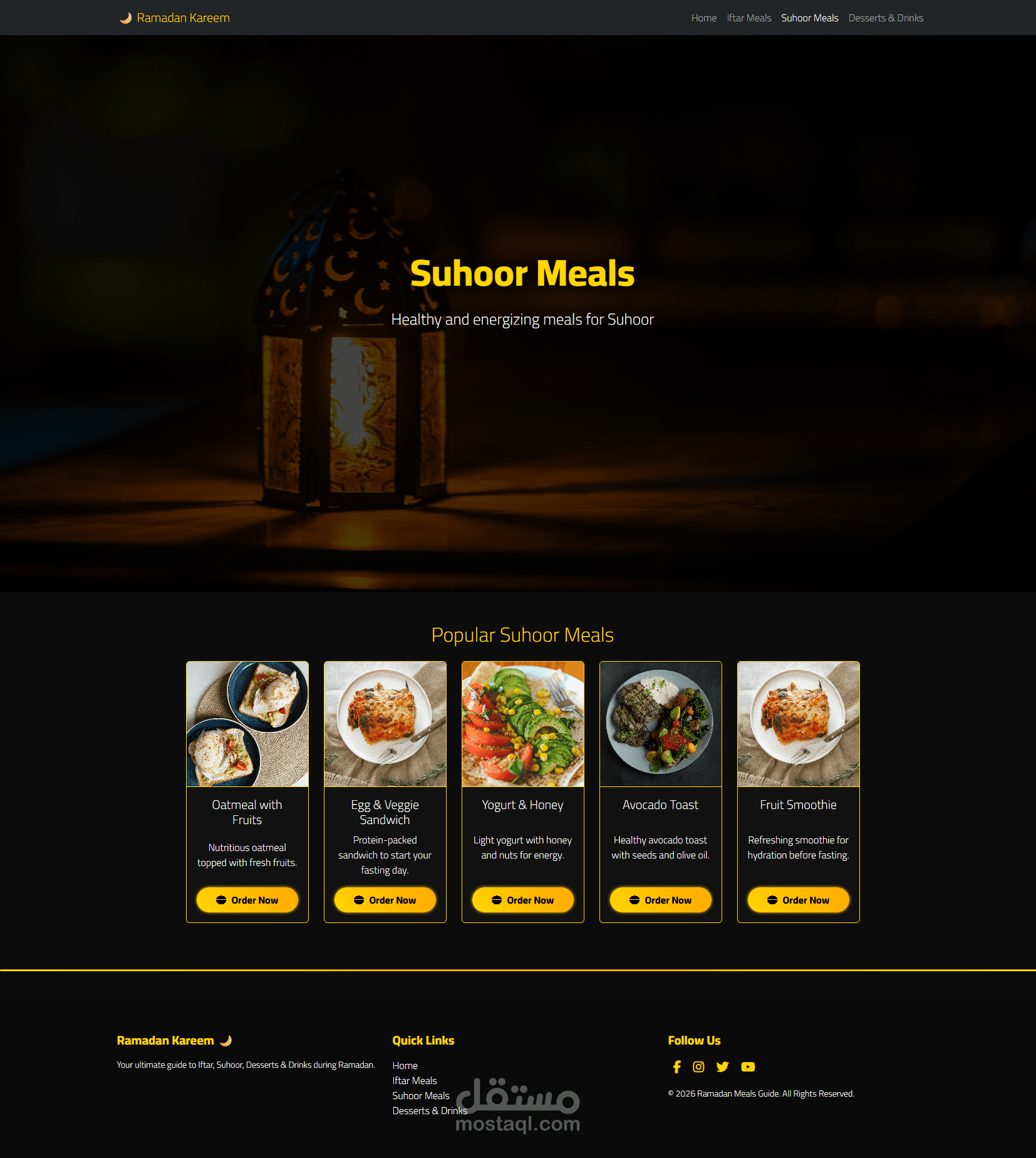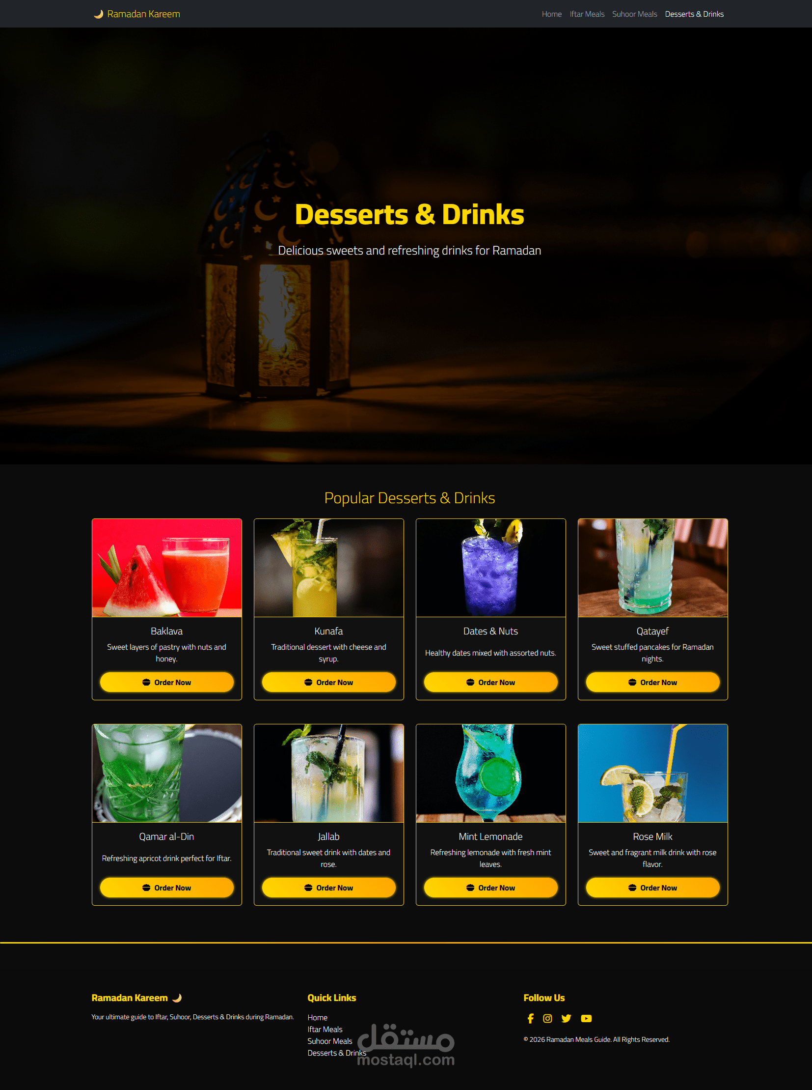 قمت بتصميم وتطوير صفحة ويب تفاعلية خاصة بشهر رمضان، تعرض أقسام الأطعمة والمشروبات بشكل منظم وجذاب.