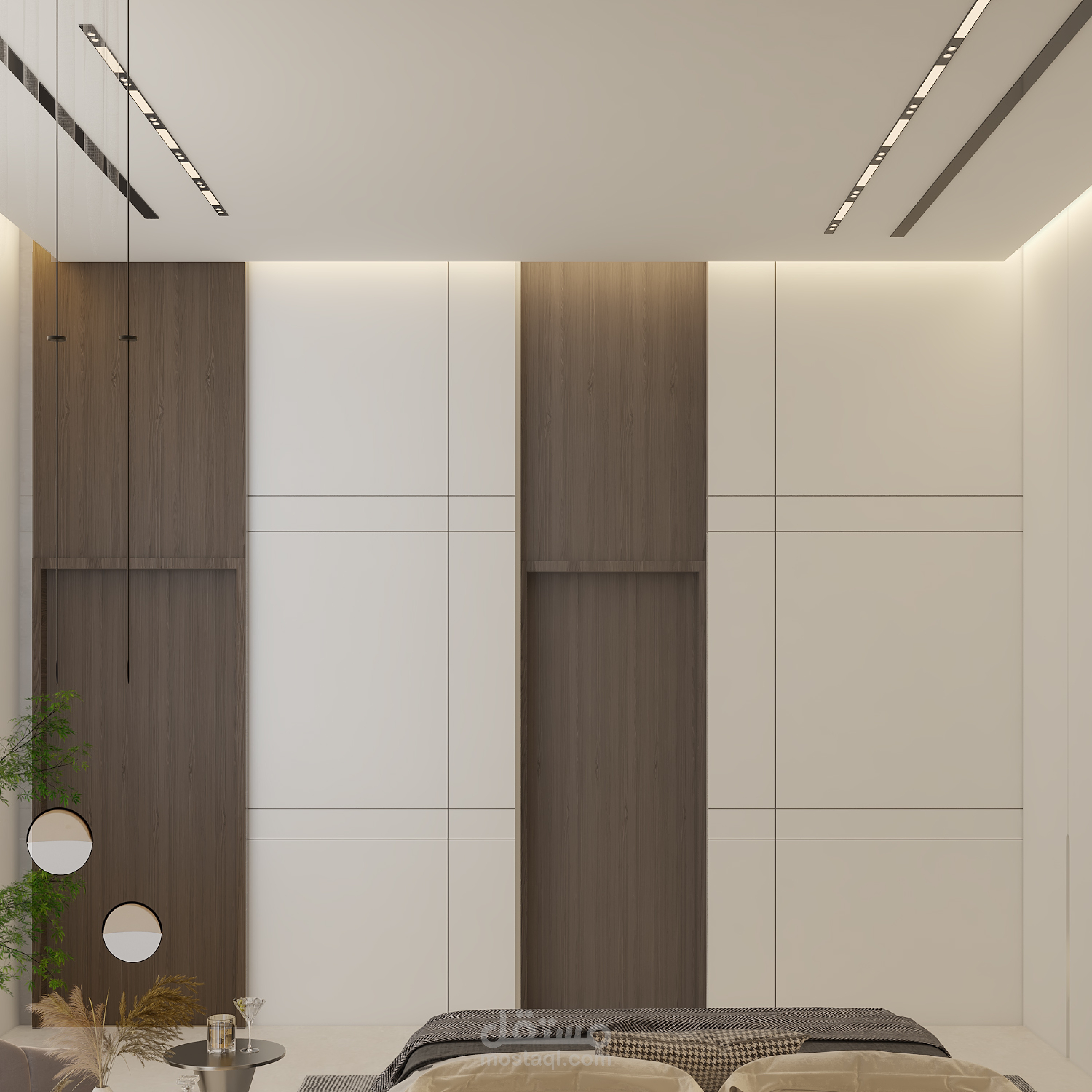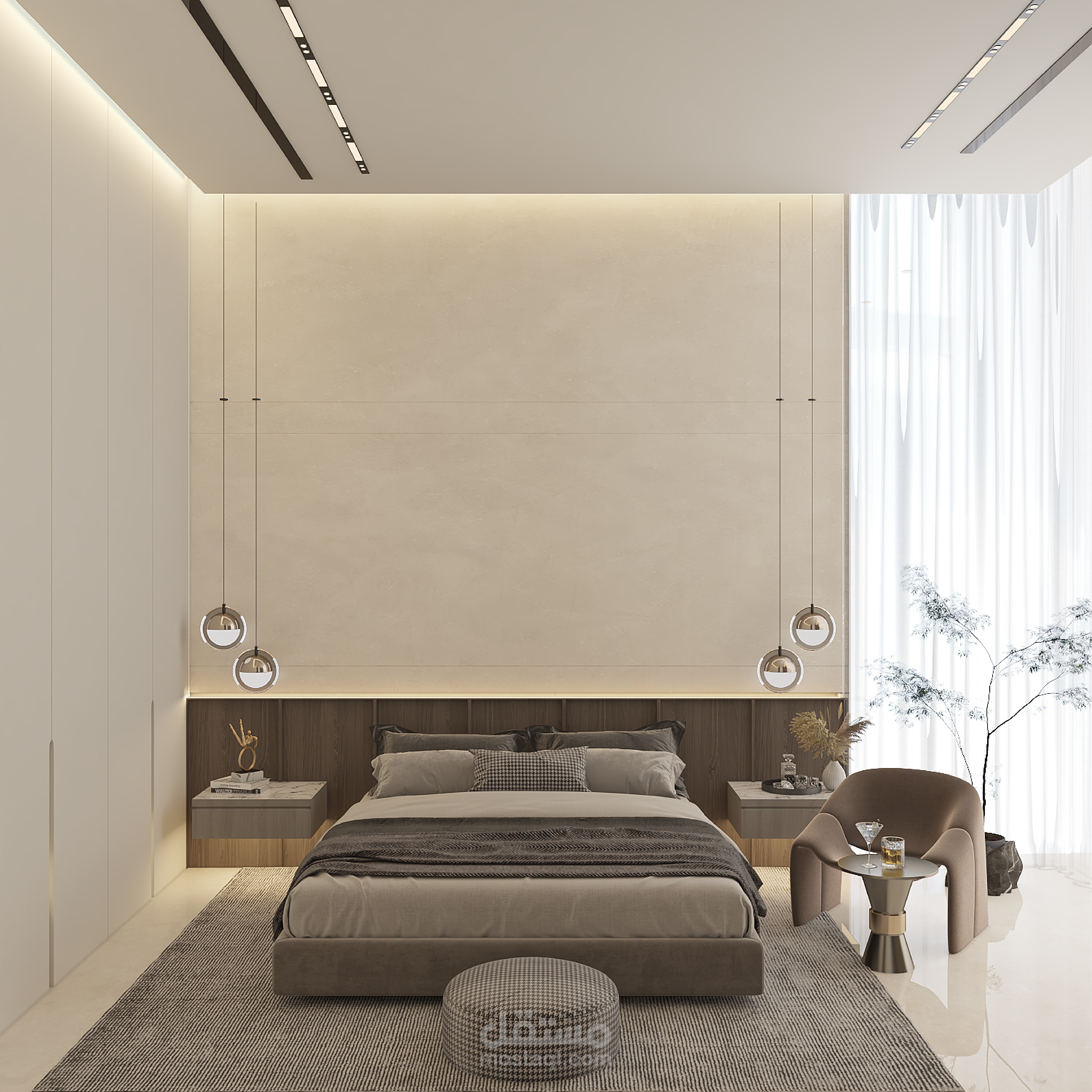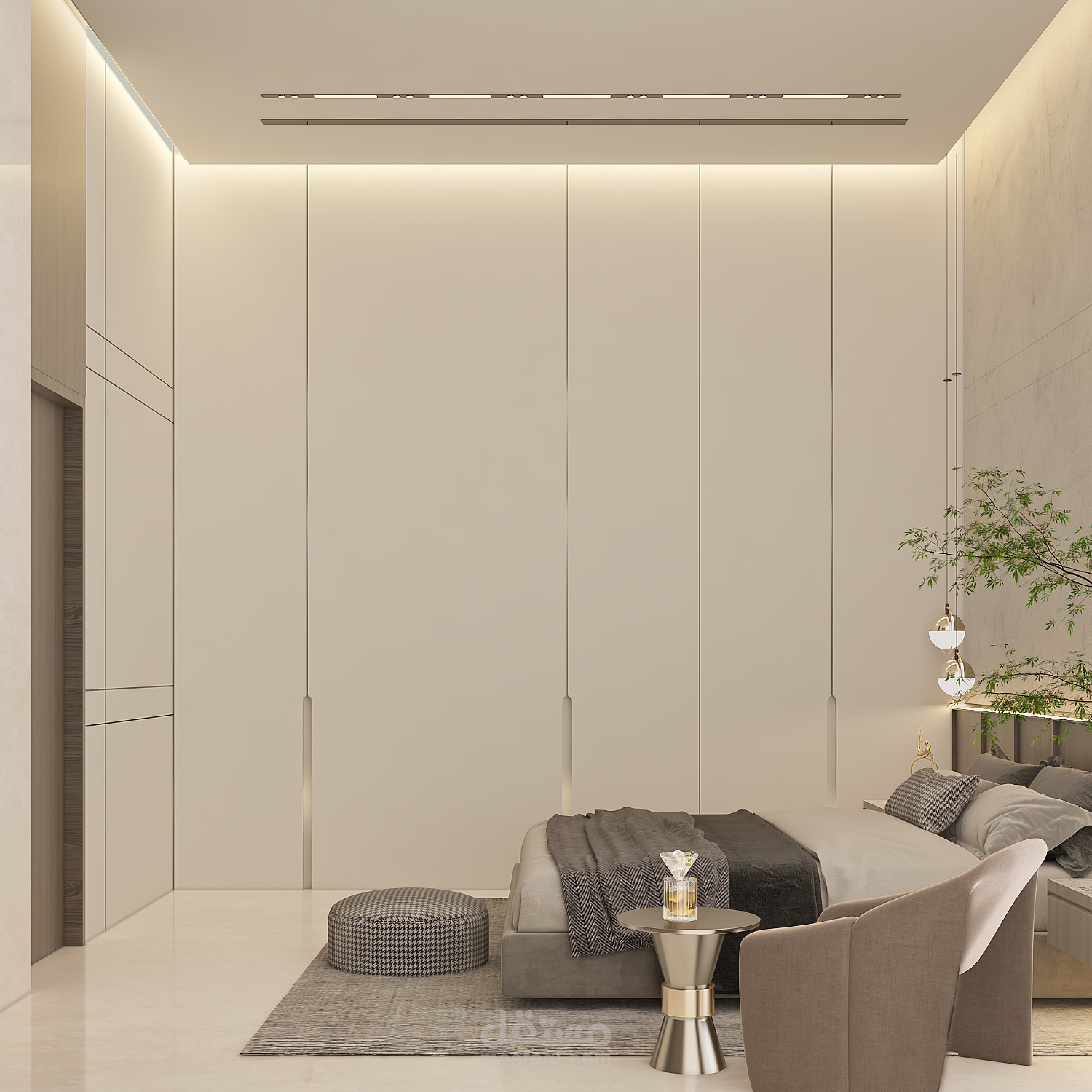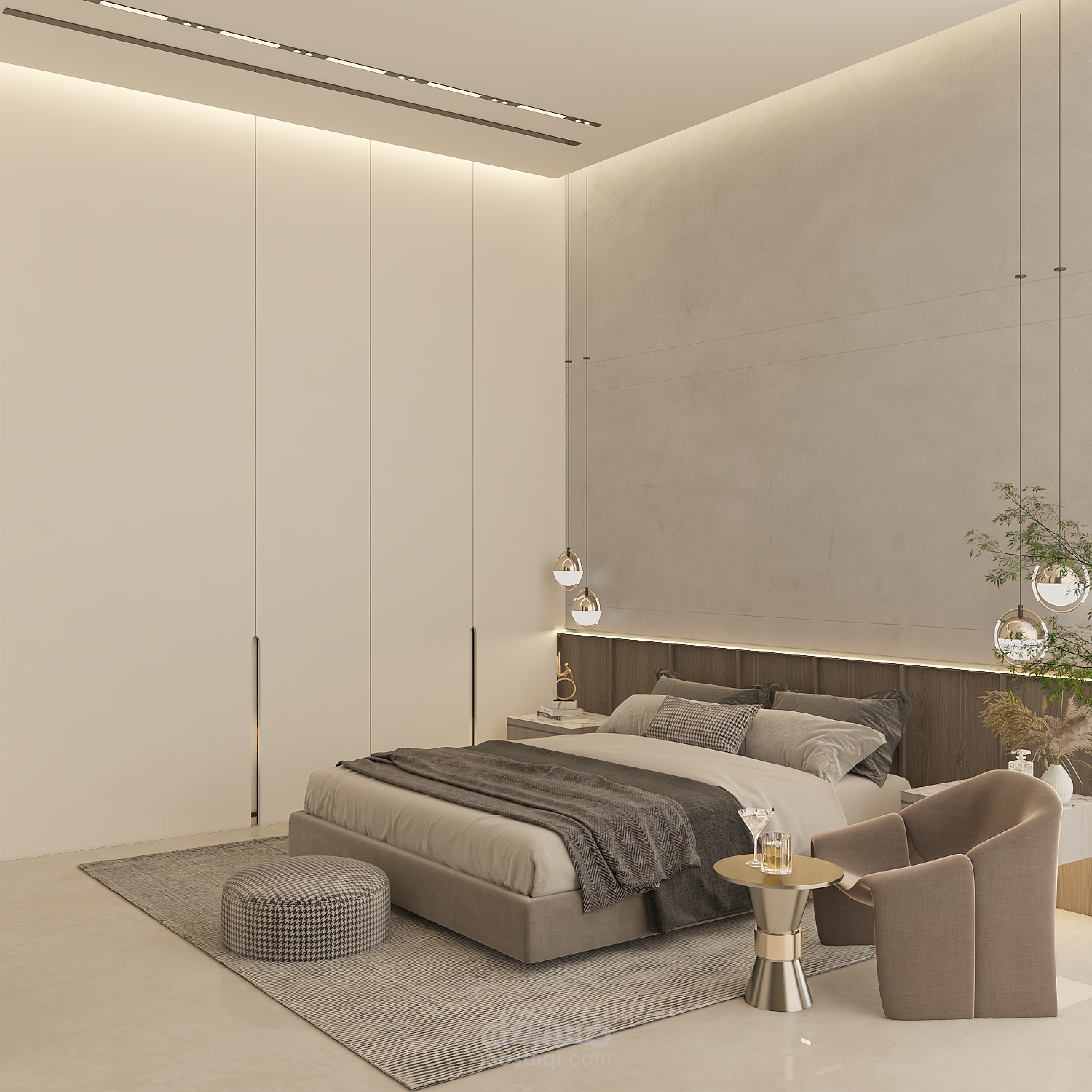 A modern bedroom with a minimalist design, featuring clean lines, neutral tones, and a calm, relaxing atmosphere. Soft lighting and simple materials create a warm and elegant space