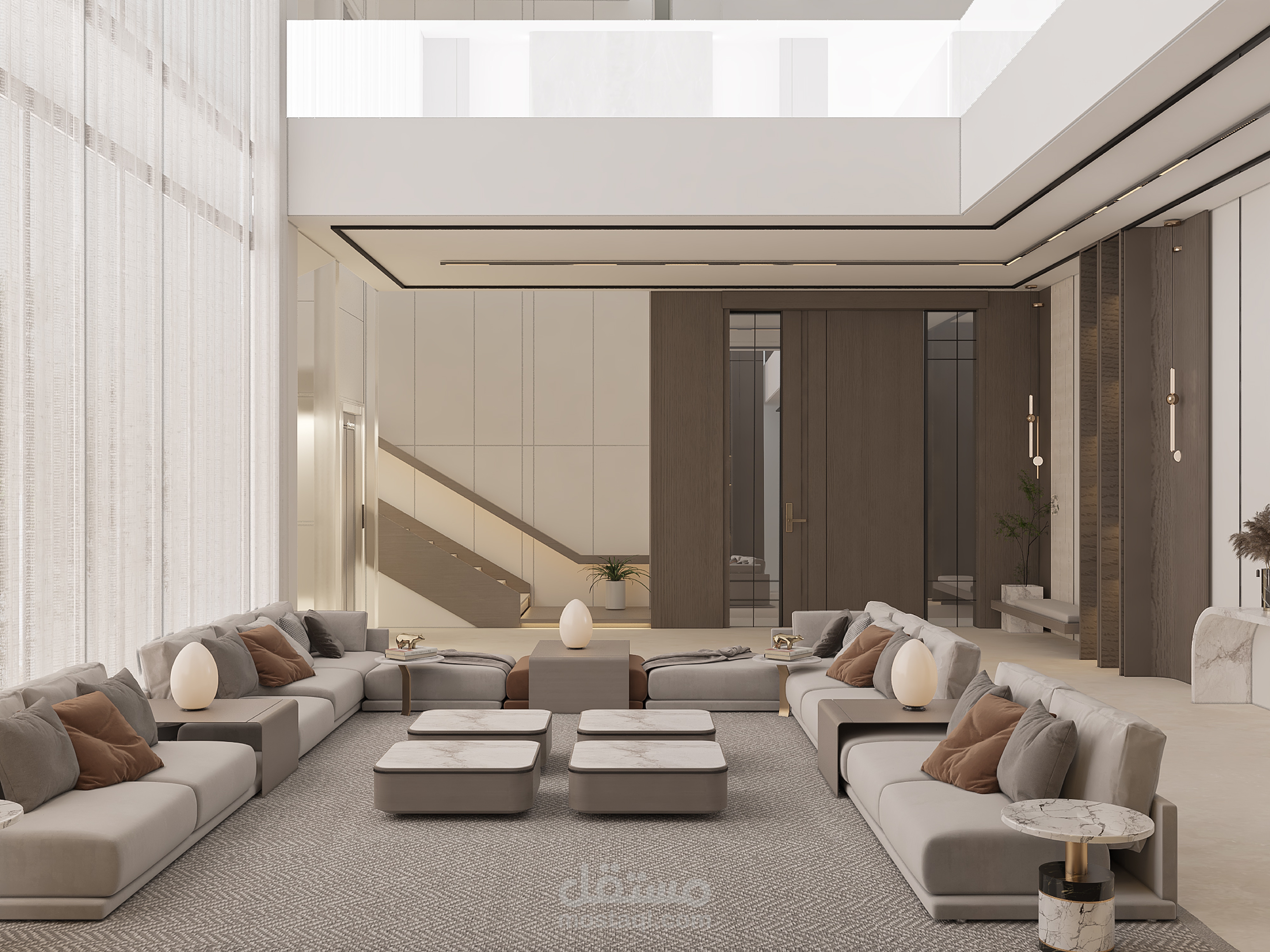 A double height family hall designed with an open and luxurious feel, emphasizing vertical space and natural light. Large windows enhance brightness and create a strong connection with the exterior.
