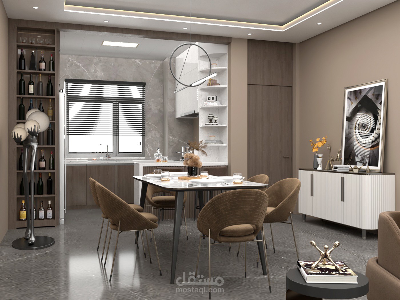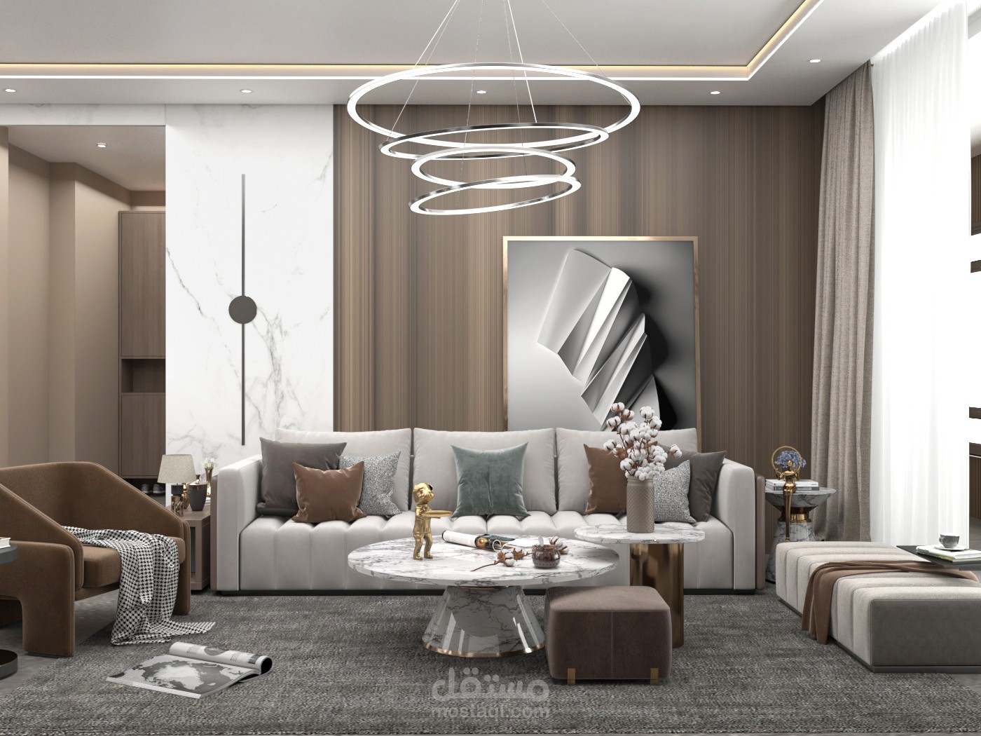 تصميم داخلي مودرن فاخر يعتمد على الألوان الهادئة والخامات الراقية، استخدام درجات النود مع لمسات ذهبية لإحساس أنيق ومترف.