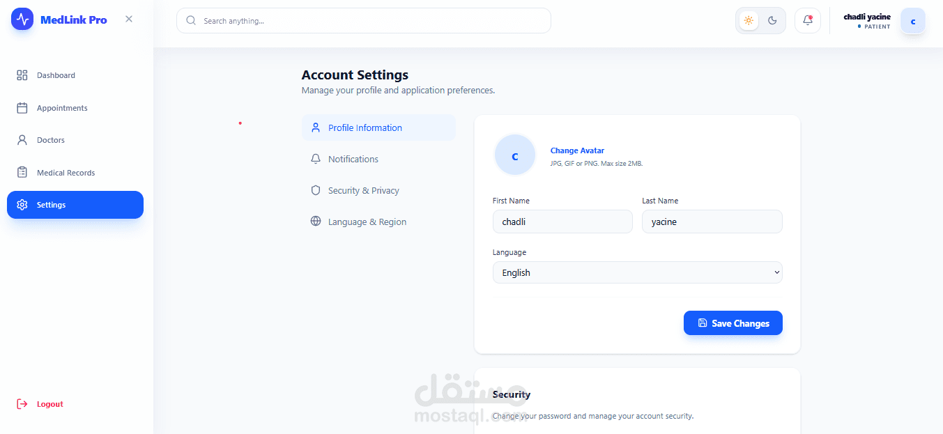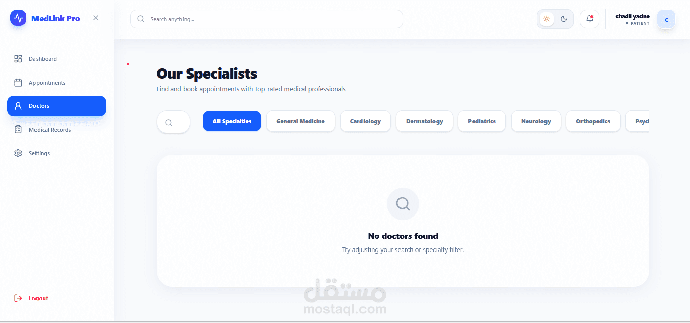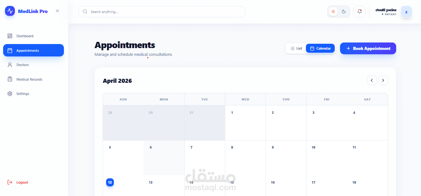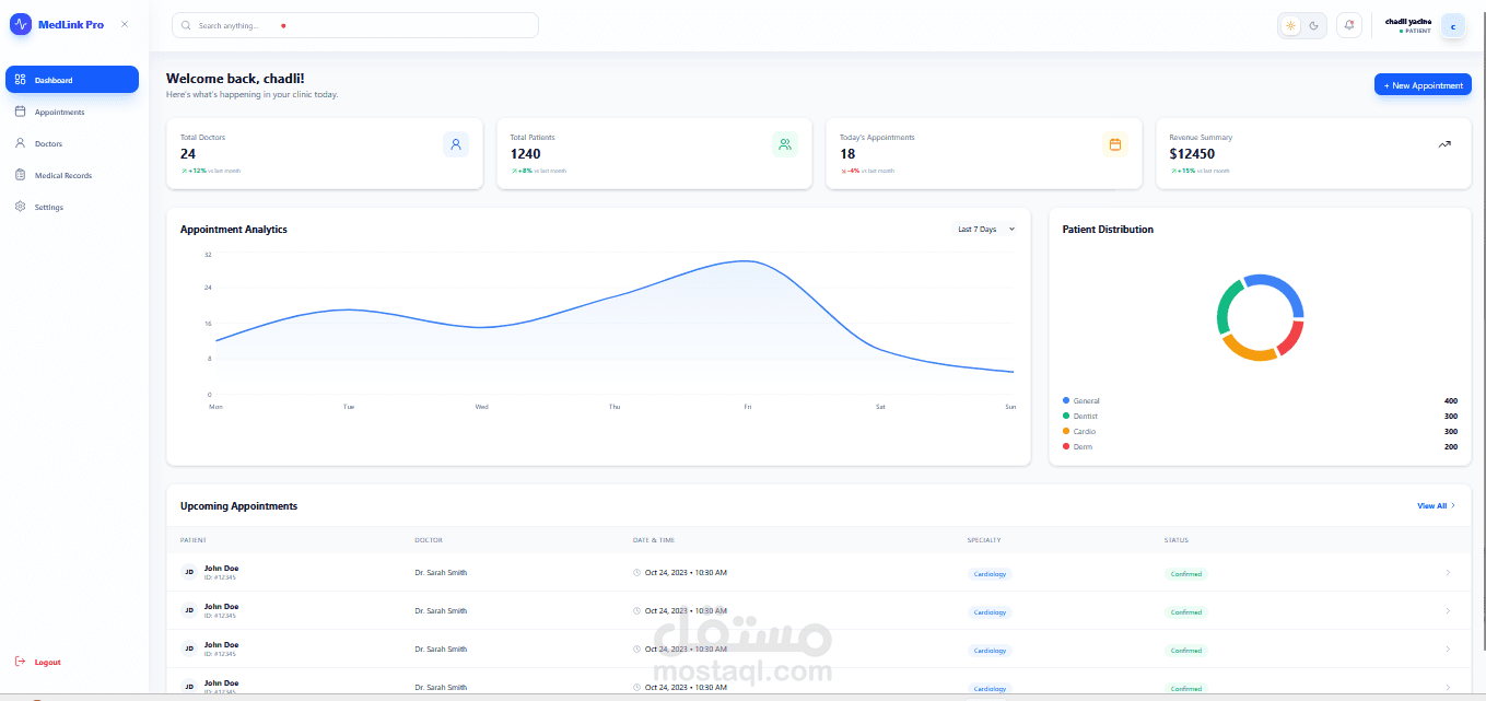 نظام ويب متكامل لإدارة العيادات والمواعيد الطبية، مبني بأحدث التقنيات ويدعم ثلاث لغات (عربي، فرنسي، إنجليزي).