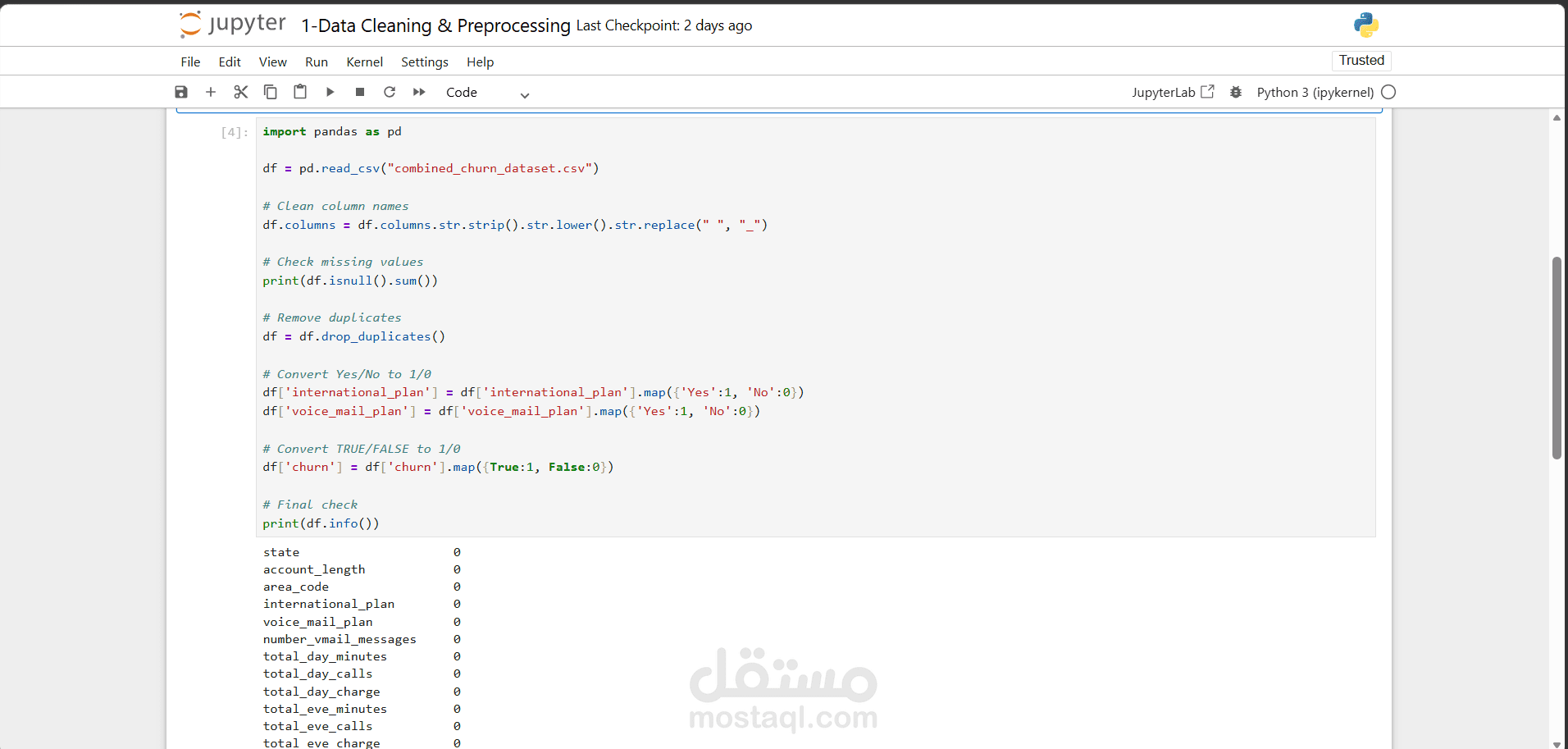 في هذا المشروع قمت بتنفيذ دورة تحليل بيانات كاملة على بيانات شركة اتصالات بهدف فهم سلوك العملاء والتنبؤ بتركهم للخدمة (Churn).