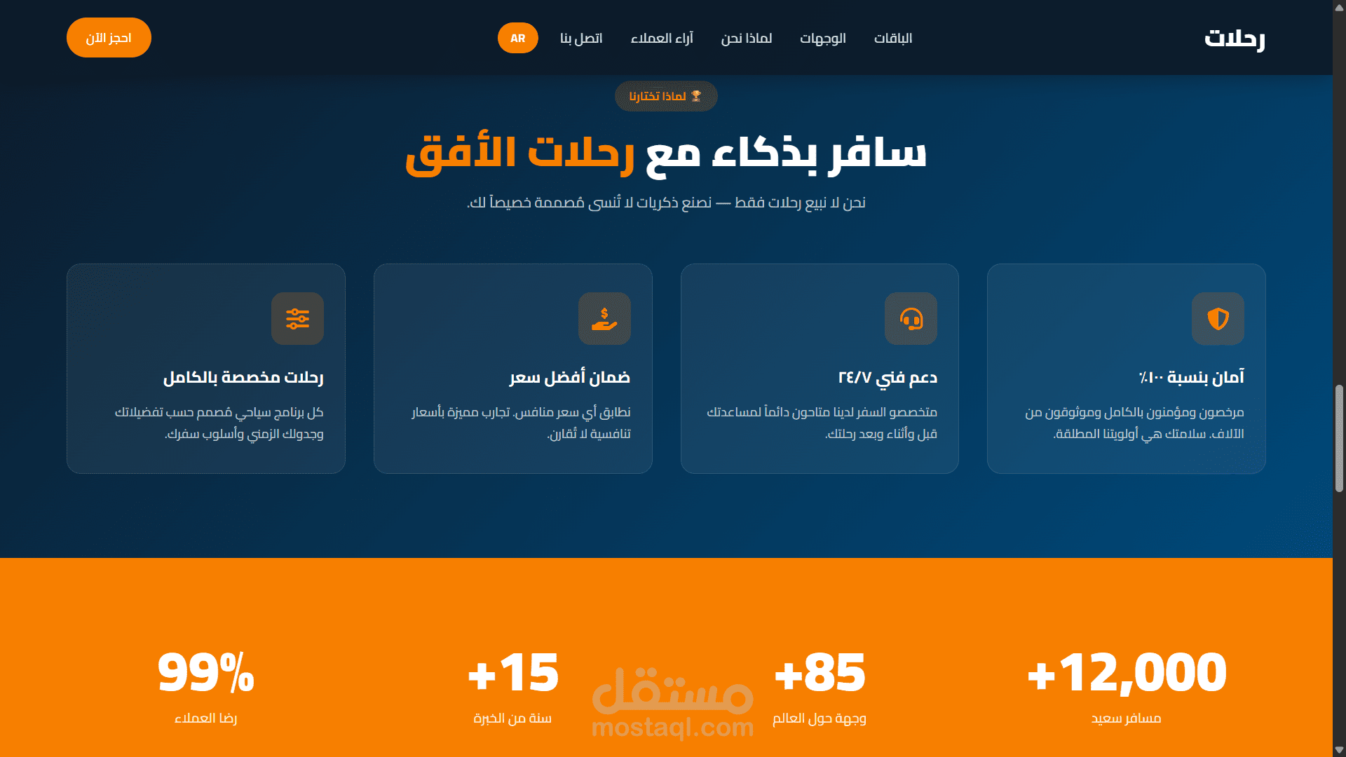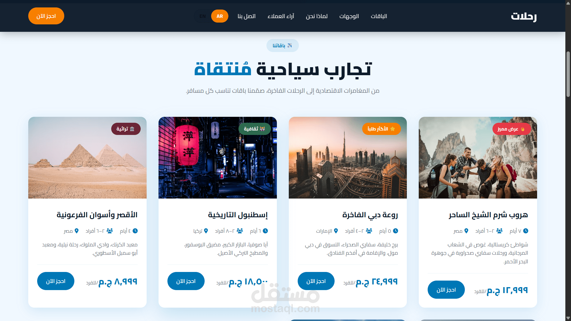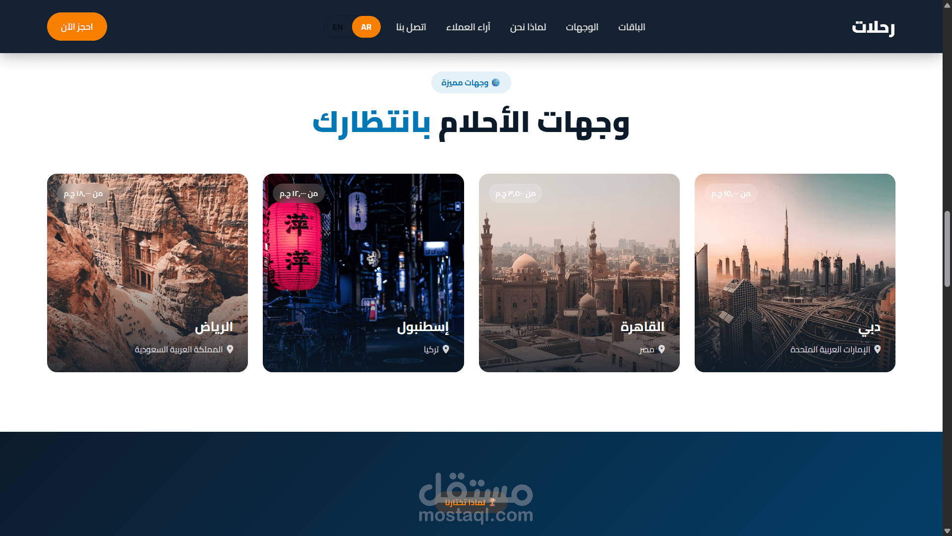 صفحة هبوط احترافية لشركة سياحة، مصممة لتقديم تجربة مستخدم جذابة تشجع على الحجز والاستكشاف. ركّز المشروع على إبراز العروض السياحية والوجهات بطريقة بصرية مميزة مع استخدام تصميم حديث وسلس يعكس روح السفر والمغامرة. تم تطوير الصفحة باستخدام HTML وCSS وJavaScript مع الاهتمام بالسرعة والتجاوب الكامل على جميع الأجهزة، بالإضافة إلى دعم اللغتين العربية والإنجليزية مع توافق اتجاه النص (RTL/LTR) لتناسب السوق العربي بشكل احترافي.