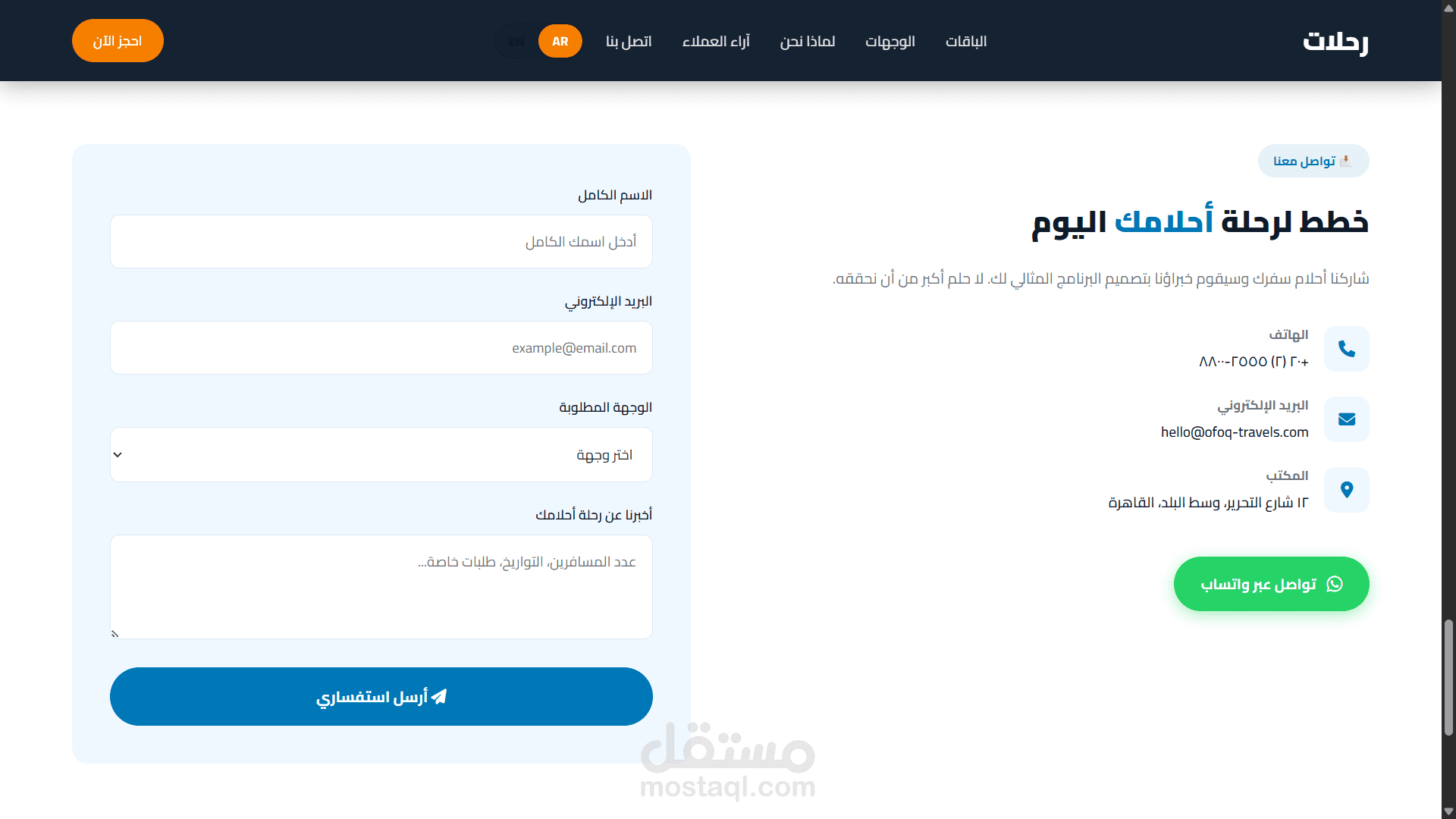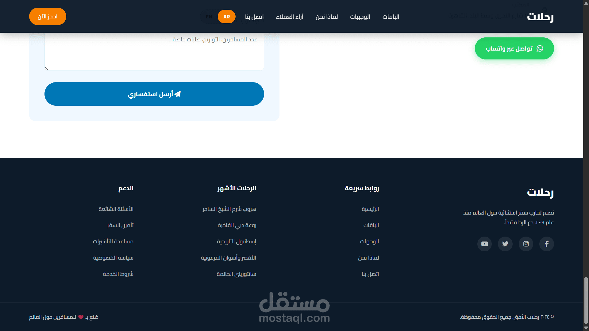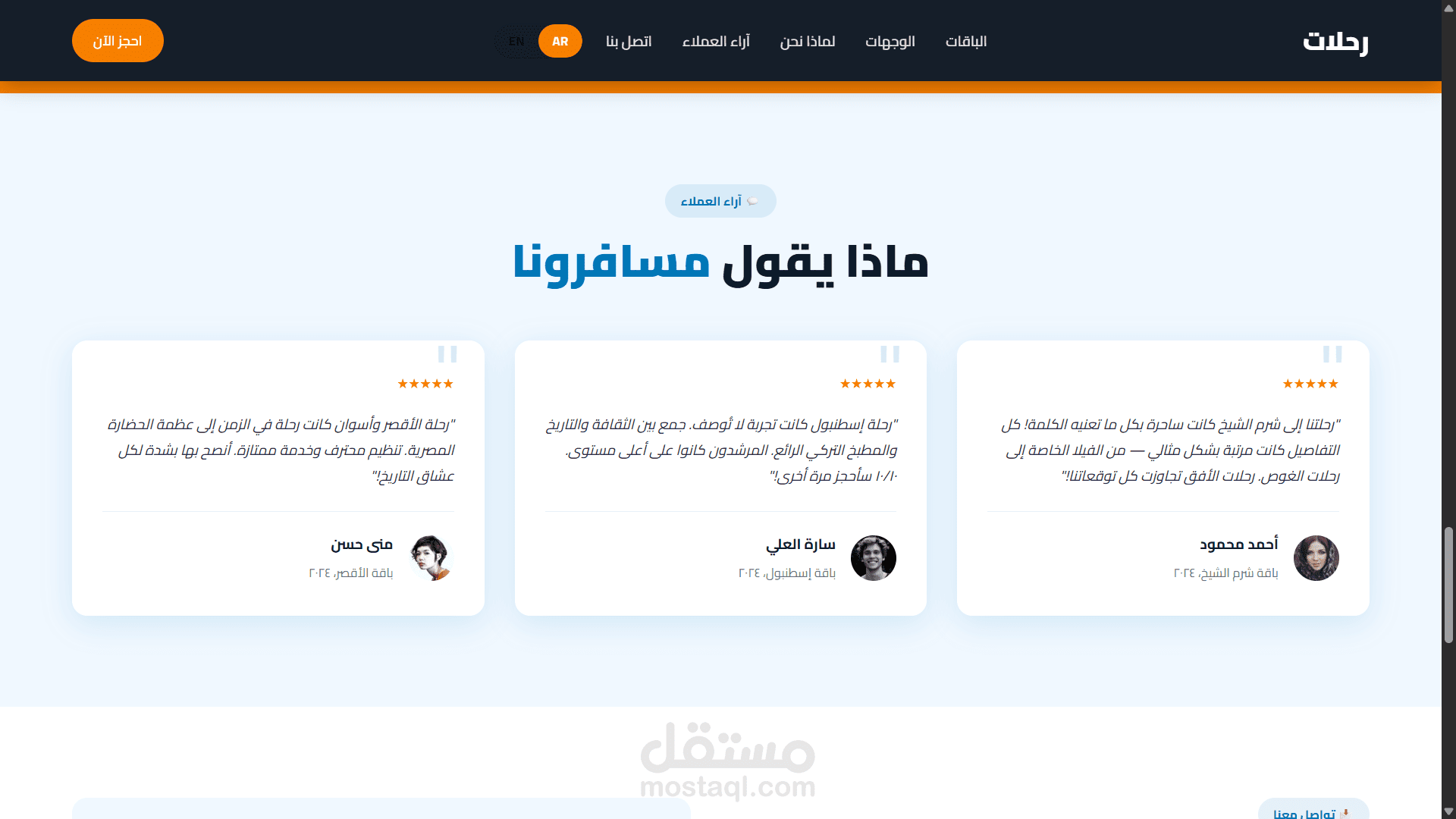 صفحة هبوط احترافية لشركة سياحة، مصممة لتقديم تجربة مستخدم جذابة تشجع على الحجز والاستكشاف. ركّز المشروع على إبراز العروض السياحية والوجهات بطريقة بصرية مميزة مع استخدام تصميم حديث وسلس يعكس روح السفر والمغامرة. تم تطوير الصفحة باستخدام HTML وCSS وJavaScript مع الاهتمام بالسرعة والتجاوب الكامل على جميع الأجهزة، بالإضافة إلى دعم اللغتين العربية والإنجليزية مع توافق اتجاه النص (RTL/LTR) لتناسب السوق العربي بشكل احترافي.