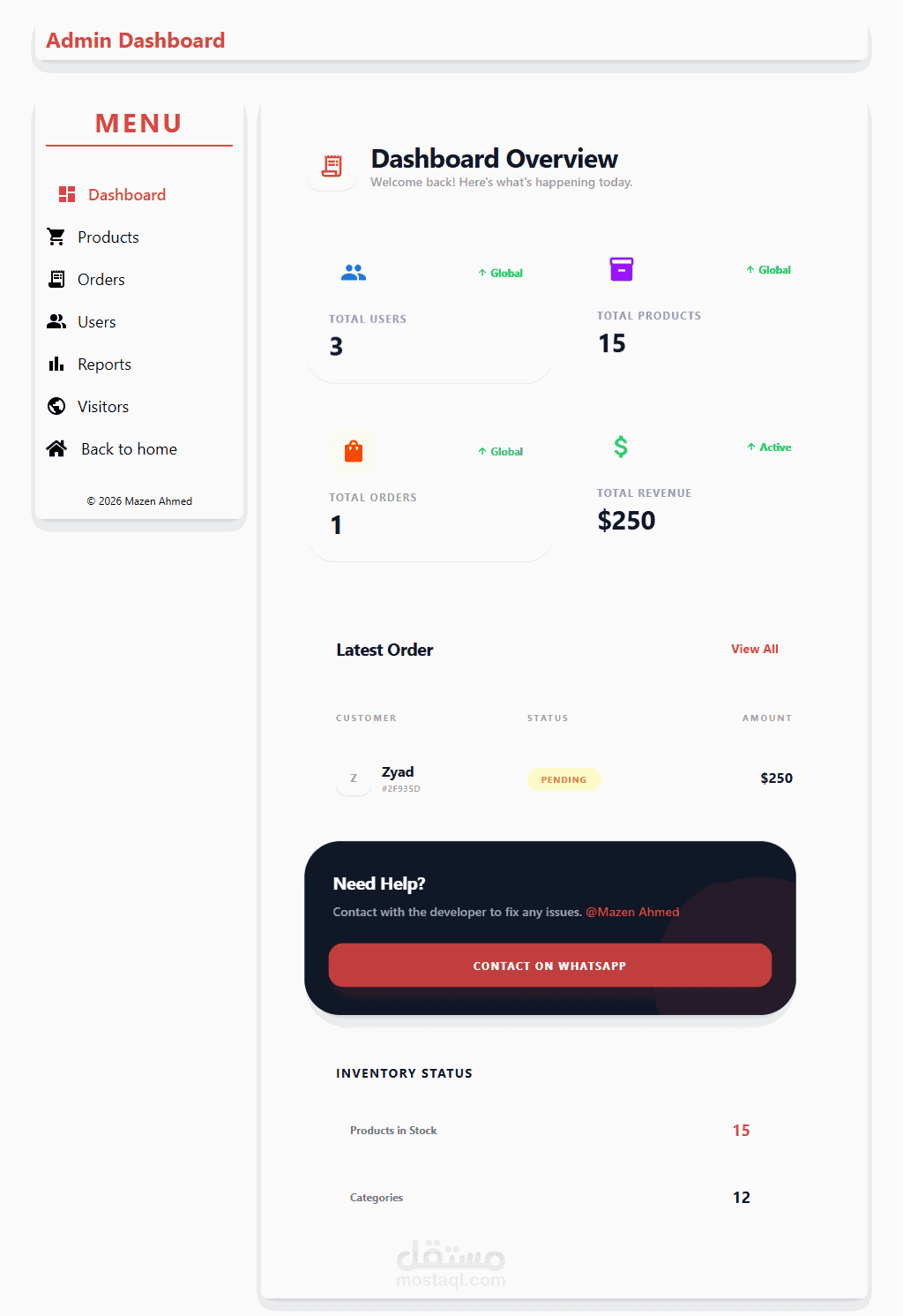 كما يوضح المشروع قدرتي على بناء أنظمة متكاملة تشمل الواجهة الأمامية والخلفية، مع تنظيم الكود وكتابة APIs وربطها بشكل احترافي.