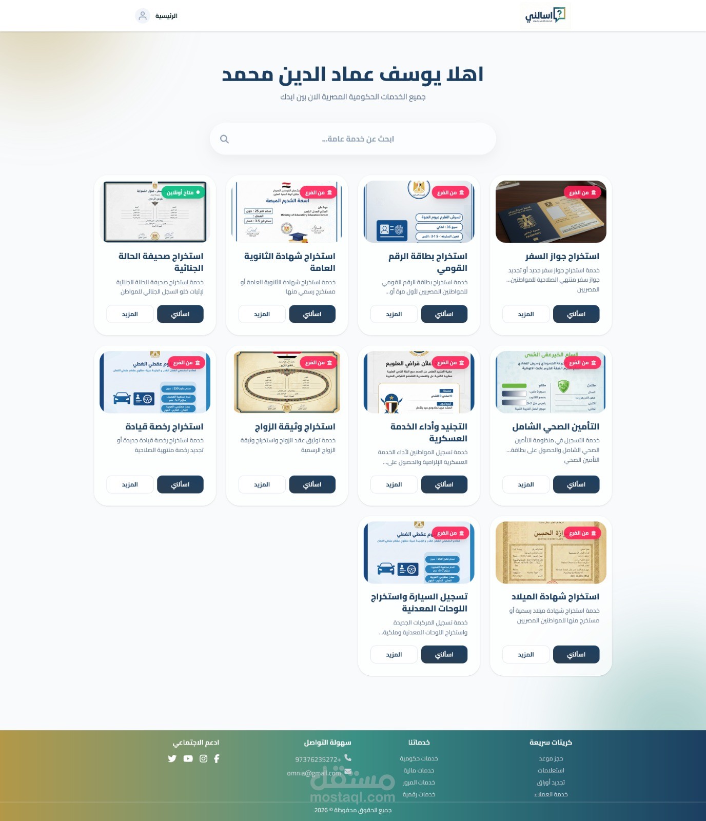 قسم الخدمات الحكومية المطور: دليل تفصيلي لخدمات (الرقم القومي، الجوازات، التجنيد، التراخيص، والمرافق)، يوضح الأوراق المطلوبة، الخطوات، والروابط المباشرة للمواقع الرسمية.