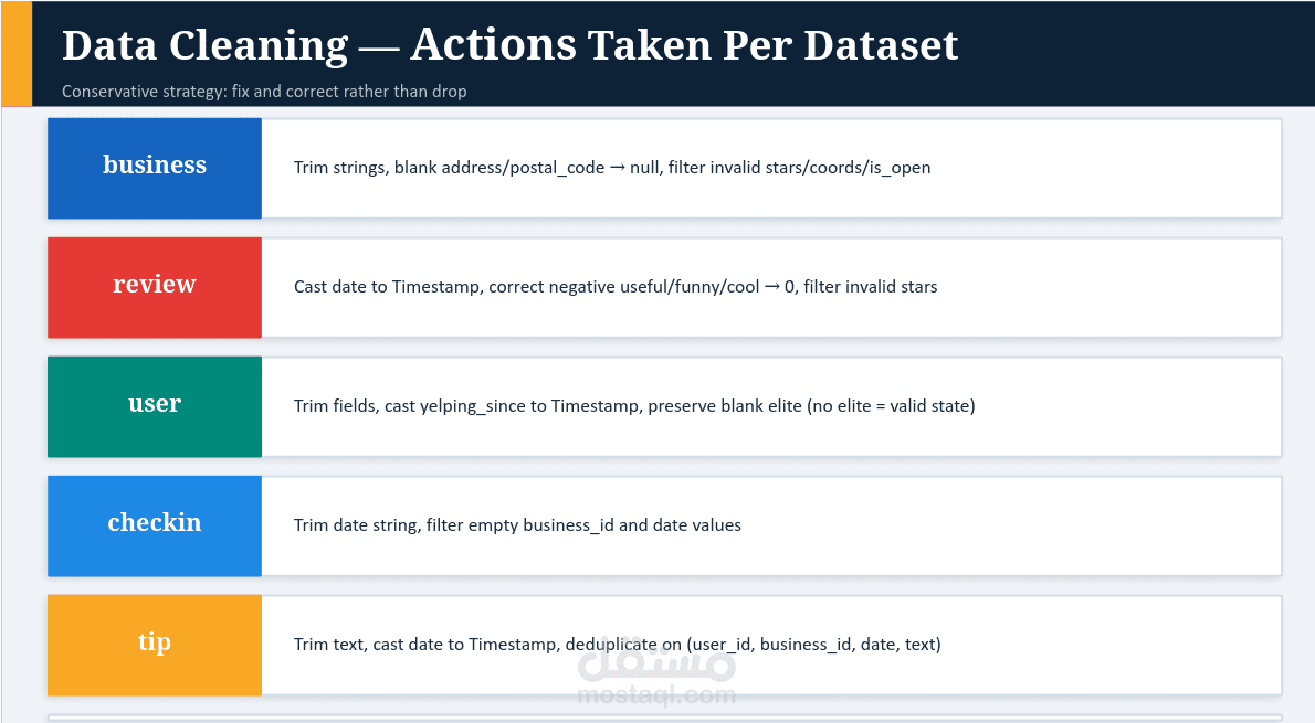 Data Cleaning: تنظيف البيانات بشكل احترافي (معالجة القيم الشاذة، القيم المفقودة، توحيد التنسيقات، تصحيح القيم غير المنطقية مثل القيم السالبة في التقييمات، وضمان التكامل المرجعي بين الجداول).
