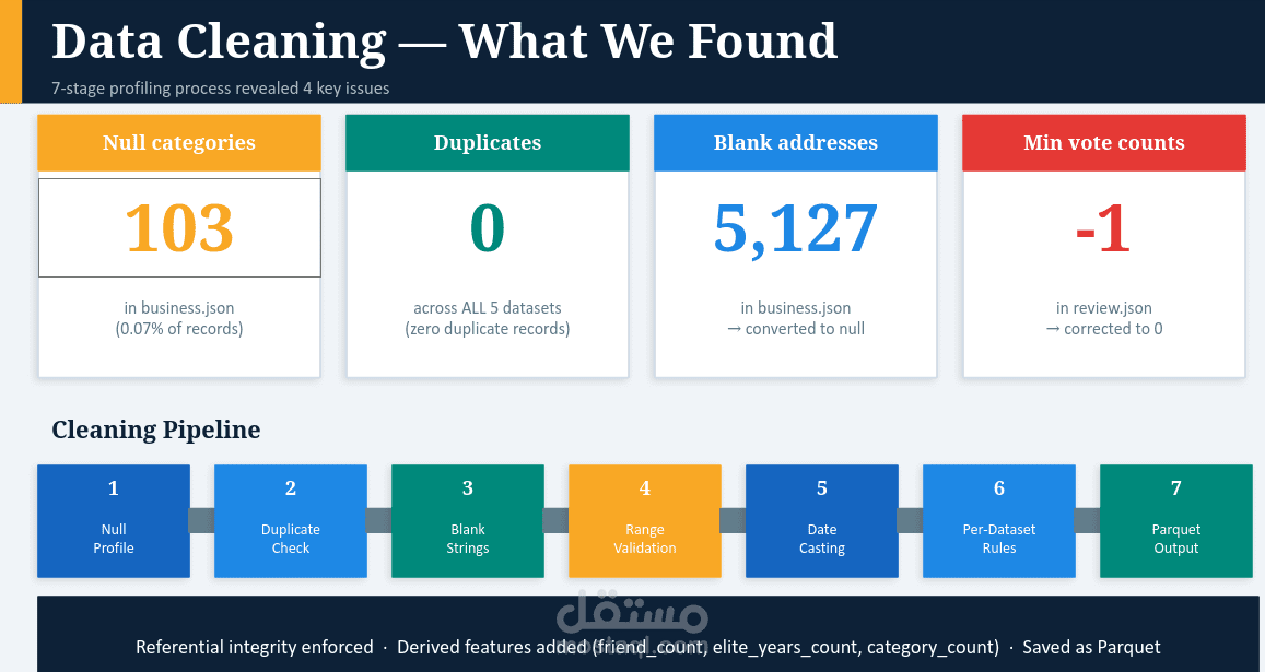 كما تم استخدام بيئة عمل احترافية تشمل Docker + Spark + JupyterLab، مع تخزين البيانات بعد التنظيف بصيغة Parquet لتحسين الأداء.