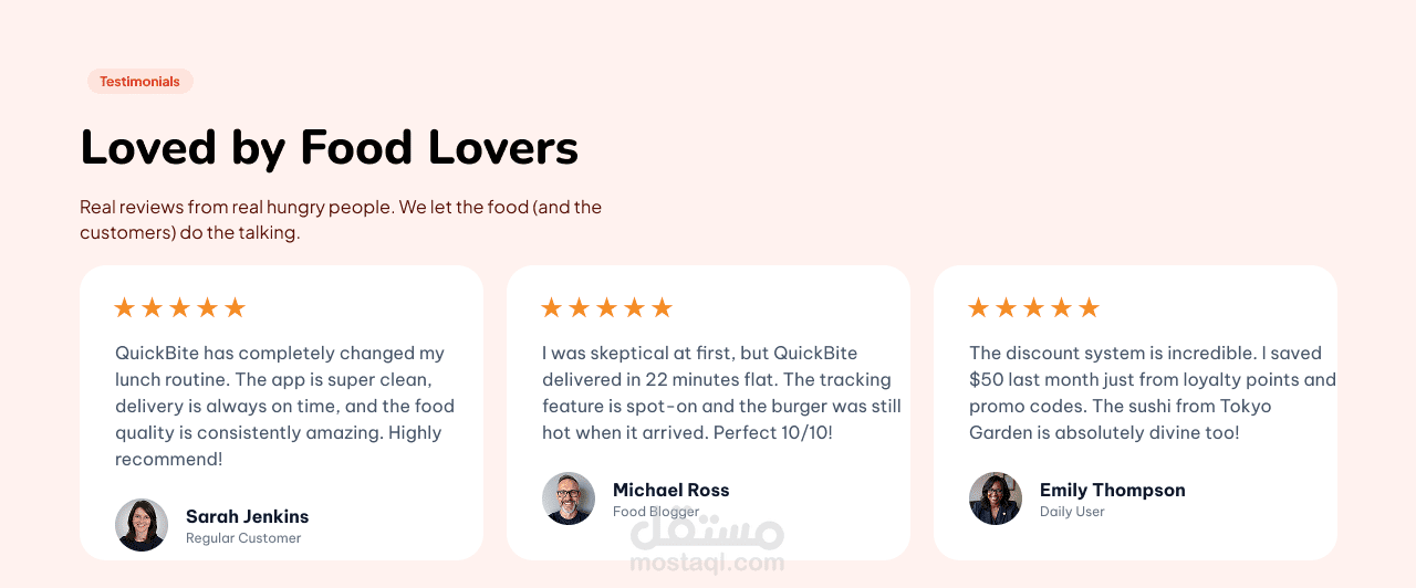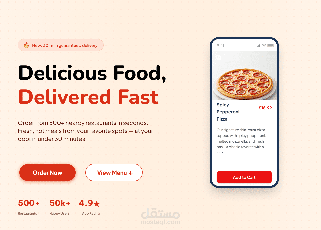 مكونات التصميم: إنشاء واجهات لعرض فئات الأطعمة، قوائم المطاعم، بطاقات الوجبات، أقسام التقييمات وتجارب المستخدمين، بالإضافة إلى صفحة تعريفية توضح آلية عمل التطبيق وتشجع على تحميله.