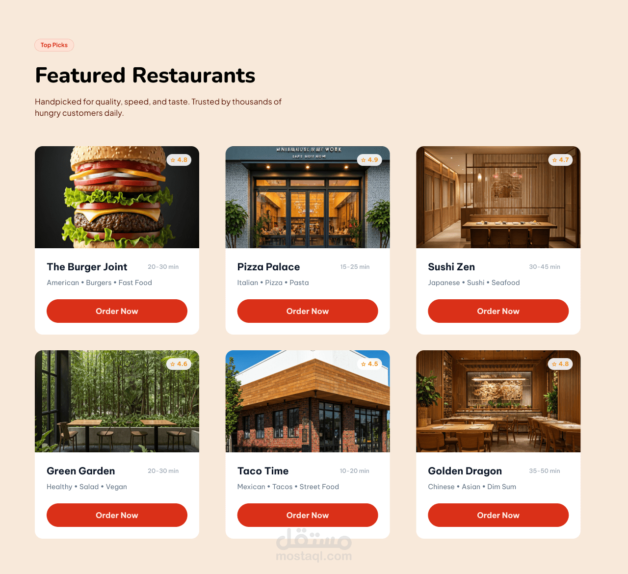 واجهة المستخدم (UI): تصميم واجهة حديثة باستخدام ألوان دافئة ومتناسقة تعكس هوية تطبيقات الطعام، مع إبراز العناصر المهمة بصريًا مثل العروض، التقييمات، وأزرار الطلب، والحفاظ على وضوح القراءة وسهولة التصفح.