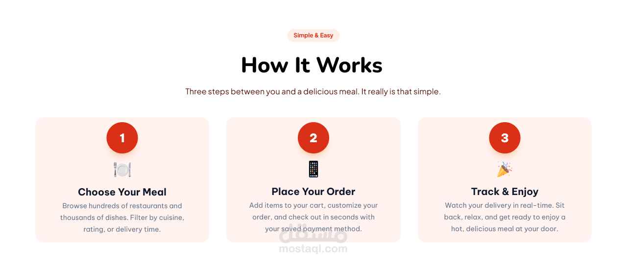 تجربة المستخدم (UX): تخطيط رحلة المستخدم بعناية لتمكينه من استكشاف الوجبات والمطاعم، مقارنة الخيارات، وإتمام الطلب بسرعة دون تعقيد، مع الاعتماد على تنظيم المحتوى وتوزيع العناصر بشكل يقلل التشتت.