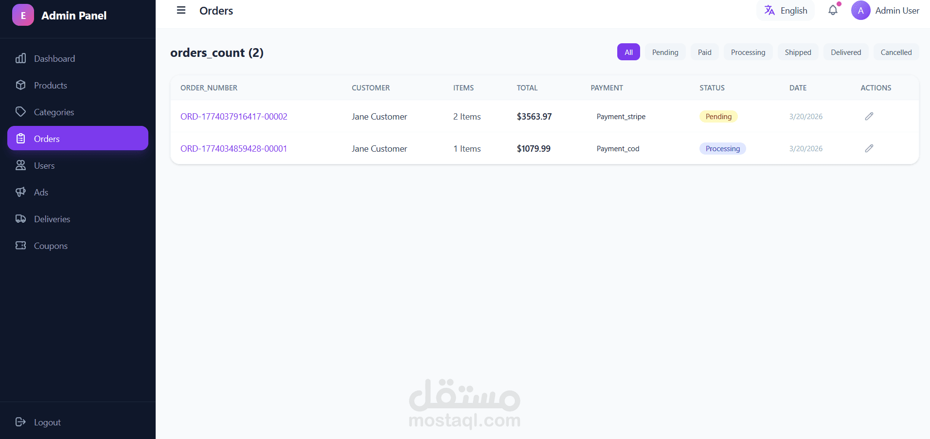 • تحديث حالة الطلب (قيد التوصيل – تم التسليم)