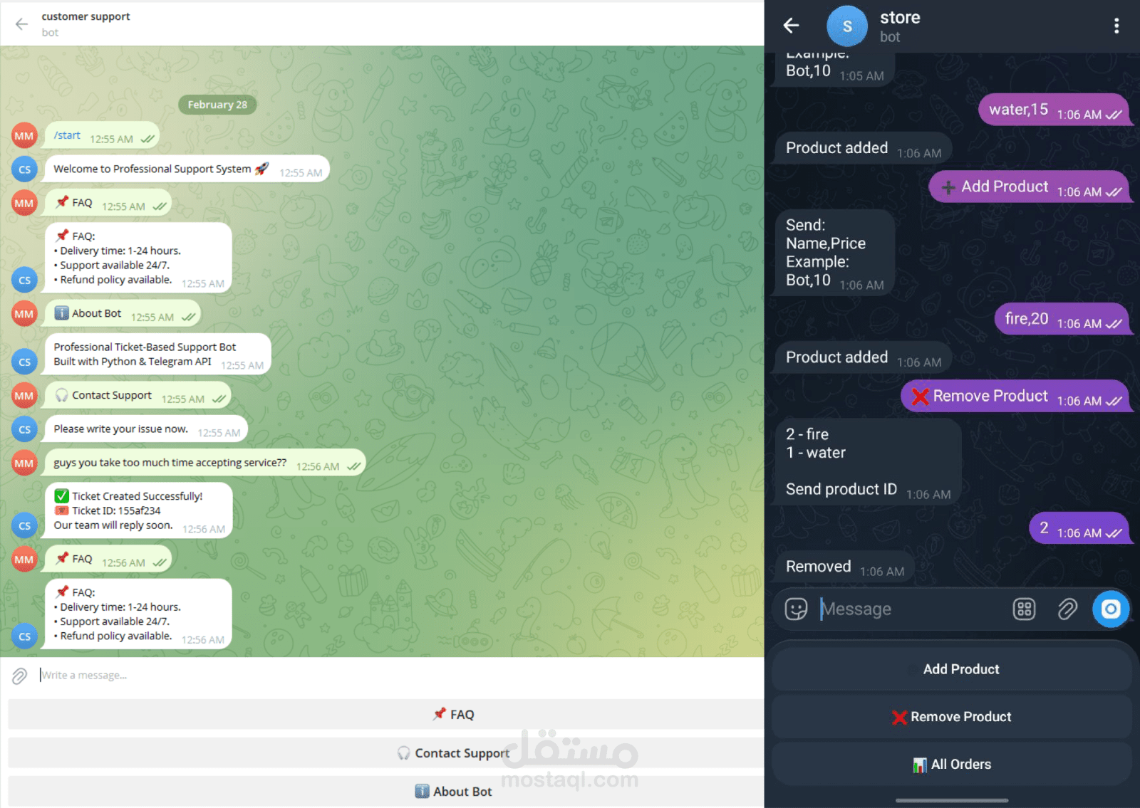 قمت بتطوير مجموعة من بوتات تيليجرام المتقدمة باستخدام Python و Telegram Bot API، تم استخدامها فعليًا في بيئات حقيقية (Production)، وتهدف إلى أتمتة العمليات، تحسين تجربة المستخدم، وتقليل الجهد اليدوي.