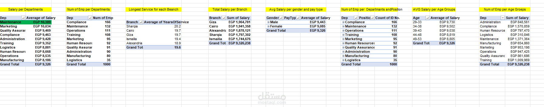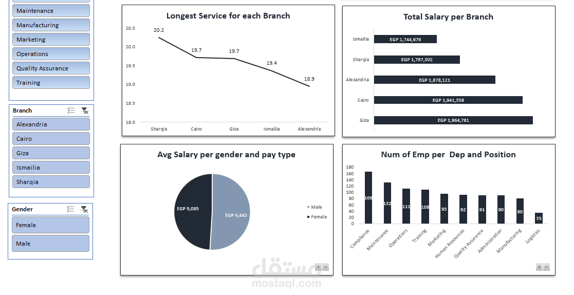 قمت بتصميم Dashboard احترافي باستخدام Microsoft Excel لتحليل بيانات الموظفين عبر الإدارات والفروع المختلفة، بهدف مساعدة إدارة الموارد البشرية على اتخاذ قرارات مبنية على البيانات.