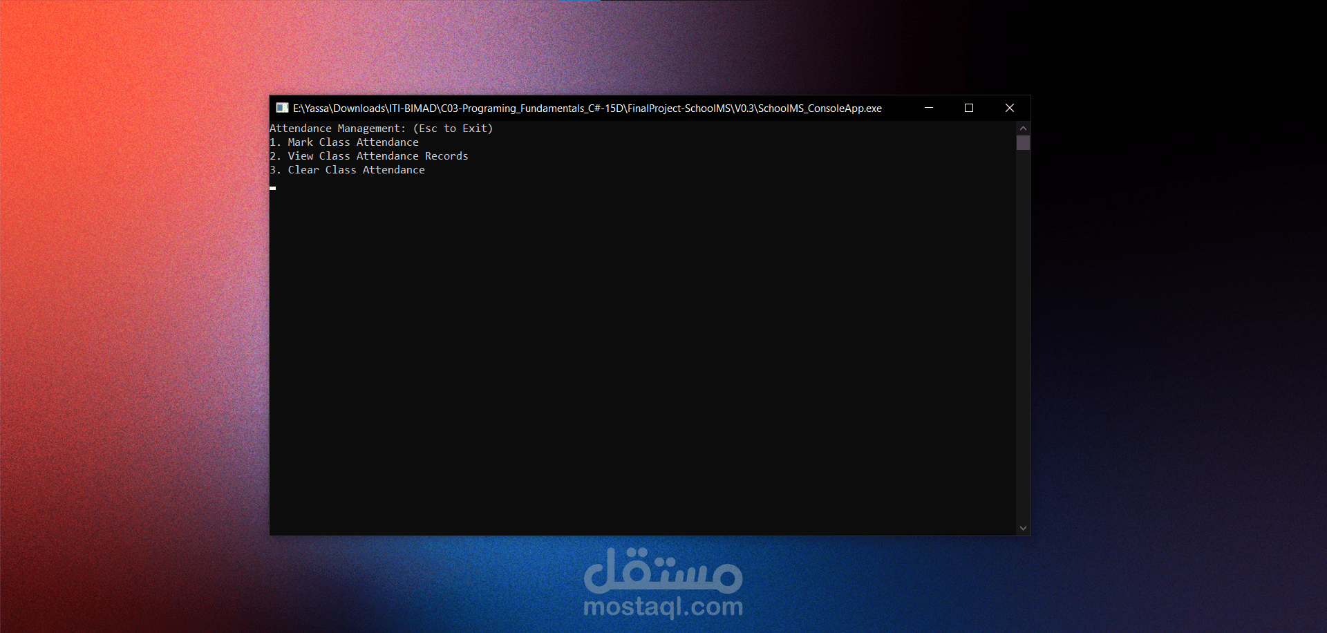 تطبيق إدارة مدرسية يغطي دورة البيانات الكاملة: إضافة الطلاب والمقررات والفصول، تسجيل الحضور والغياب، وربط الطلاب بالفصول والمقررات. يعكس التطبيق فهماً عملياً لتصميم قواعد البيانات العلائقية والبرمجة الهيكلية.