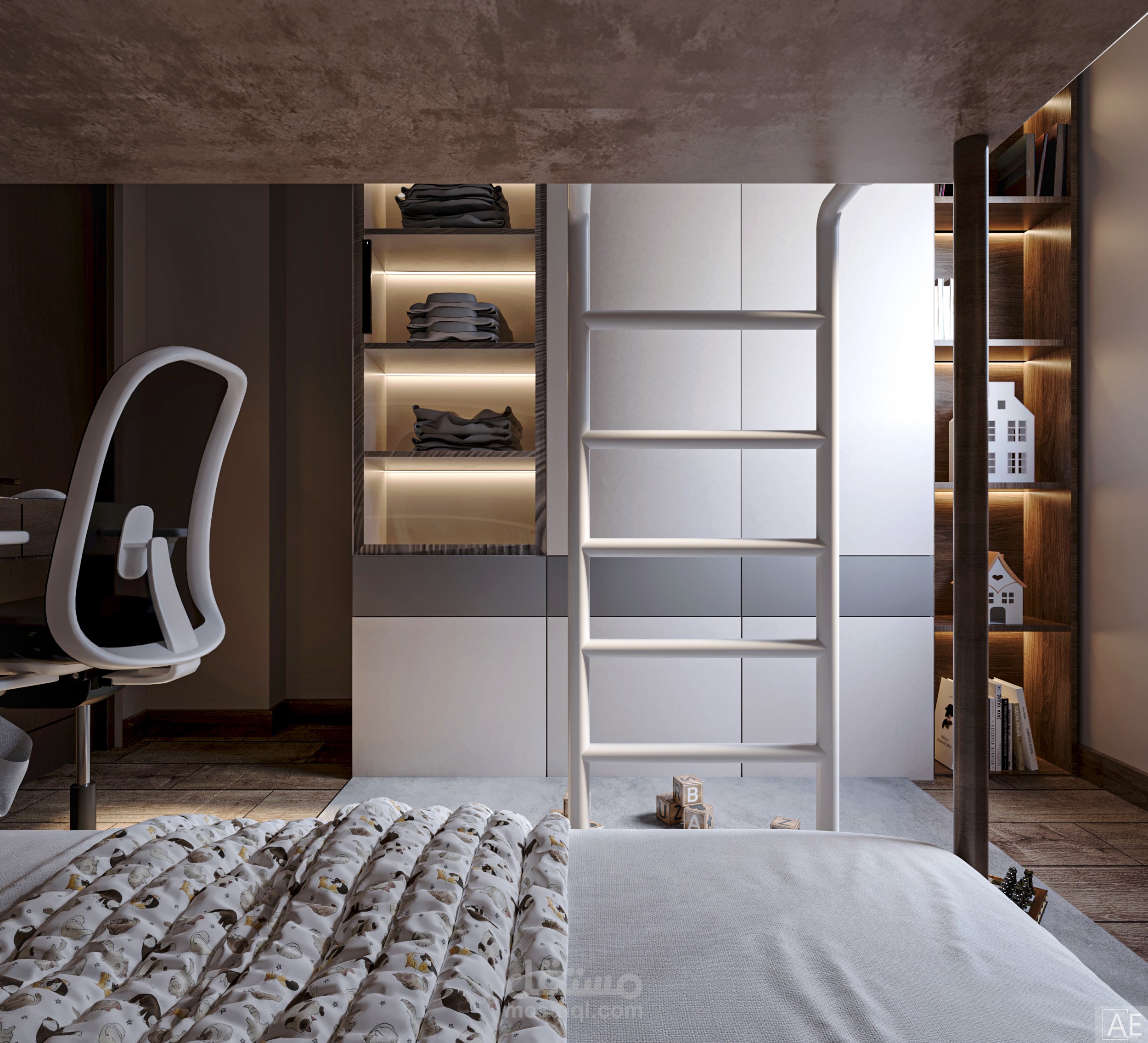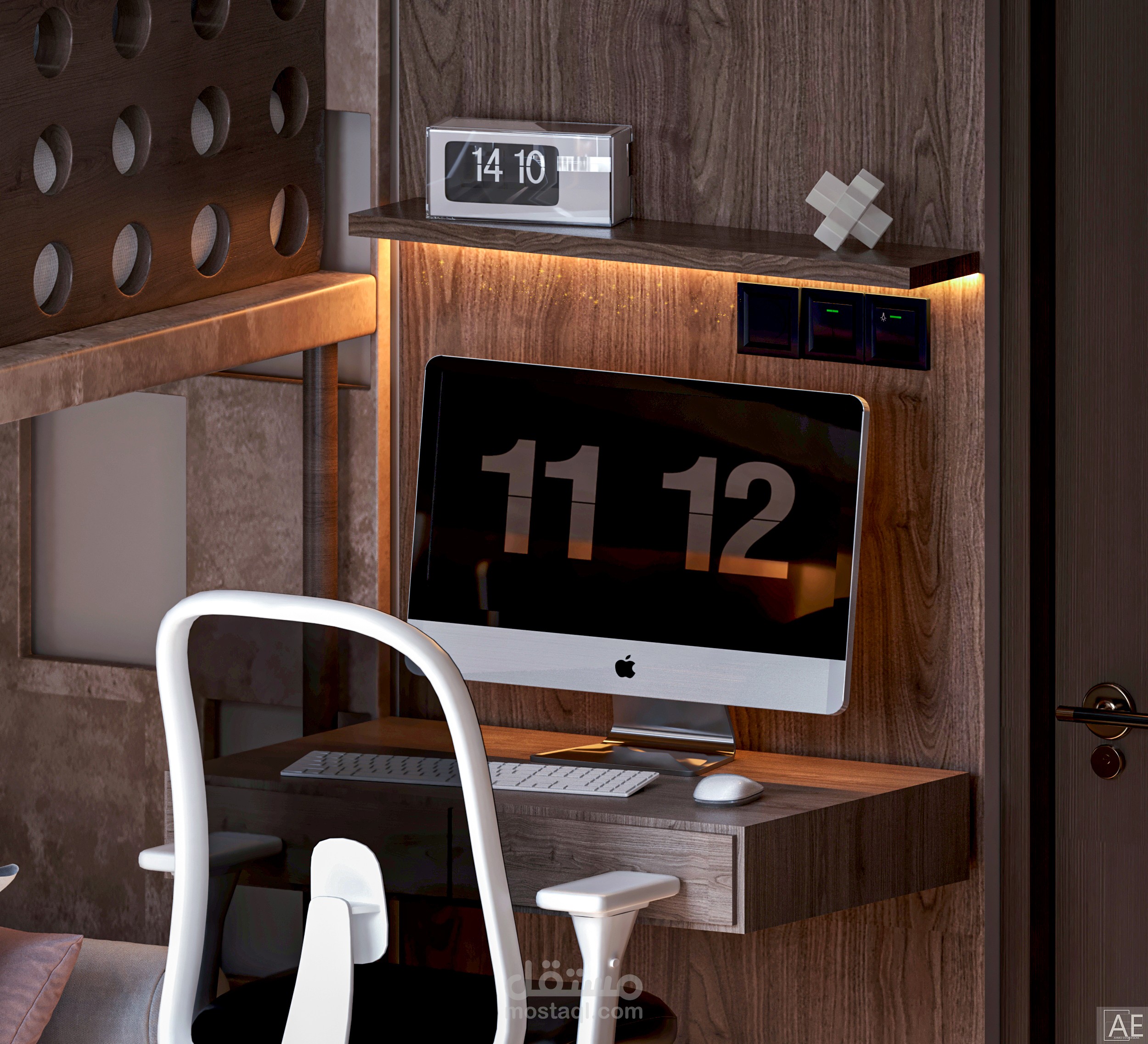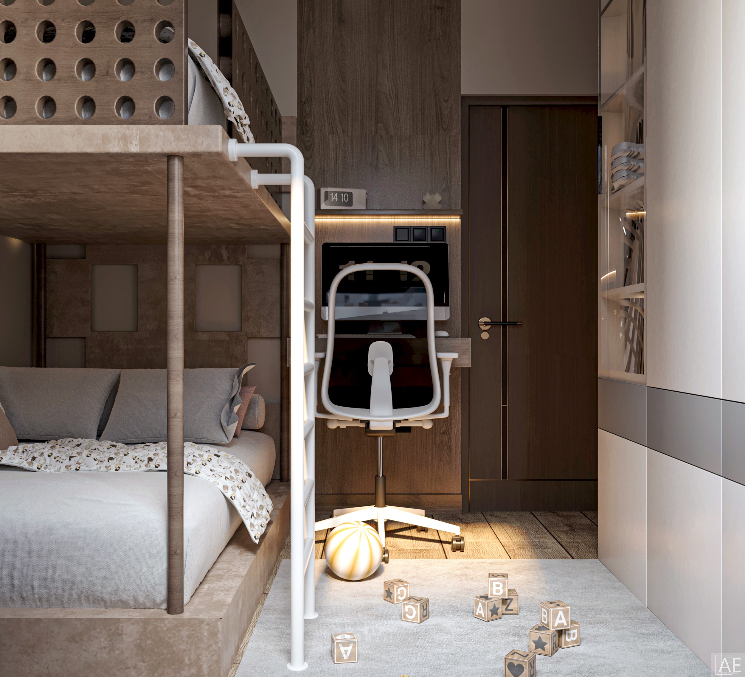This kids’ bedroom blends functionality with comfort..featuring cozy bunk beds, a smart study corner, and playful details.