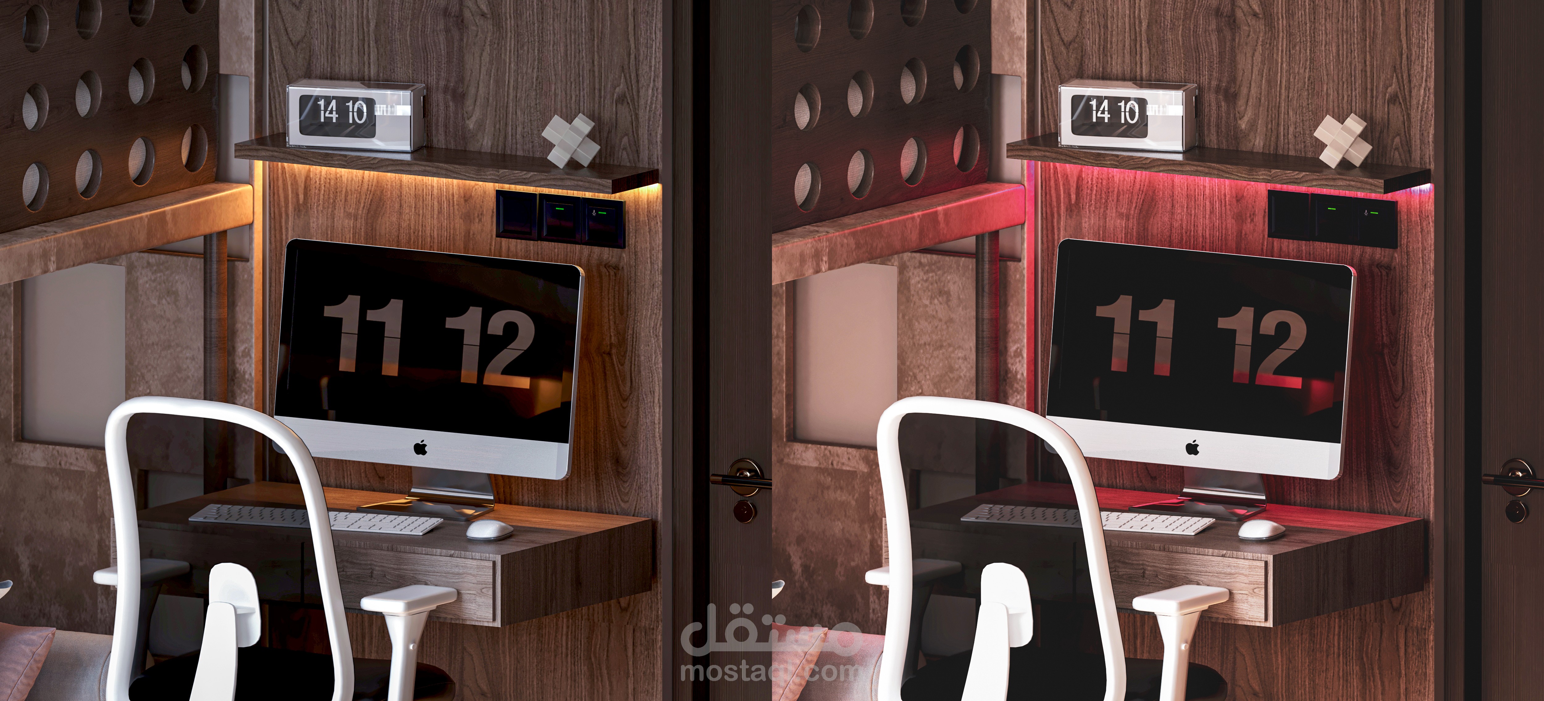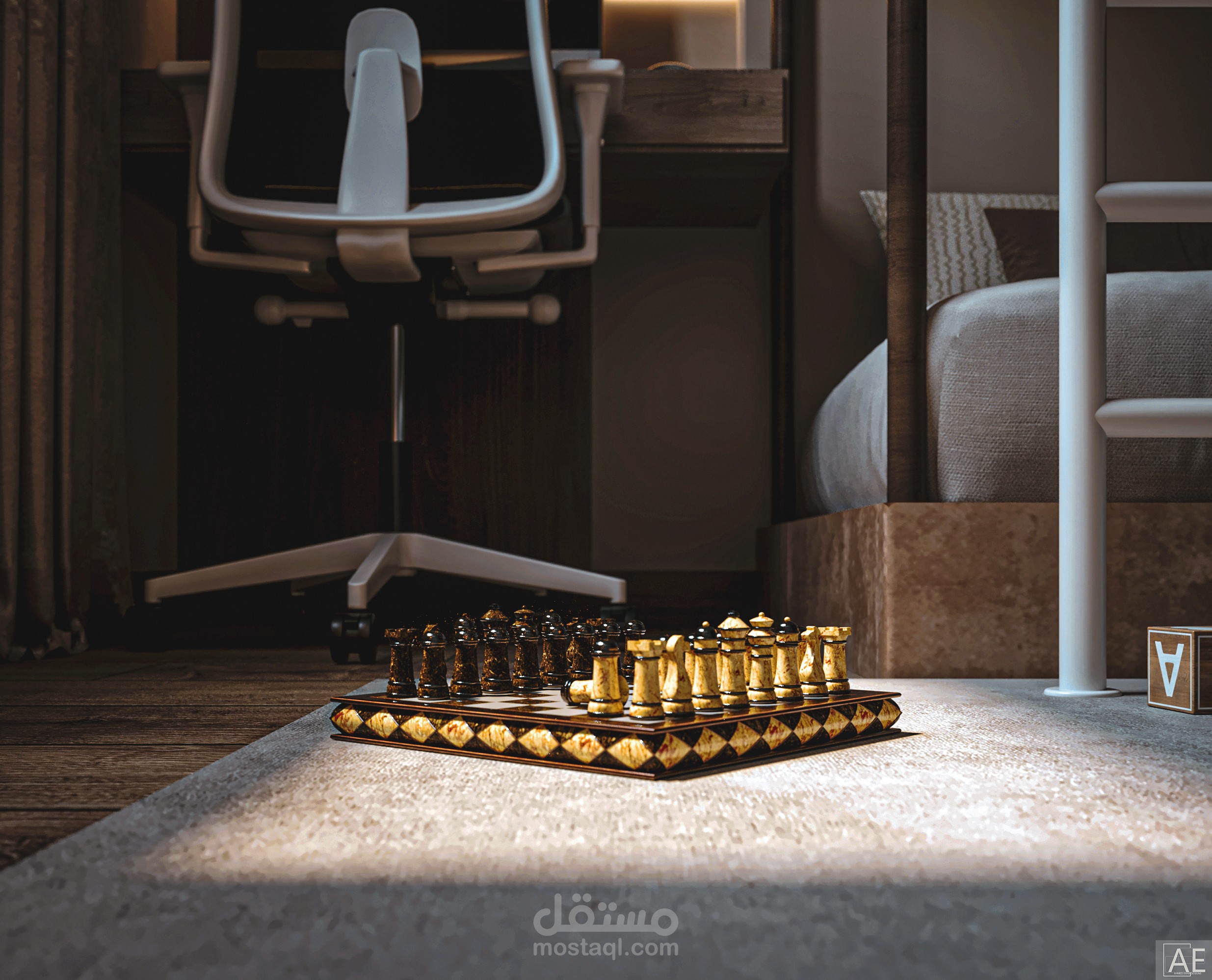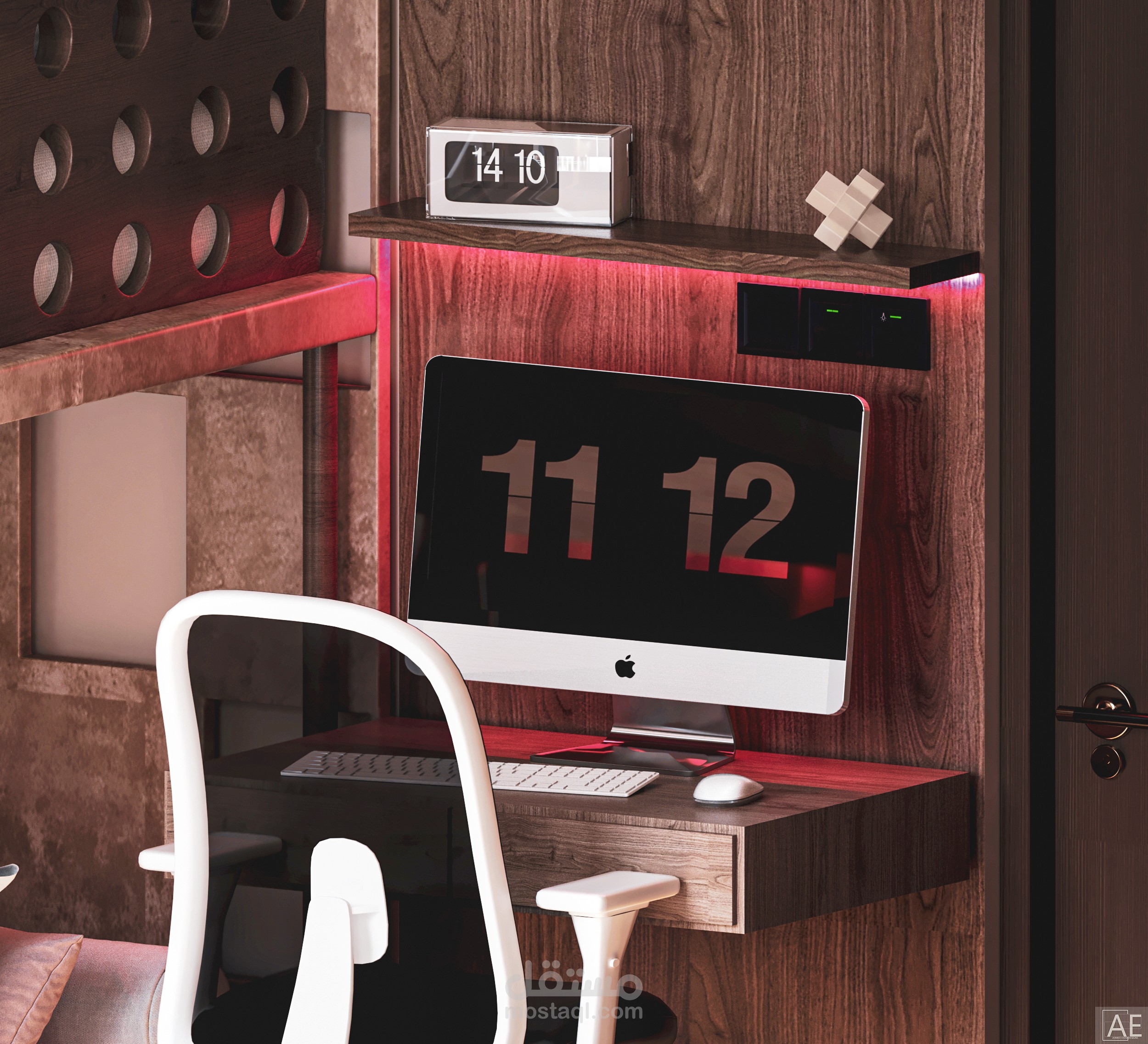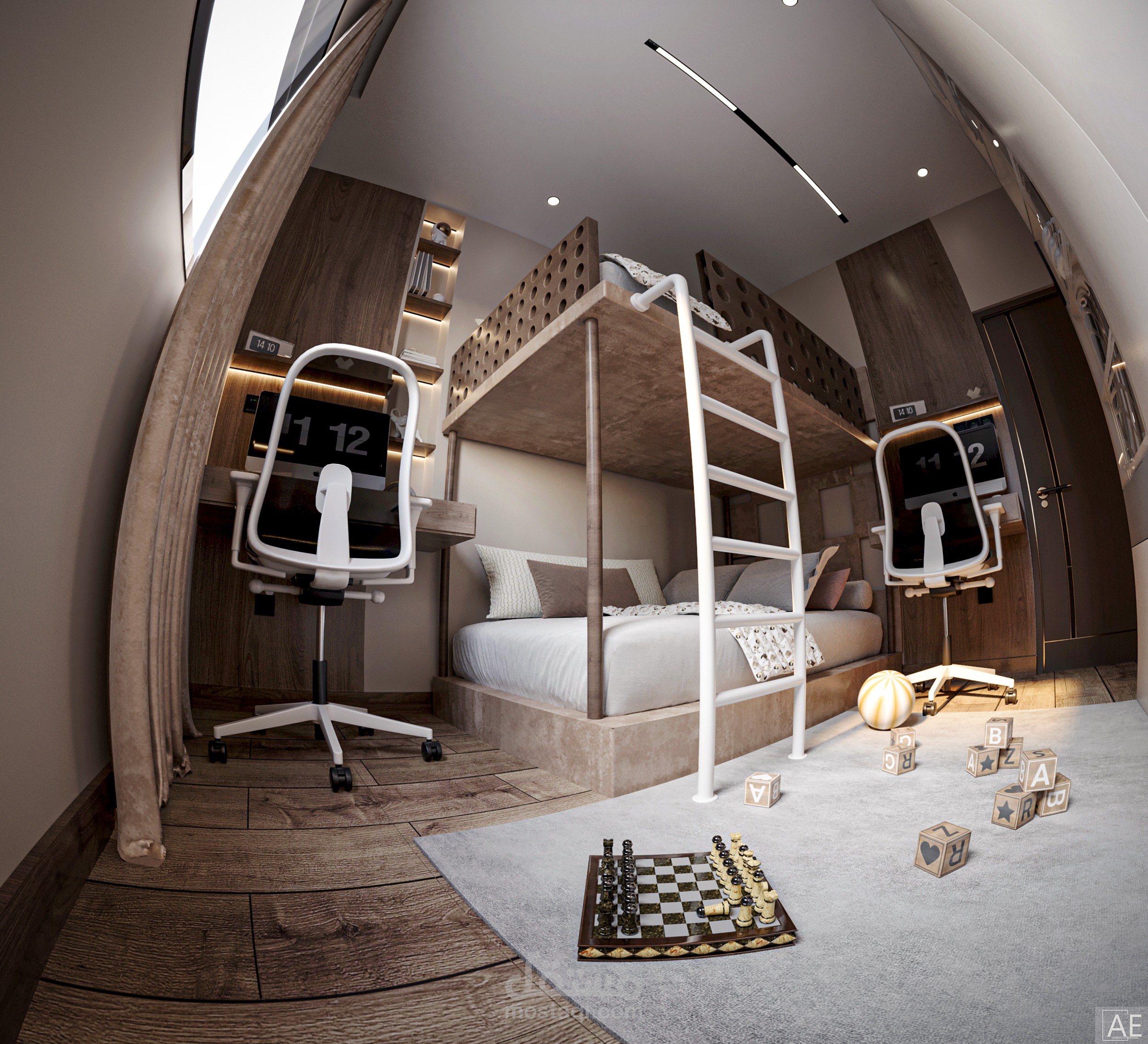 This kids’ bedroom blends functionality with comfort..featuring cozy bunk beds, a smart study corner, and playful details.