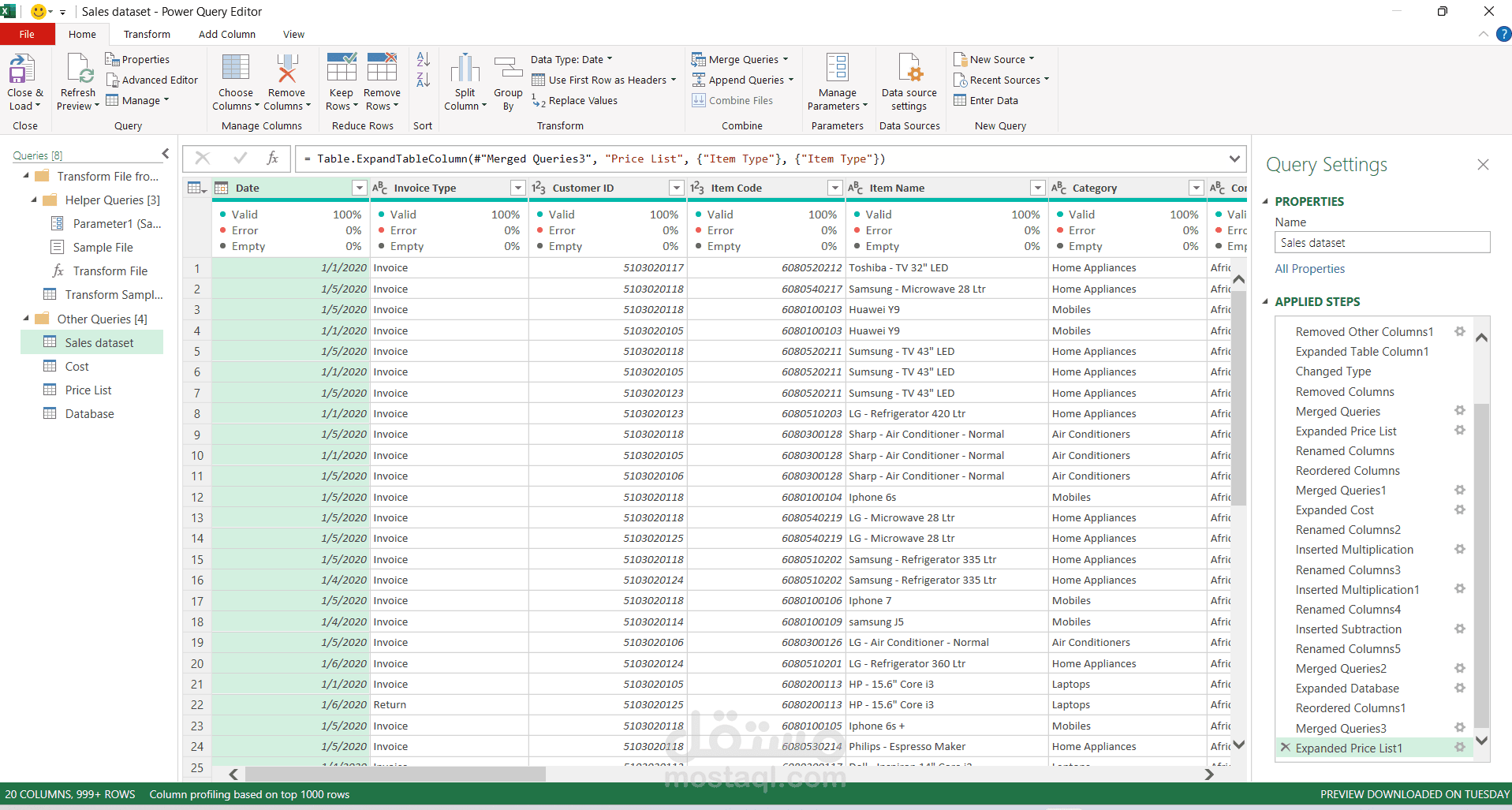 أجريت عمليات Merge Queries لربط المبيعات بالأسعار والتكاليف بناءً على مفاتيح الربط (Keys).