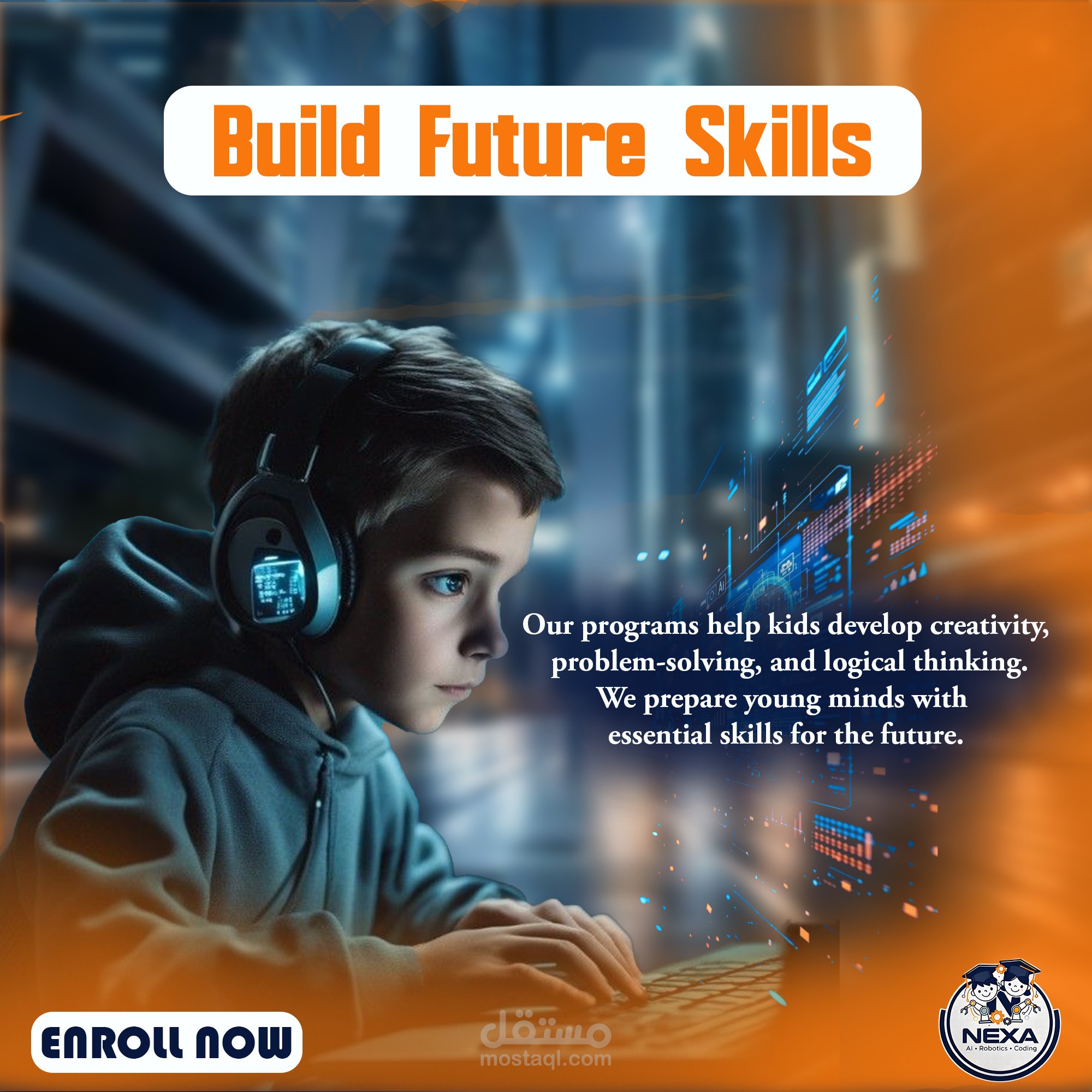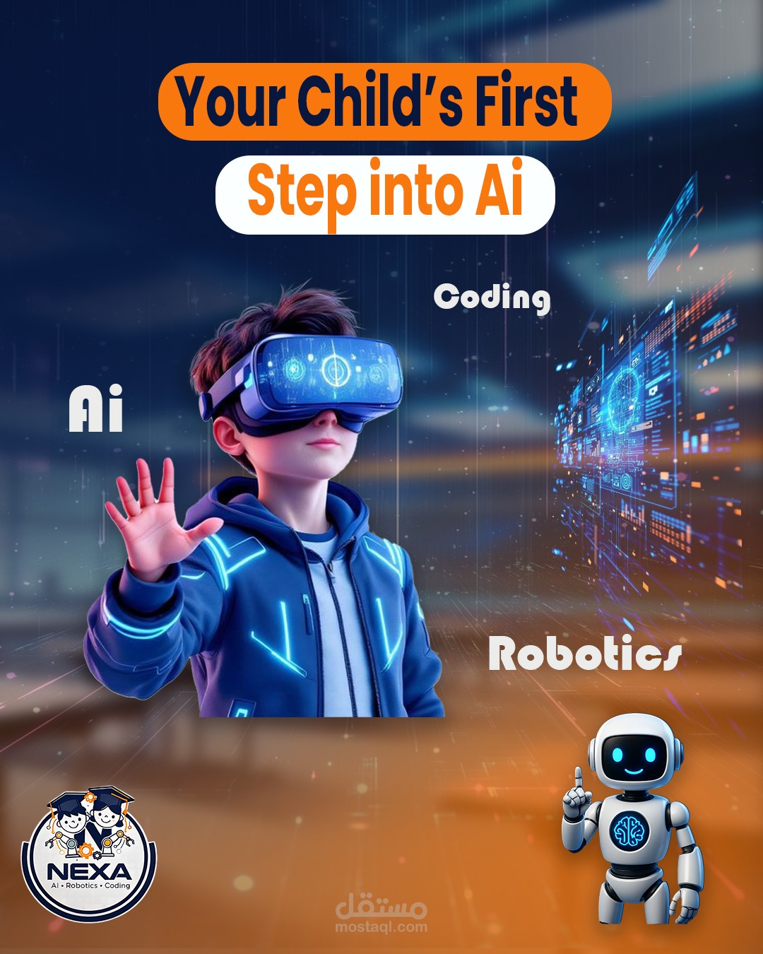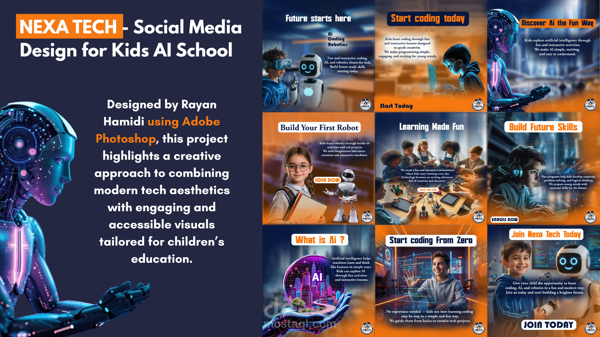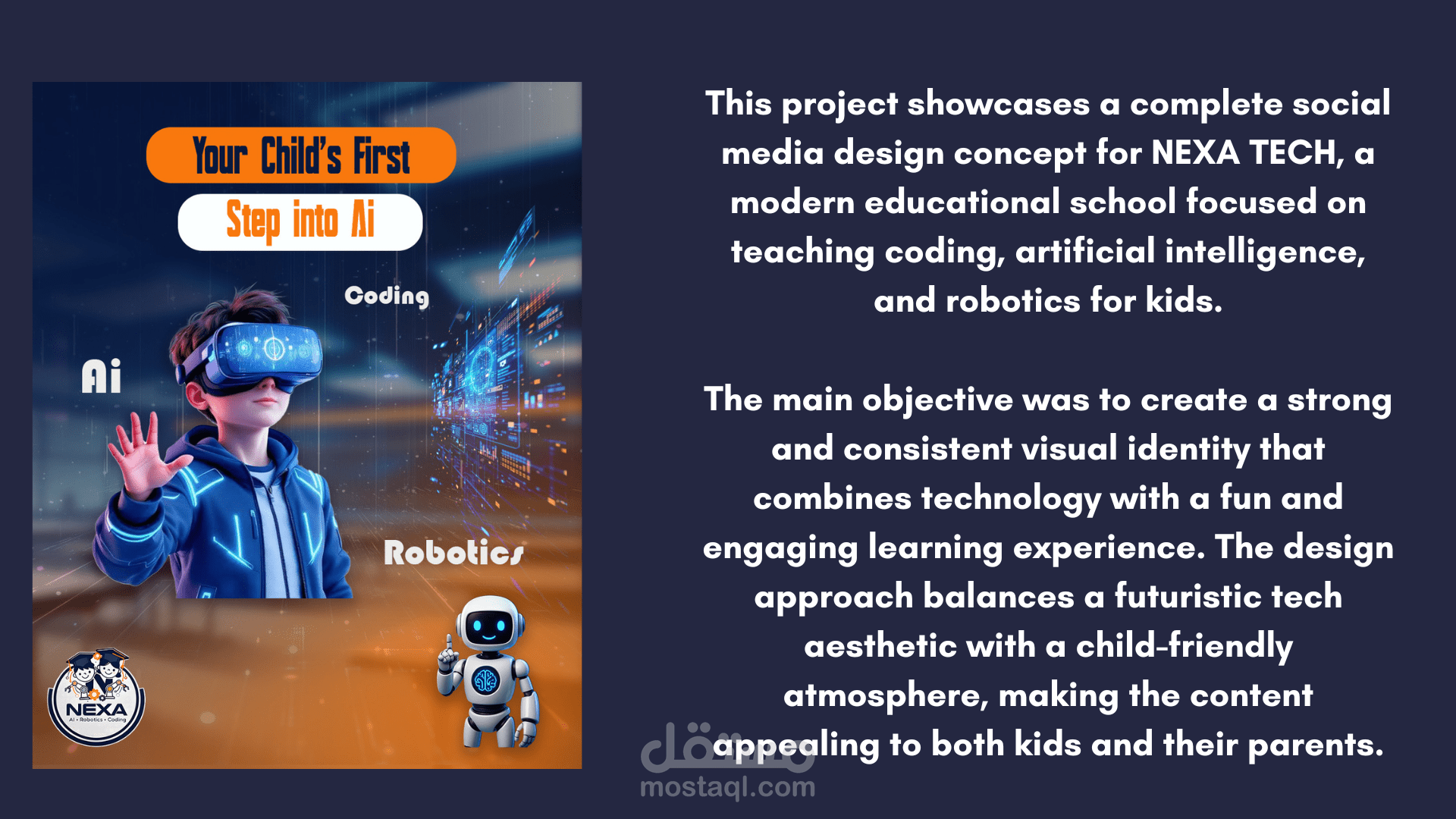 كان الهدف هو ابتكار هوية بصرية جذابة وعصرية، تجمع بين أسلوب تقني مستقبلي وبيئة تعليمية سهلة وميسرة للأطفال. صُممت العناصر بعناية فائقة لتناسب الأطفال وأولياء أمورهم على حد سواء، مع مراعاة التوازن بين الإبداع والوضوح.