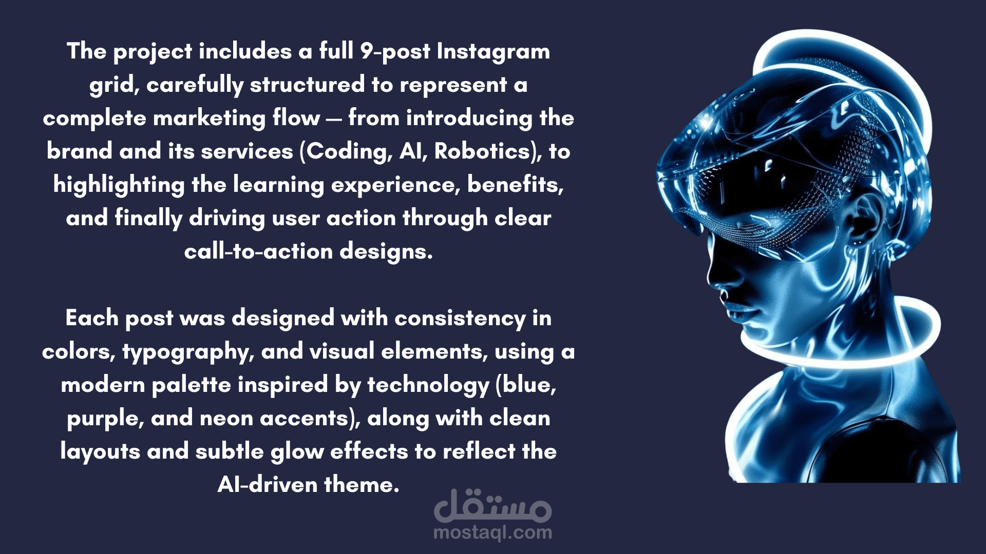 يتضمن المشروع شبكة كاملة من 9 منشورات على إنستغرام، مصممة كرحلة تسويقية متكاملة، تبدأ من التعريف بالعلامة التجارية، مرورًا بتقديم الخدمات الأساسية، وتسليط الضوء على تجربة التعلم وفوائدها، وانتهاءً بدعوات بصرية قوية تحث على اتخاذ إجراء.