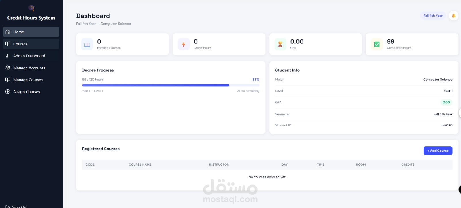 Academic Credit Hours Management System Designed and developed a course registration platform that enables students to efficiently manage their academic schedules within a credit-hour based system. The application enforces prerequisite validation through a locking mechanism, ensuring students can only enroll in courses after completing required prerequisites. The system also integrates a GPA calculator, allowing students to track academic performance and plan their coursework strategically. Key Features: 1-Course registration based on credit hour system 2-Automated prerequisite validation and locking mechanism 3-Integrated GPA calculator 4-Student-friendly academic planning interface