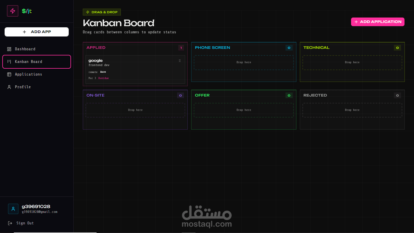 - نقل التقديمات بين المراحل (Applied → Interview → Offer → Rejected)