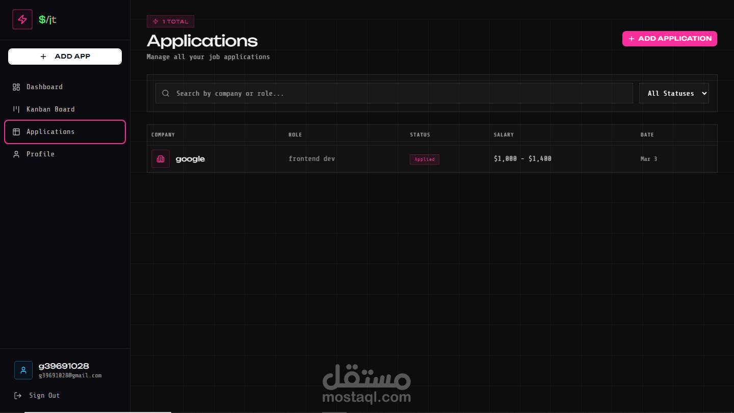 - جدول التقديمات (applications) مع حقول: المسمى الوظيفي، الشركة، الراتب، الحالة، الملاحظات