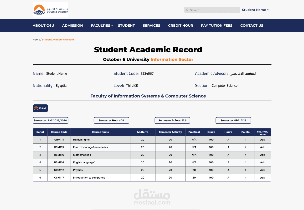 تصميم واجهات وتجربة مستخدم لصفحة هبوط خاصة بجامعة 6 أكتوبر (O6U) يركز على تقديم معلومات واضحة وجذابة للطلاب بشكل منظم وسهل التصفح. يهدف التصميم إلى إبراز هوية الجامعة وعرض أهم الأقسام والخدمات بطريقة احترافية تشجع المستخدم على التفاعل والاستكشاف.