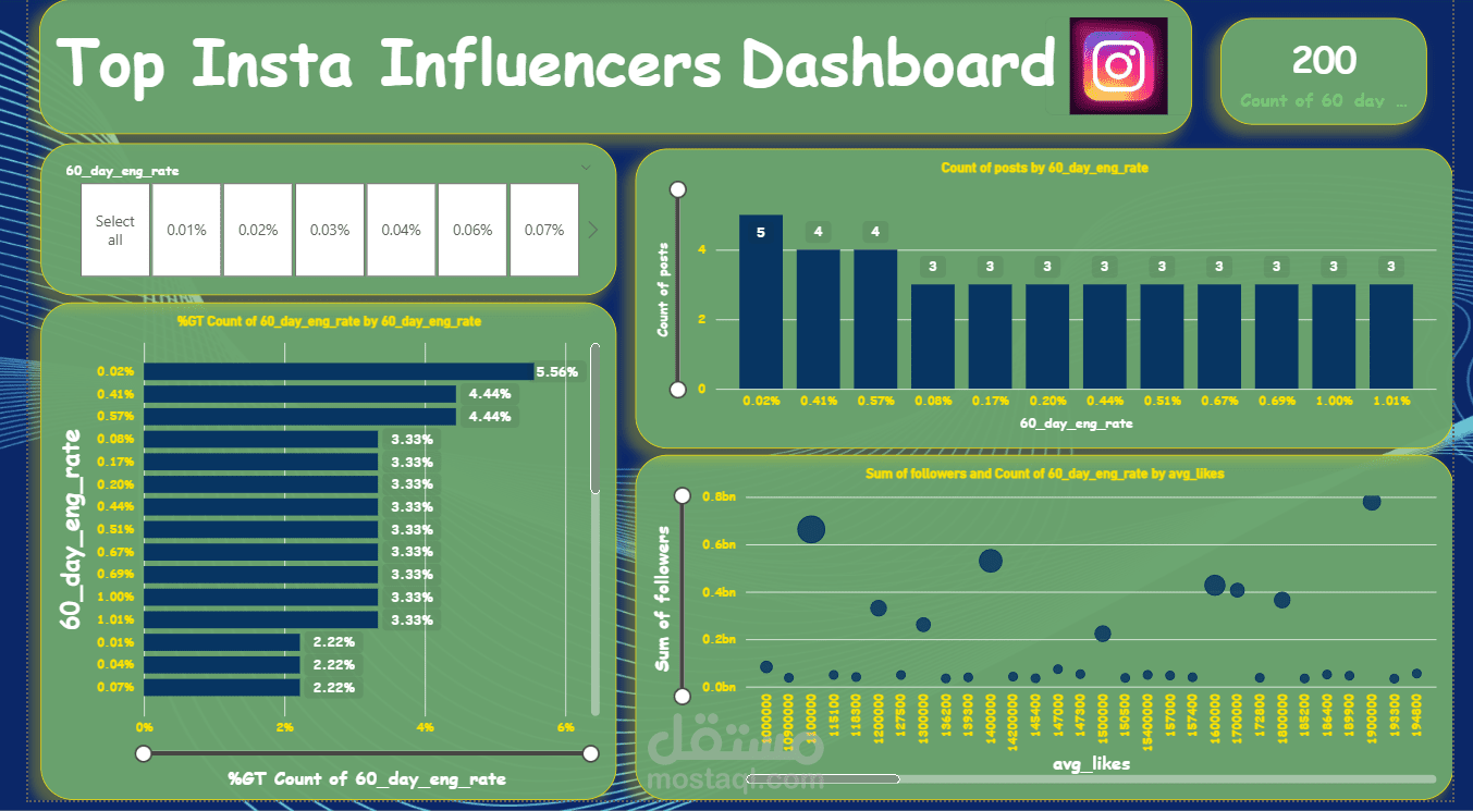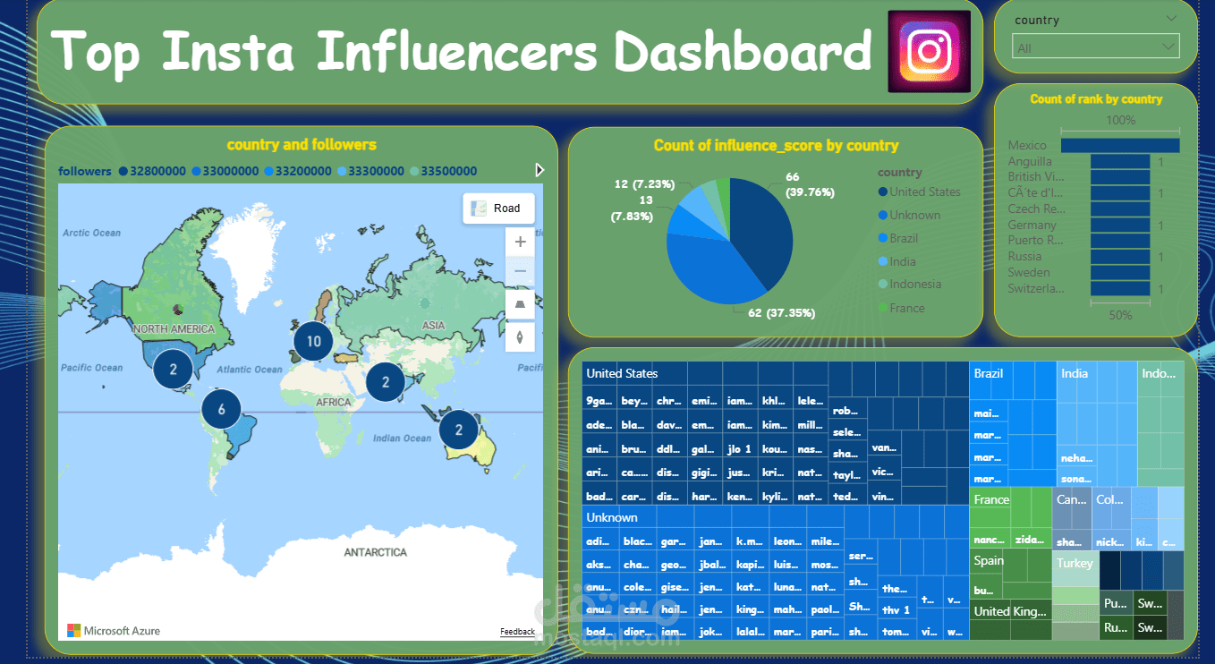 Interactive Power BI dashboard analyzing top Instagram influencers — follower counts, engagement rates, country distribution, and category breakdowns to surface actionable social media insights.
