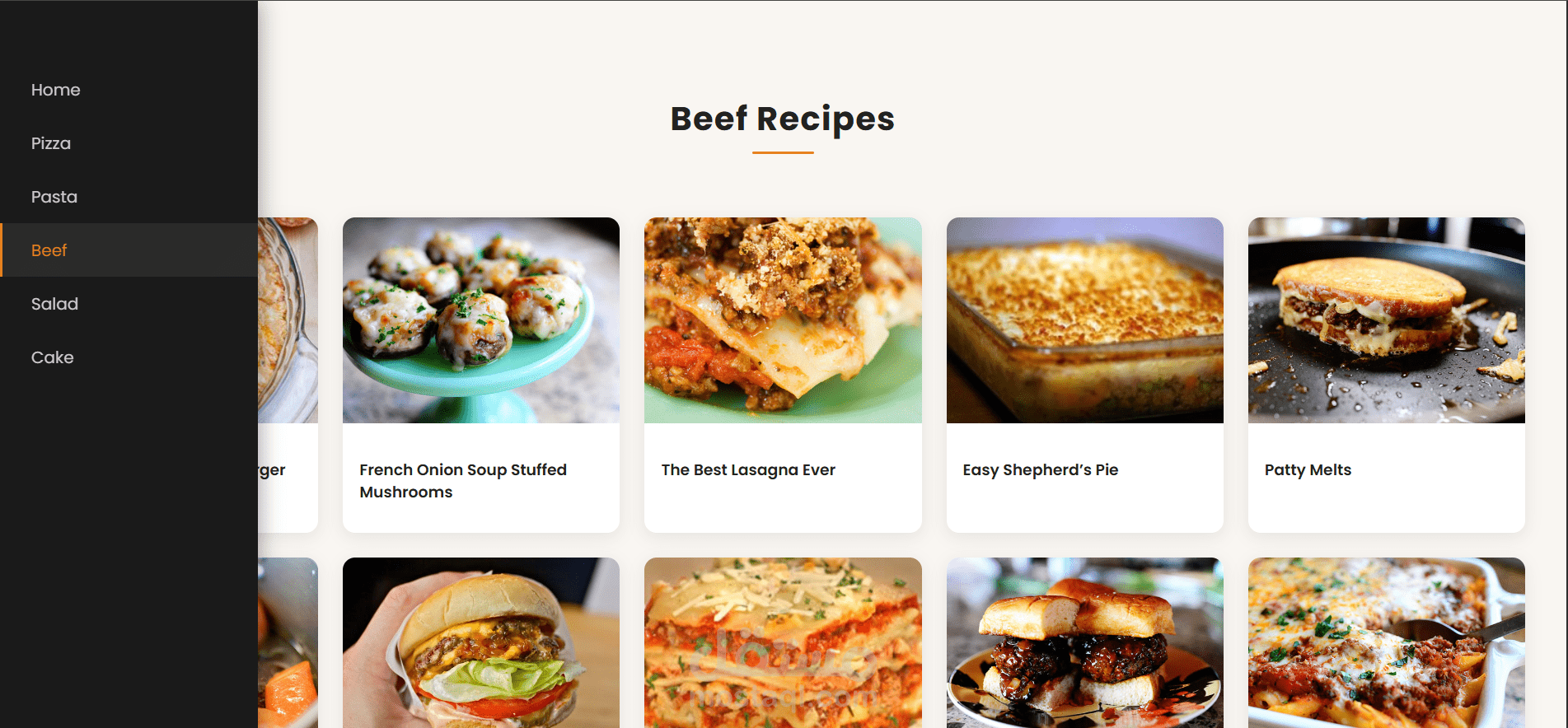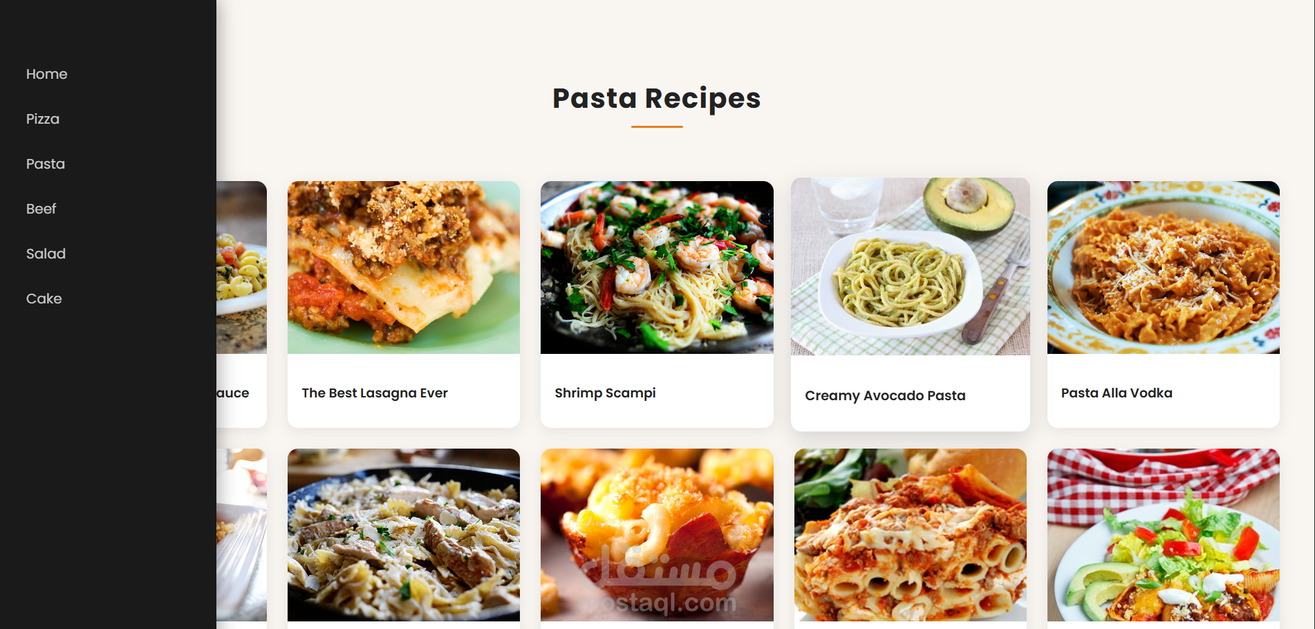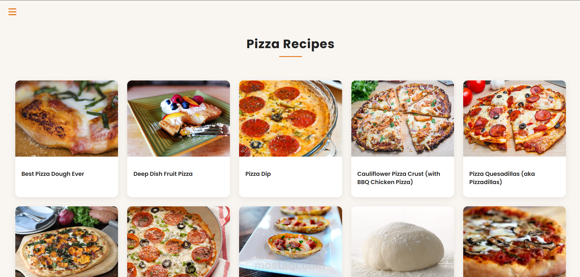 تطبيق ويب لاستعراض الوصفات الغذائية مبني بـ HTML, CSS, وJavaScript، يعتمد على جلب البيانات من API خارجي بشكل ديناميكي. يعرض التطبيق أصناف متعددة من الأكل مثل البيتزا والمعكرونة واللحوم والسلطات والحلويات، مع صفحة تفصيلية لكل وصفة تتضمن المكونات وطريقة التحضير. تم تنظيم الكود على شكل ملفات منفصلة وتصميم واجهة مستخدم جذابة ومتجاوبة.