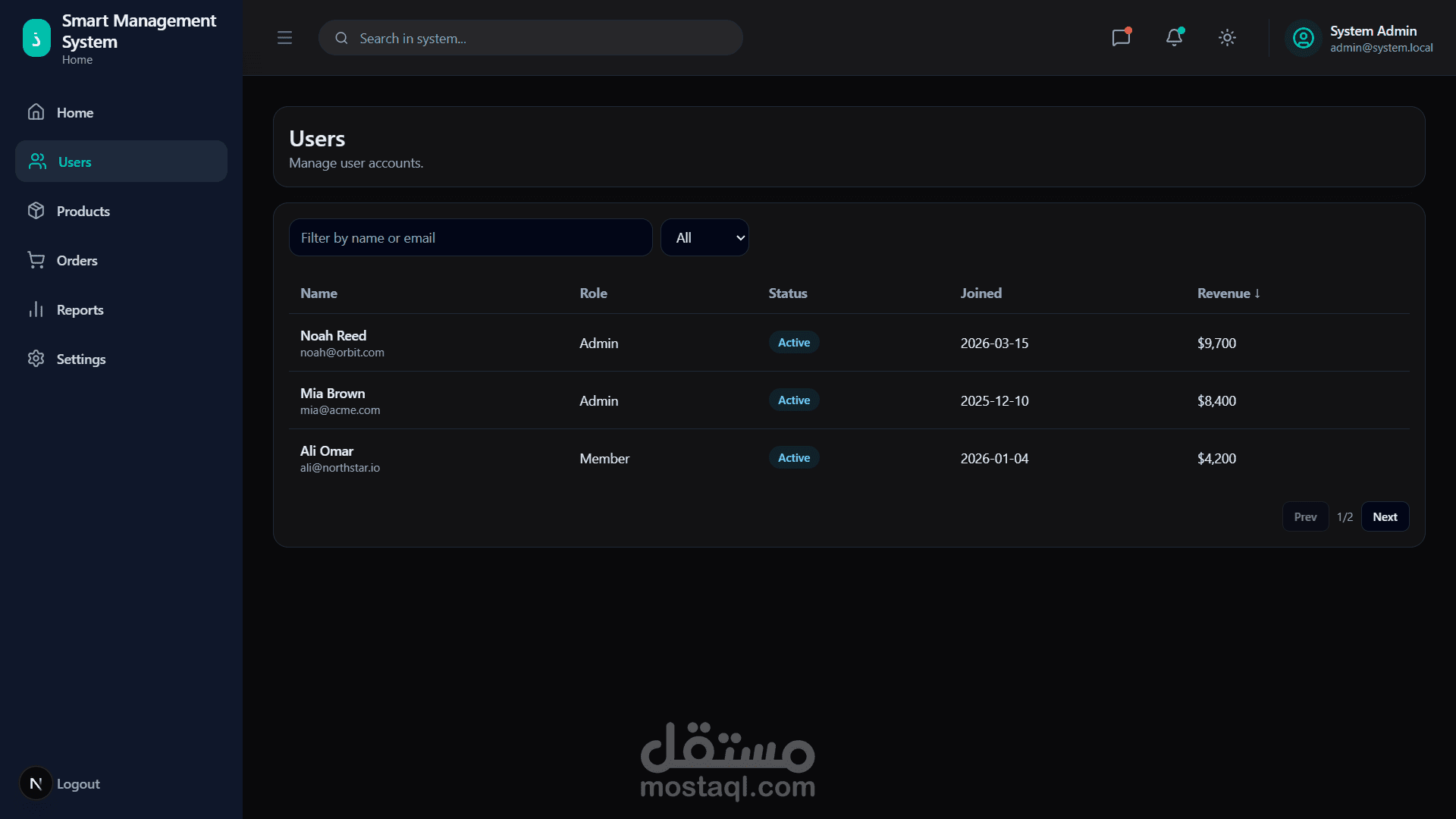 قائمة جانبية (Sidebar) منظمة لإدارة الأقسام: المستخدمين، المنتجات، الطلبات، التقارير، والإعدادات.