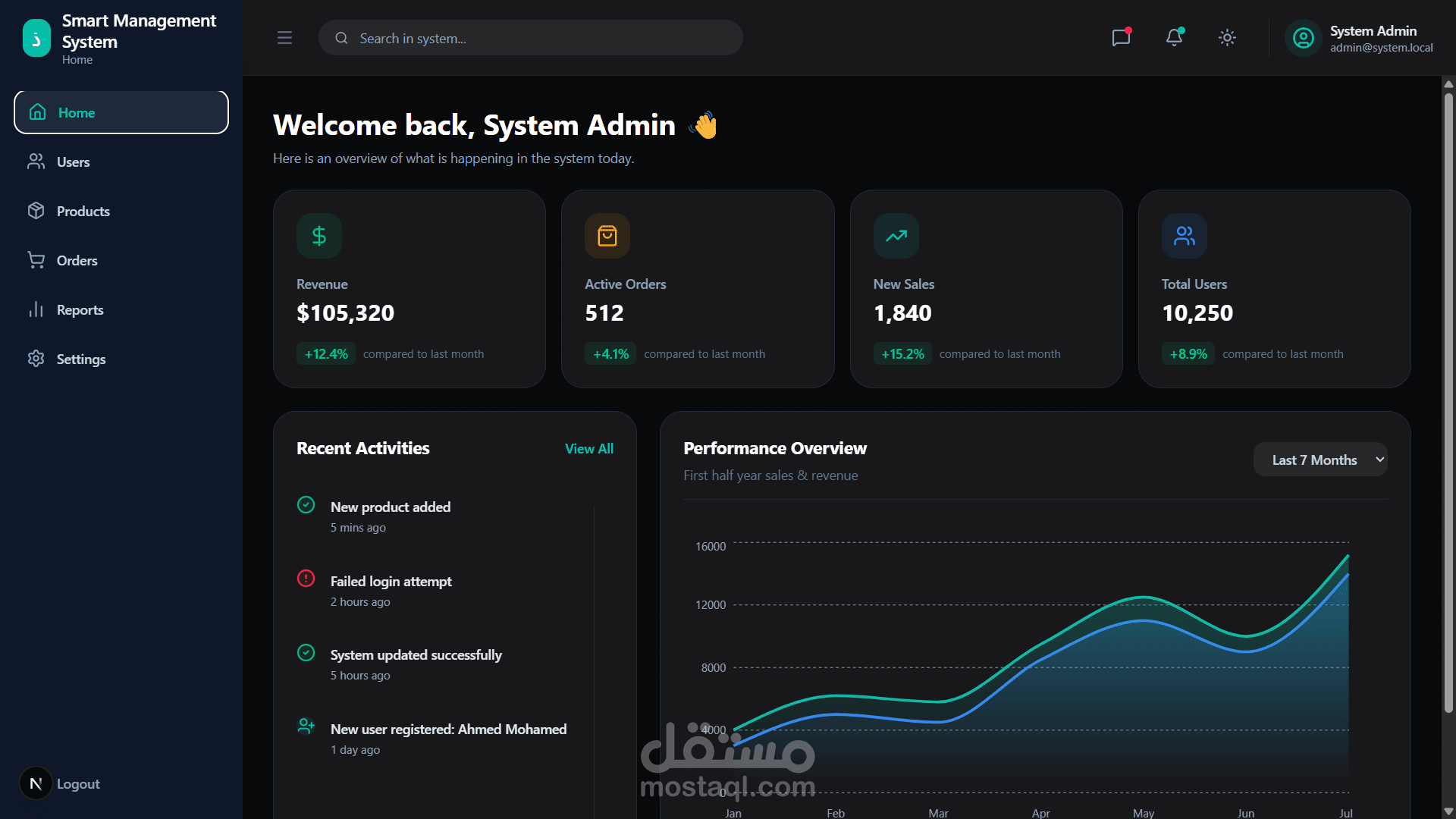ر لوحة تحكم احترافية لنظام إدارة متكامل، تركز على تقديم تجربة مستخدم سلسة مع واجهة عصرية (Modern Dark UI) تسهّل متابعة أداء النظام واتخاذ القرارات بسرعة.