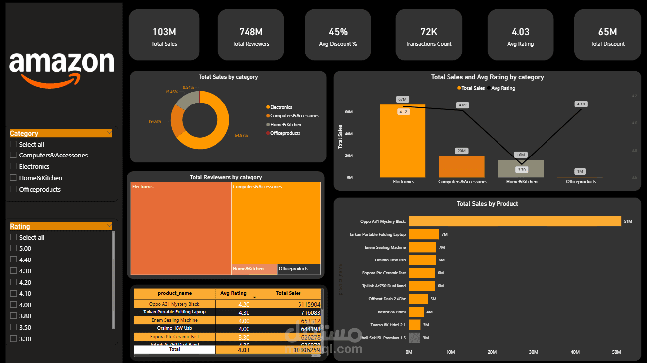 تم انشاء أكثر من 10 مقاييس (Measures) باستخدام DAX لحساب مؤشرات الأداء الرئيسية مثل إجمالي المبيعات، متوسط التقييمات، نسب الخصومات، وتحديد المنتجات الأكثر مبيعًا.