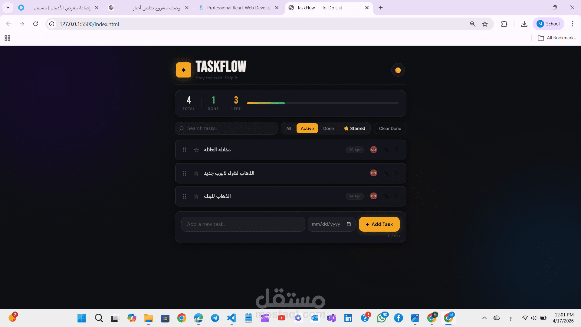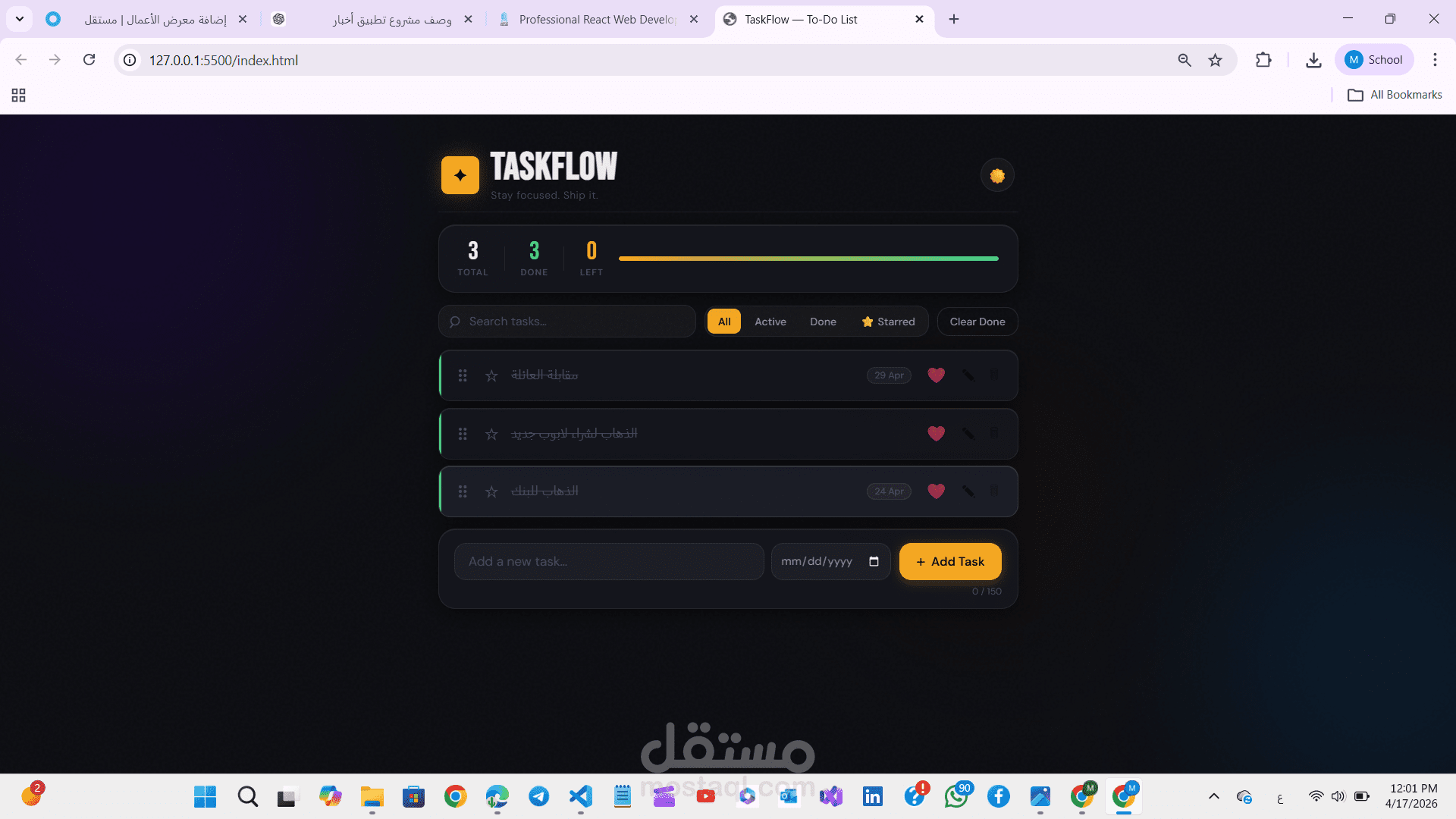 * ➕ **Add Tasks بسهولة**: Users can quickly add new tasks through an input field with validation to prevent empty entries.