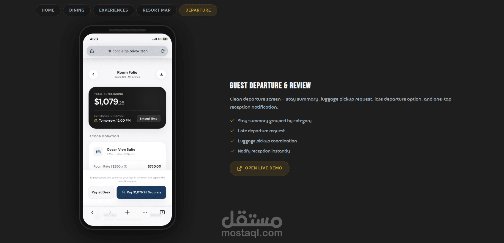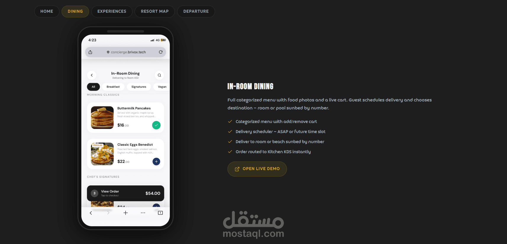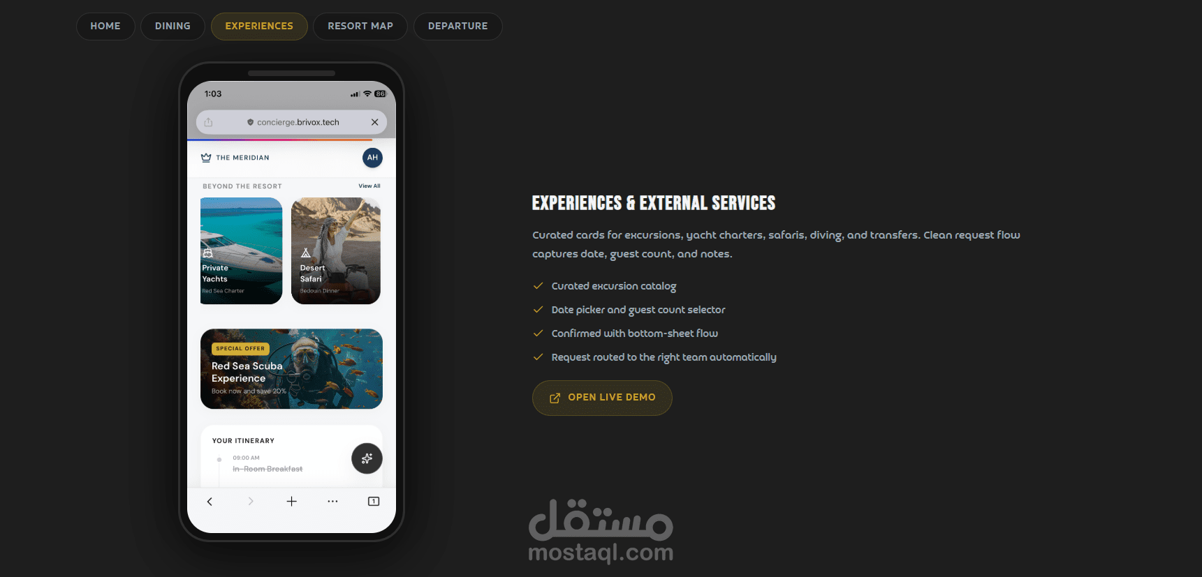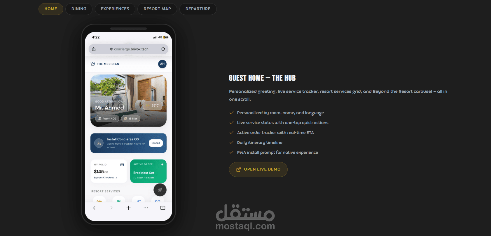 يركز المشروع على تحويل تجربة الضيافة التقليدية إلى تجربة رقمية ذكية، حيث يوفّر النظام AI Concierge يعمل على مدار الساعة لتسهيل التواصل مع الضيوف، إدارة الطلبات، وتقديم خدمات مخصصة بشكل فوري، مما يرفع من جودة الخدمة ويقلل الاعتماد على العمليات اليدوية .
