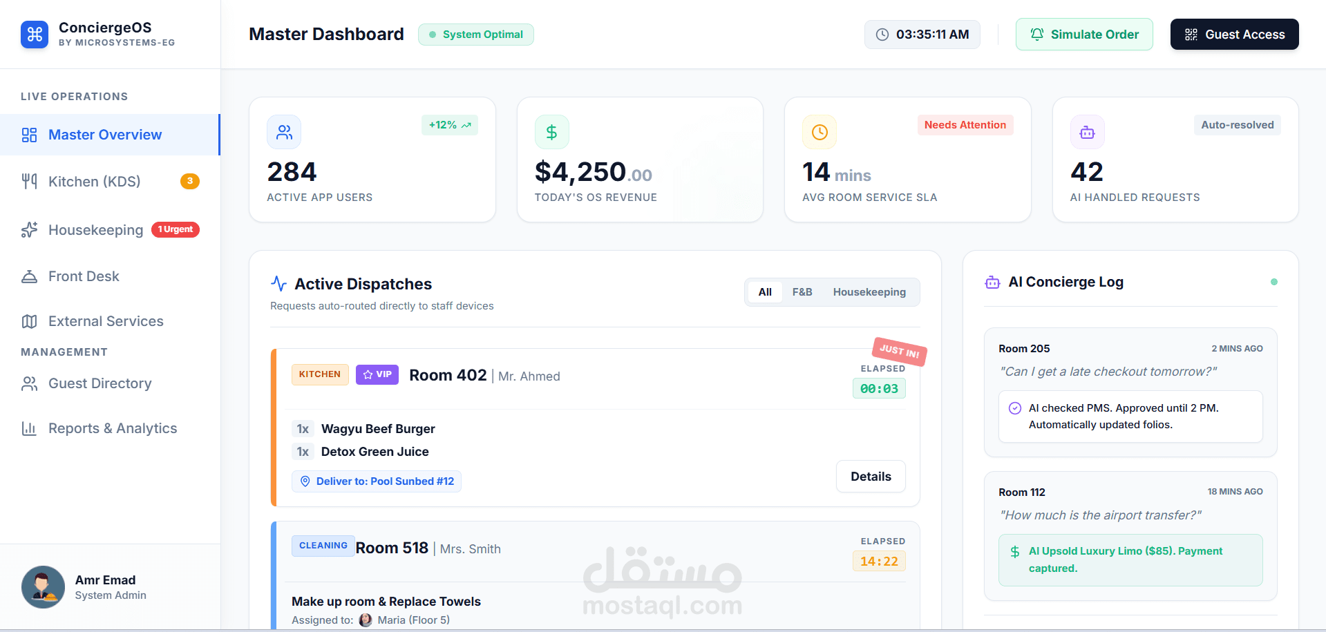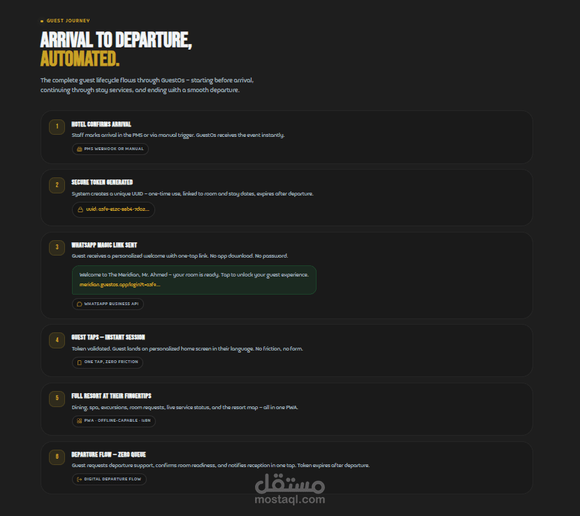 تم تصميم وتطوير منصة Guestos كنظام متكامل لإدارة وتشغيل قطاع الضيافة (Hospitality Ecosystem)، يجمع بين إدارة العمليات، أتمتة الحجوزات، وتحسين تجربة الضيوف من خلال تقنيات حديثة تعتمد على الذكاء الاصطناعي.