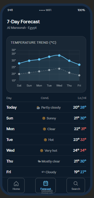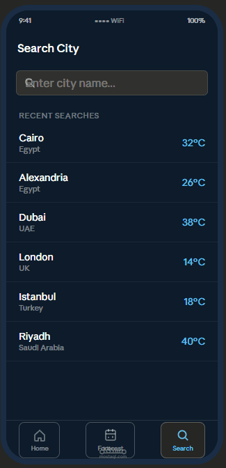 A Flutter weather application that displays real-time weather data using an external API. The app allows users to search for cities and view current weather conditions with a clean and responsive UI.