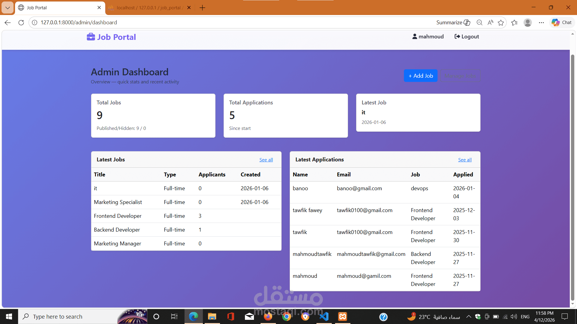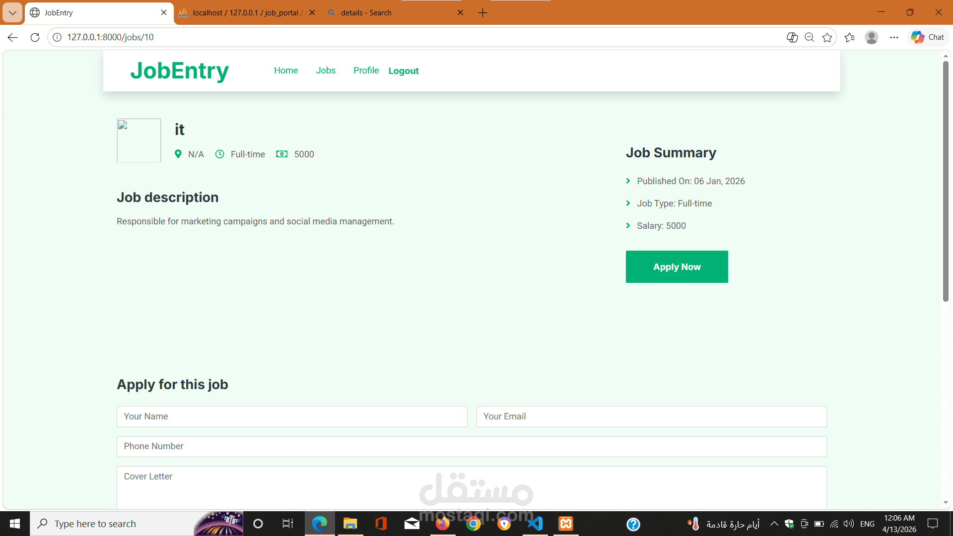 A full-featured Job Portal system built with Laravel that allows employers to post jobs and track applicants efficiently.