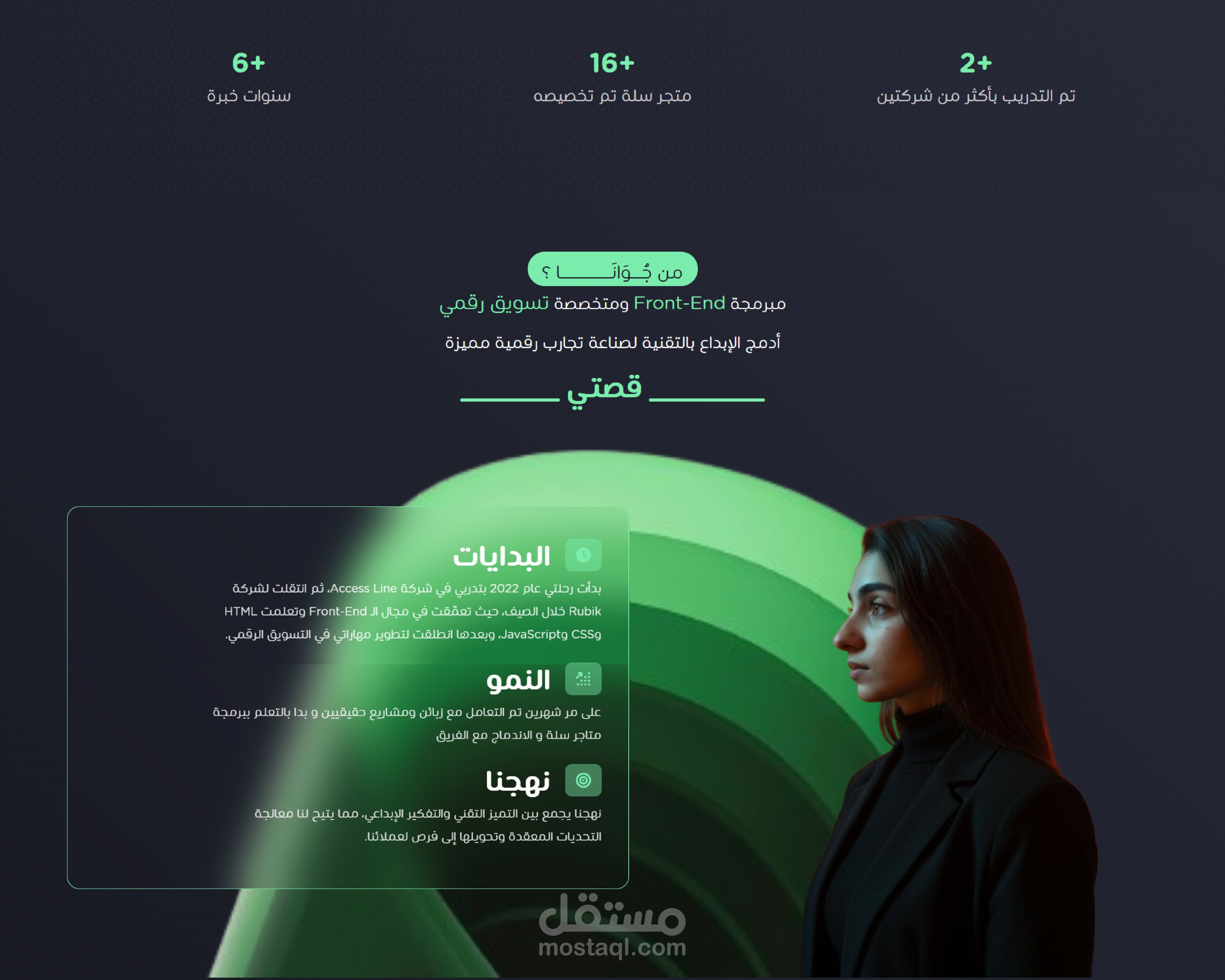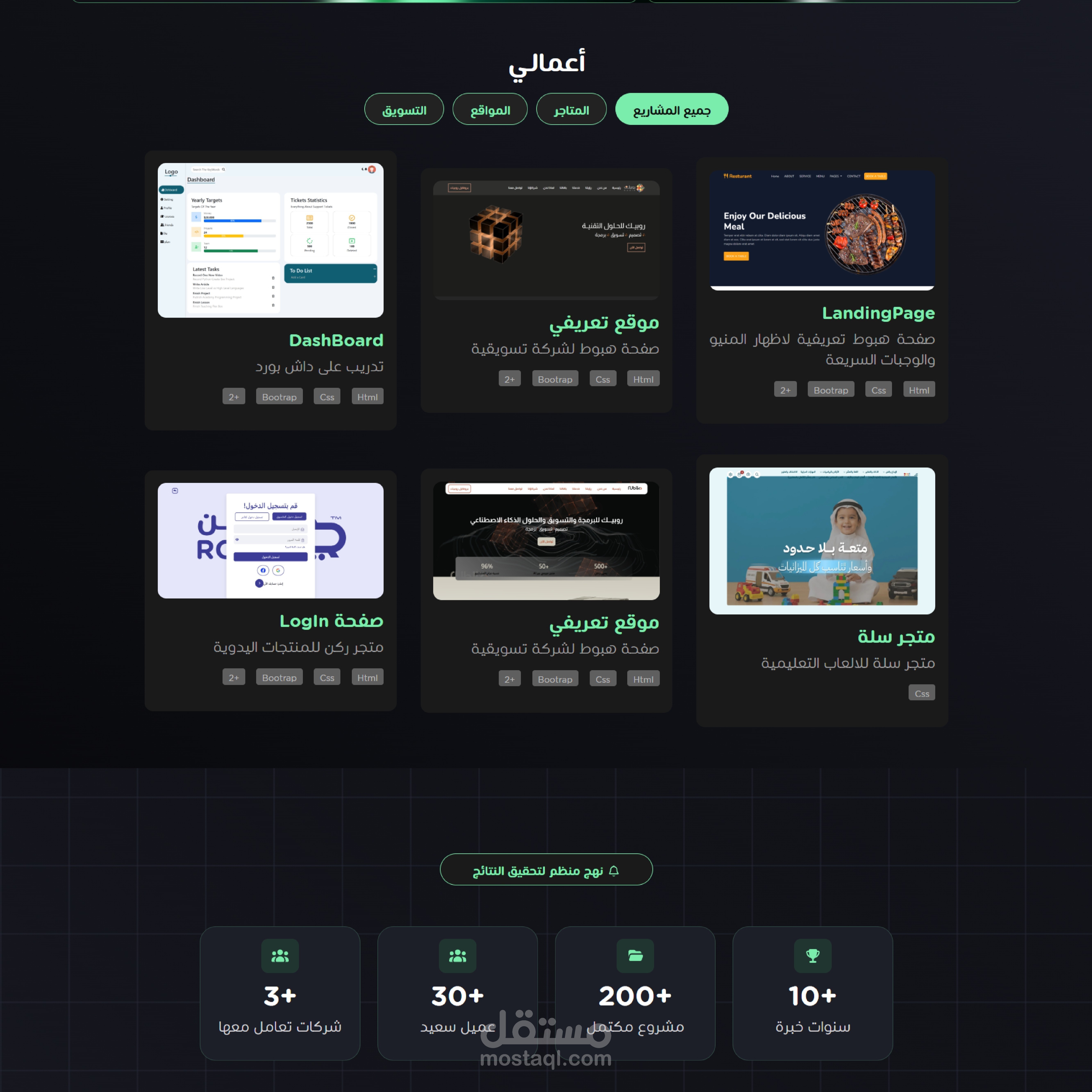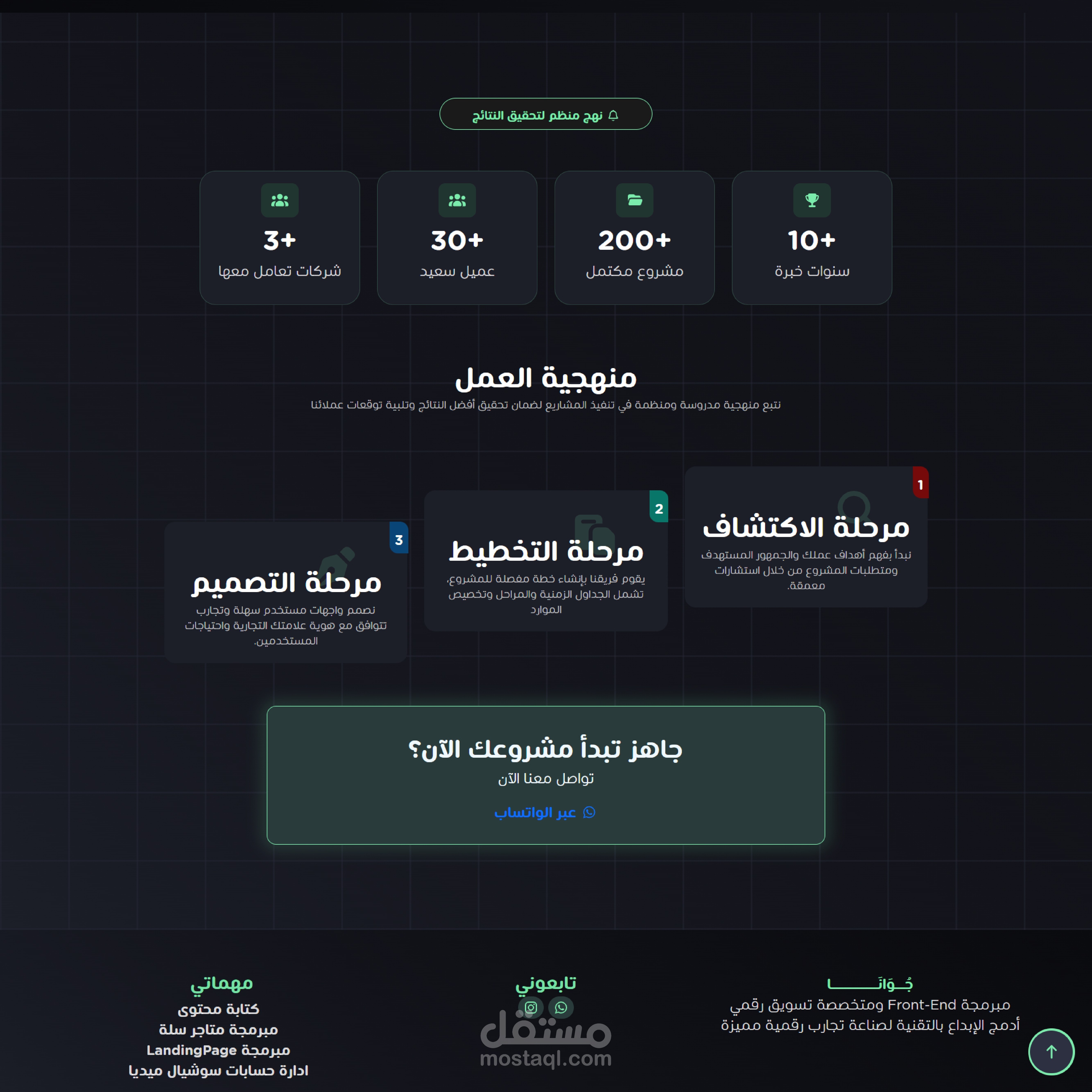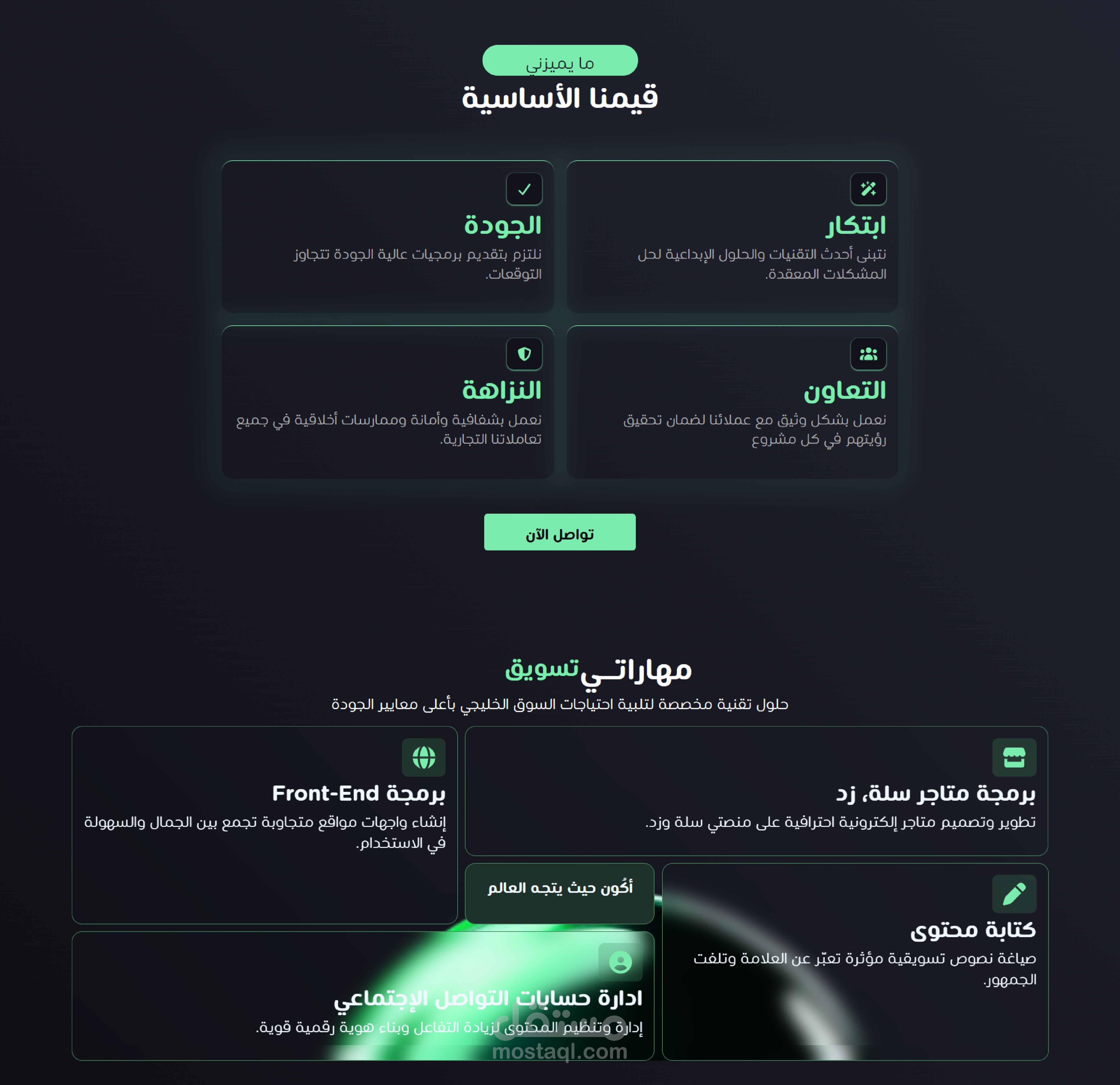 تم تصميم وتطوير موقع تعريفي (Landing Page) احترافي لعرض الخدمات والمهارات في مجال البرمجة والتسويق الرقمي، مع التركيز على تجربة مستخدم جذابة وهوية بصرية حديثة.