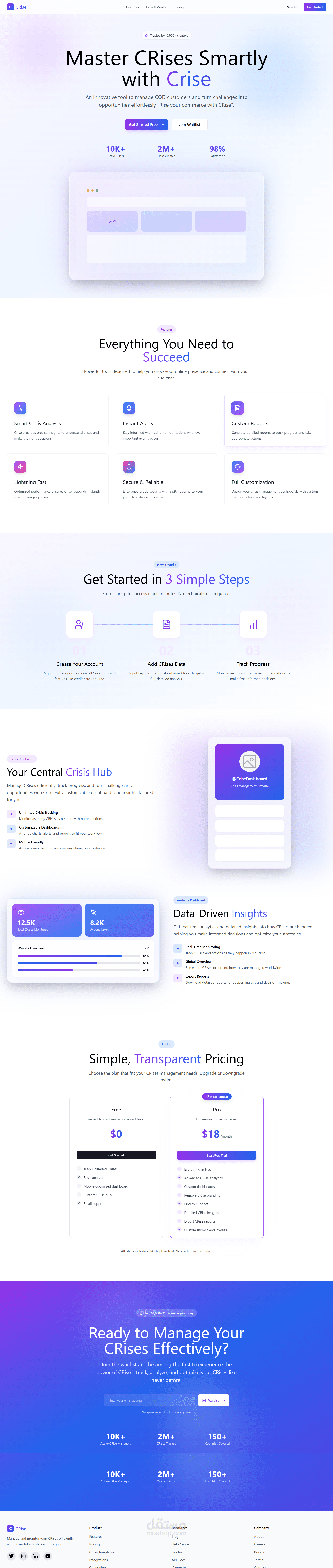 CRise عبارة عن صفحة هبوط حديثة ومتجاوبة (responsive) بالكامل، تم تصميمها بهدف عرض وتقديم خدمة معينة بطريقة احترافية وجذابة.