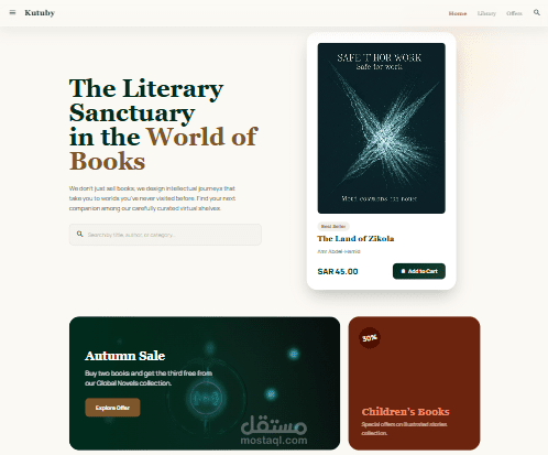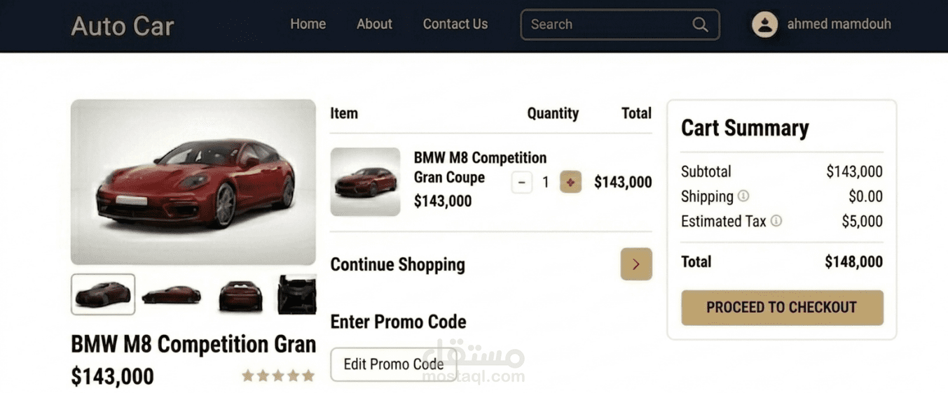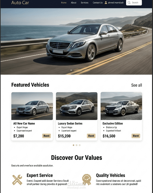 واجهة أمامية جذابة: صفحة هبوط تعرض "السيارات المميزة" ومعلومات عن الشركة، مع واجهة سهلة التنقل.